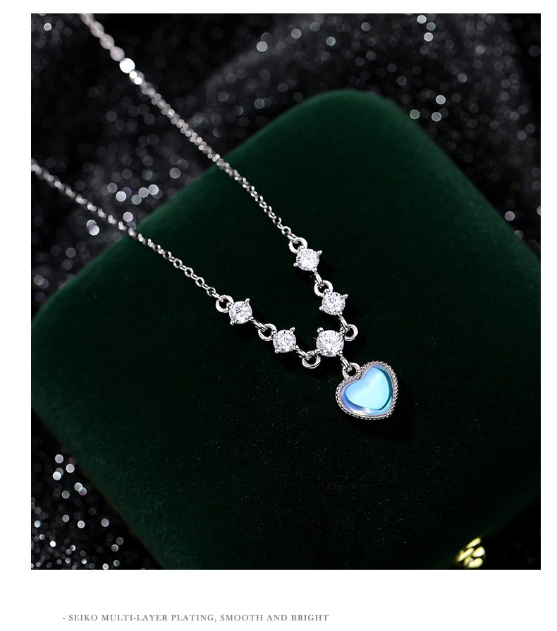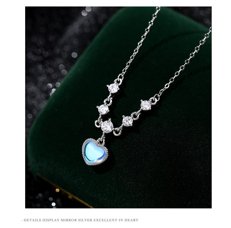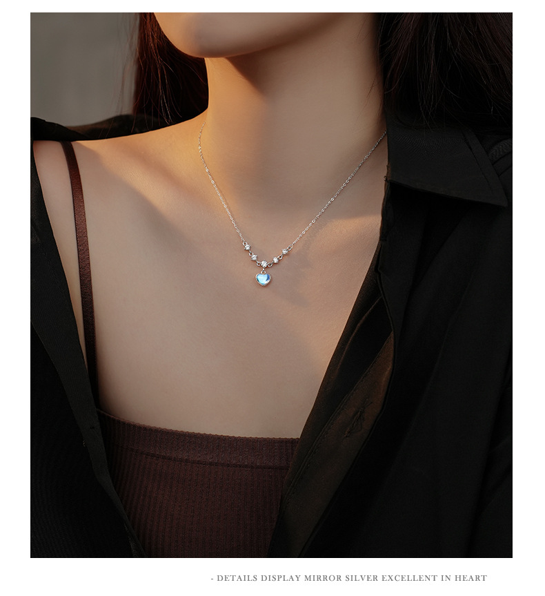 Fleepmart Sterling Silver Inlay White Zircon Imitation Moonstone Heart Pendant Necklace for Women Girl Light Luxury Party Jewelry