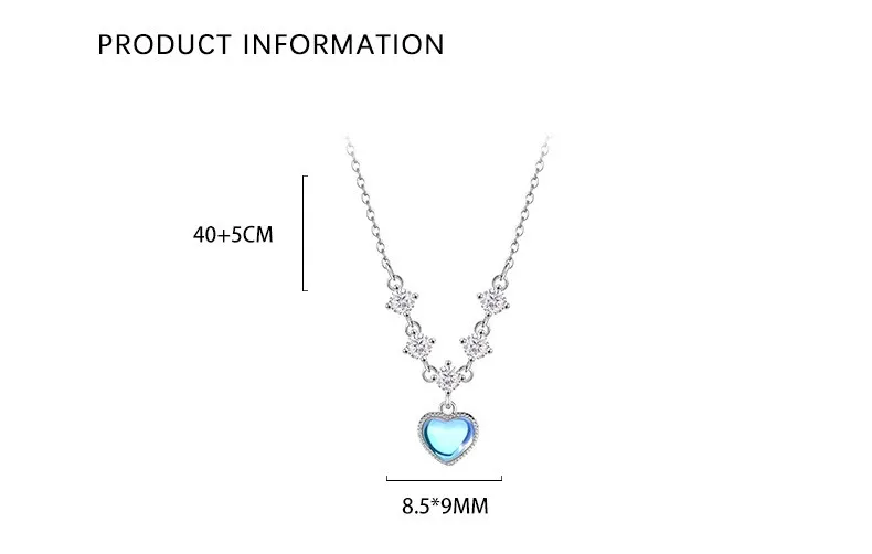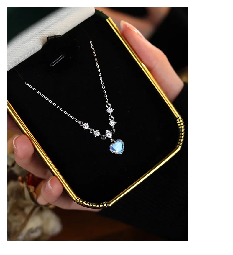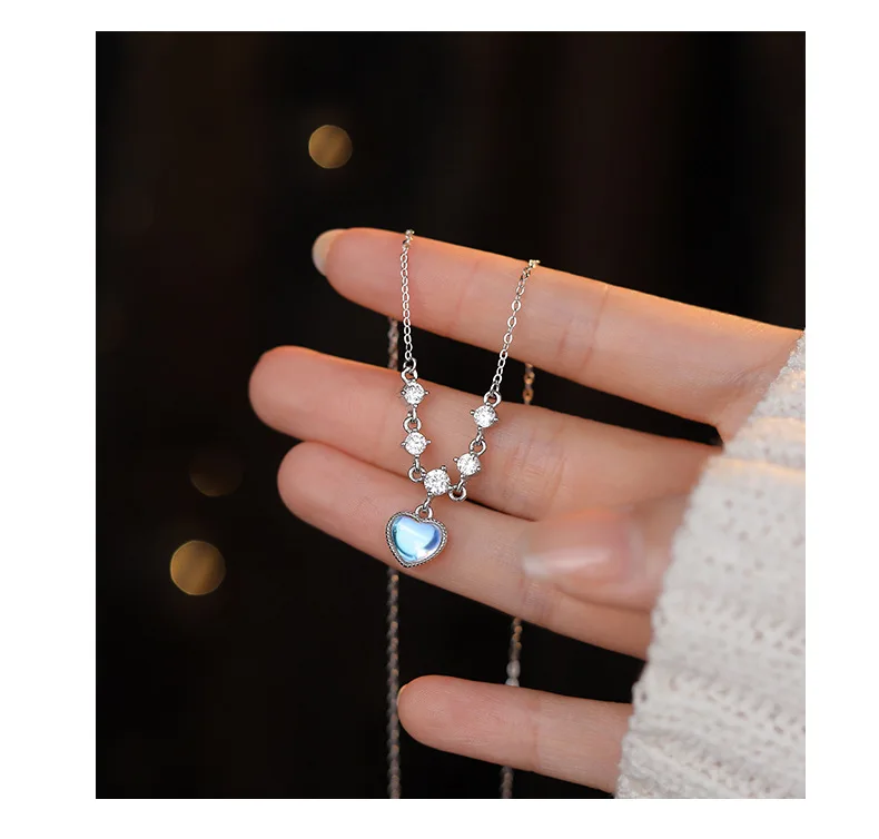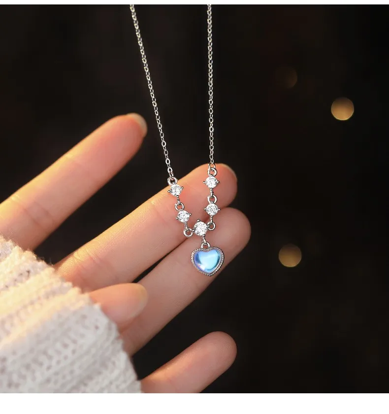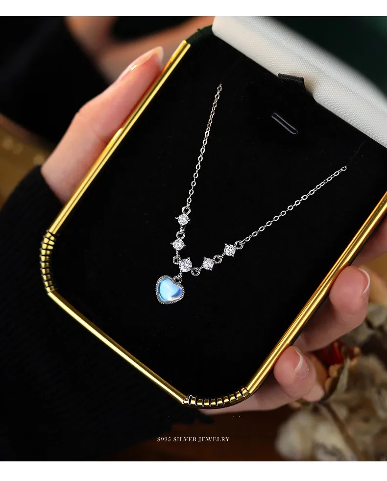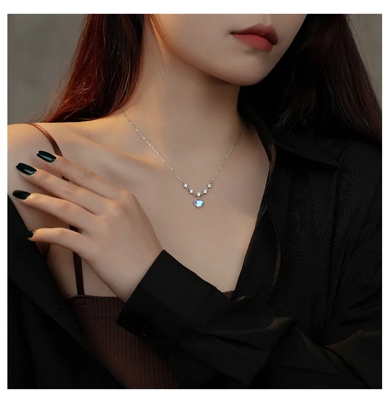 Fleepmart Sterling Silver Inlay White Zircon Imitation Moonstone Heart Pendant Necklace for Women Girl Light Luxury Party Jewelry