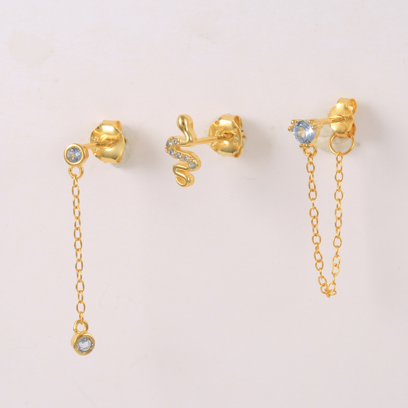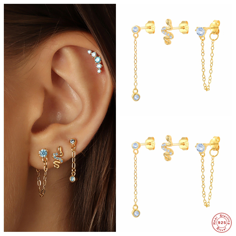 Fleepmart Sterling Silver Round Blue Zircons Charm Long Chain Tassel Dangle Earrings Mini Crystal Snake Stud Front Back Earrings