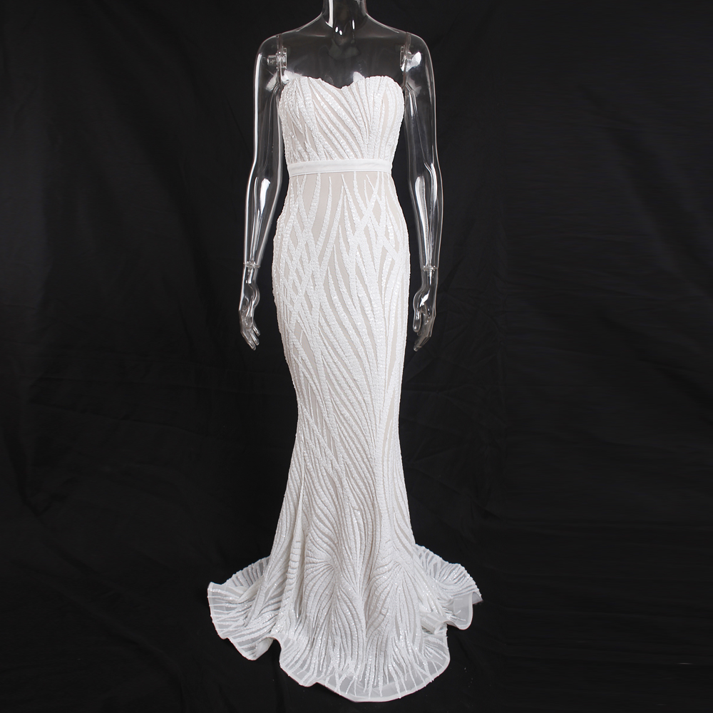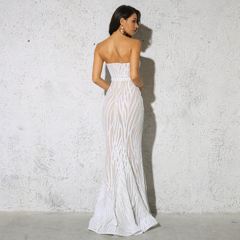 Fleepmart Strapless Sequined White Maxi Dress Sleeveless Stretch Floor Length Evening Party Dress