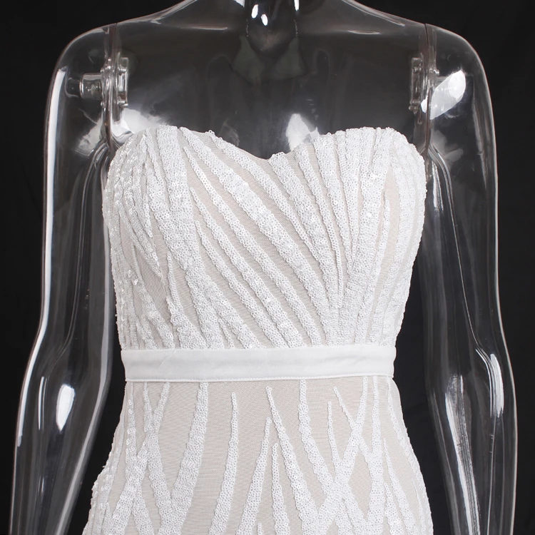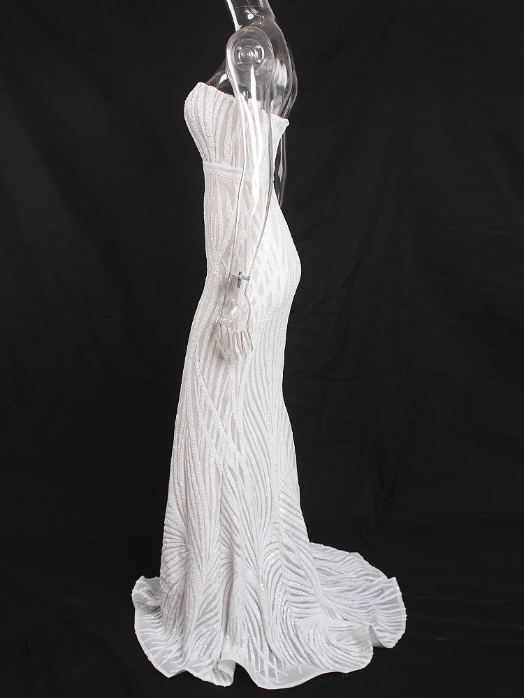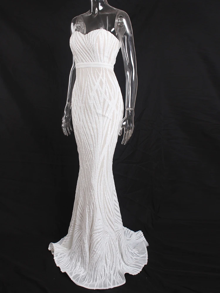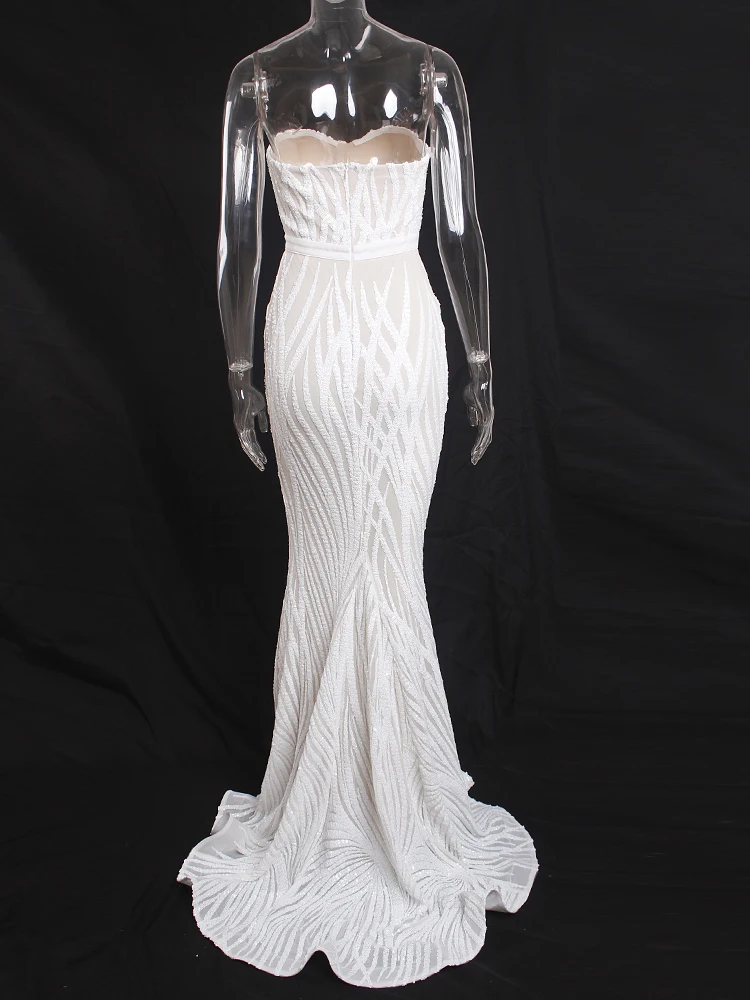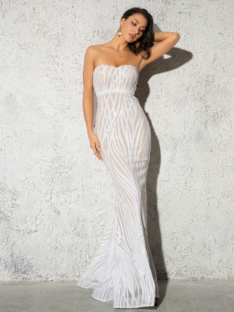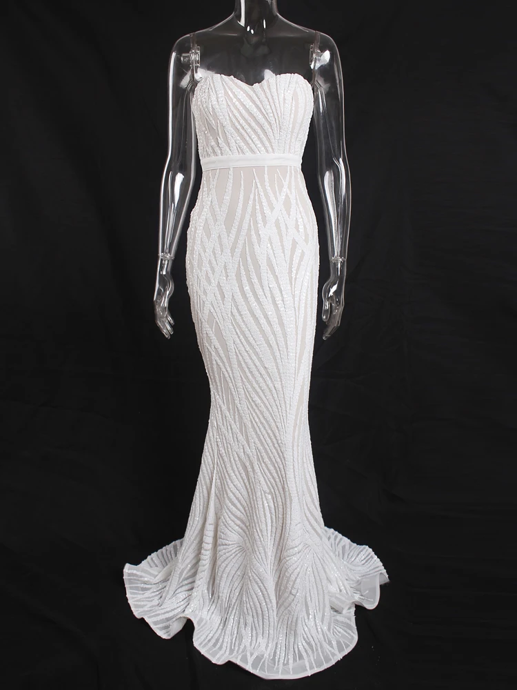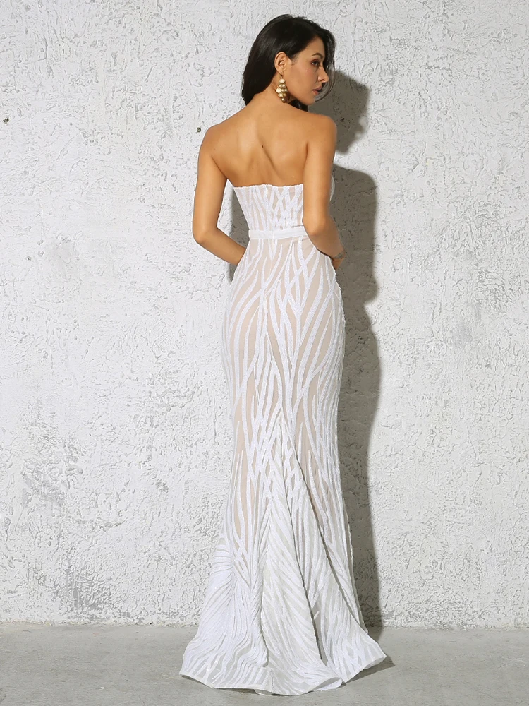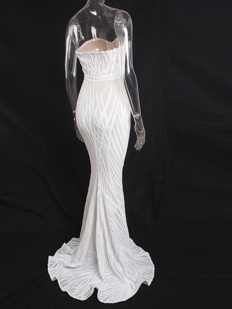 Fleepmart Strapless Sequined White Maxi Dress Sleeveless Stretch Floor Length Evening Party Dress