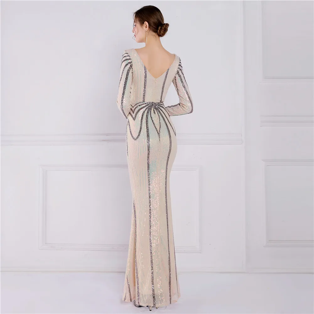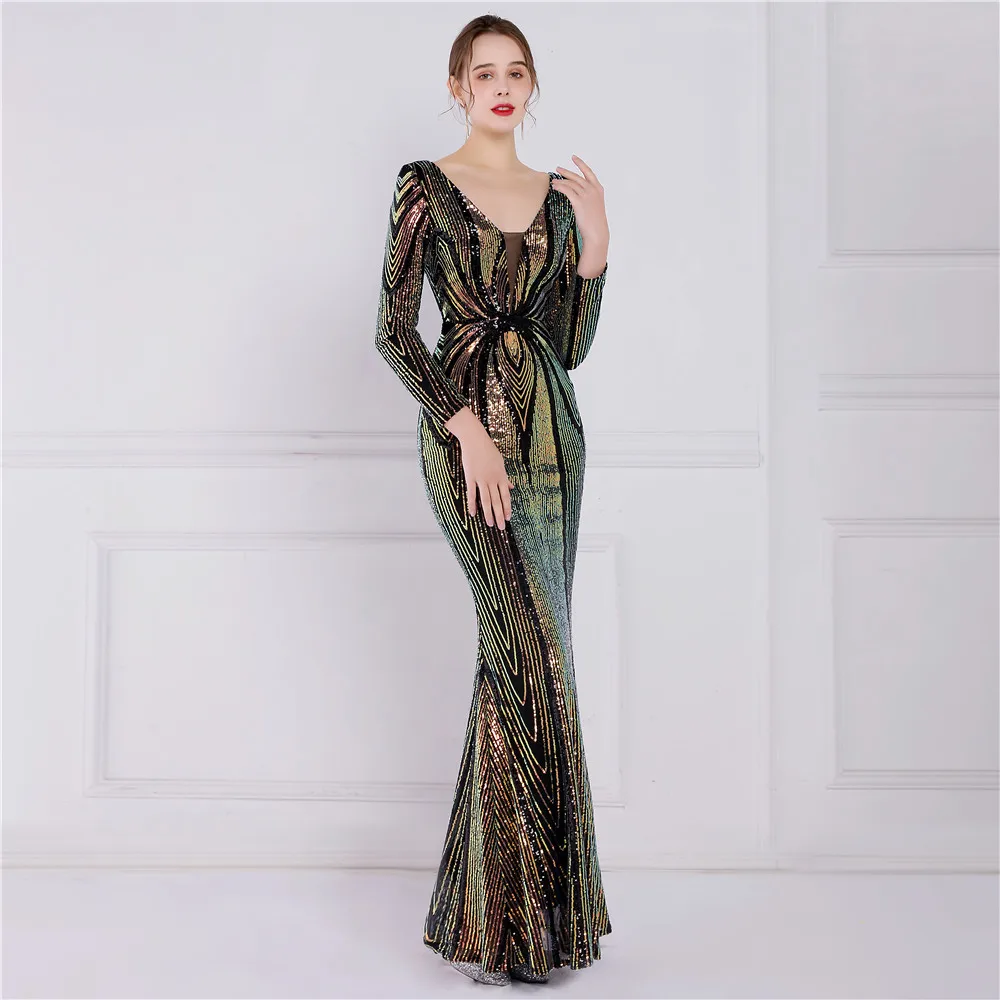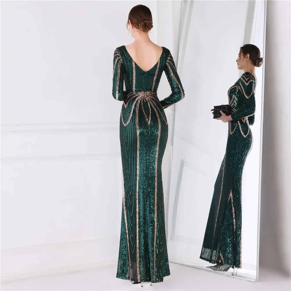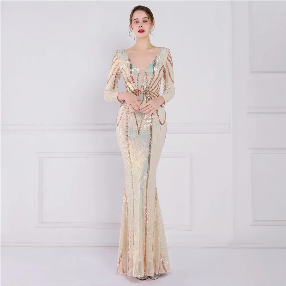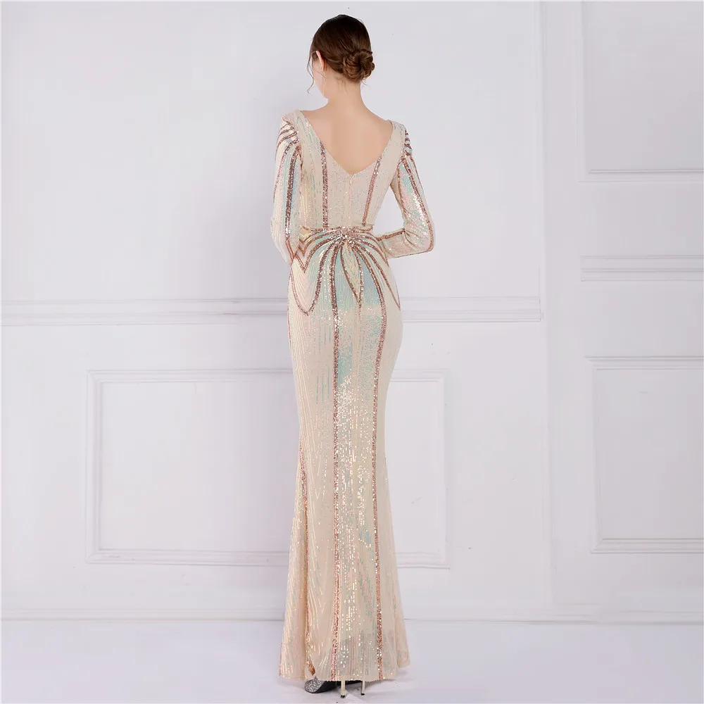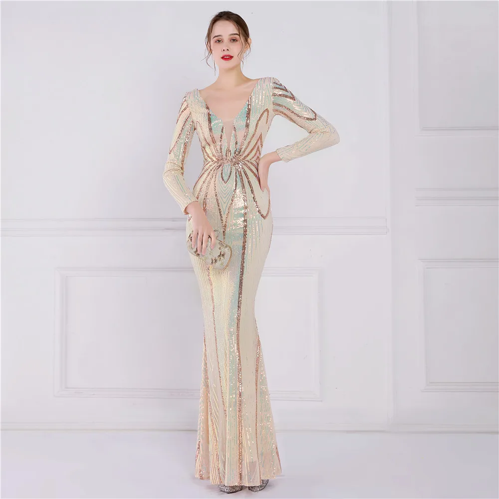 Fleepmart Stretch Gold Sequin Maxi Dress Full Sleeve V Neck Mermaid Evening Night Long Party Dress