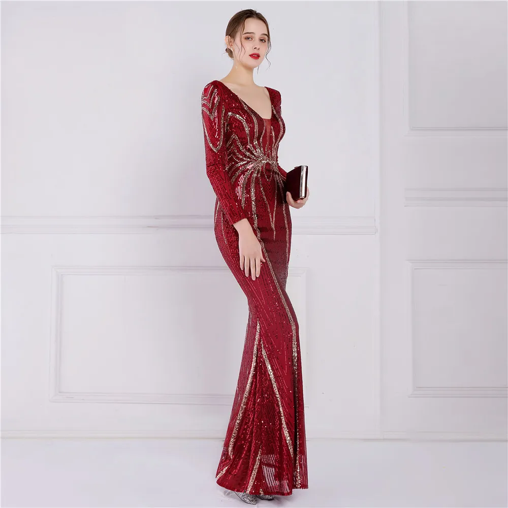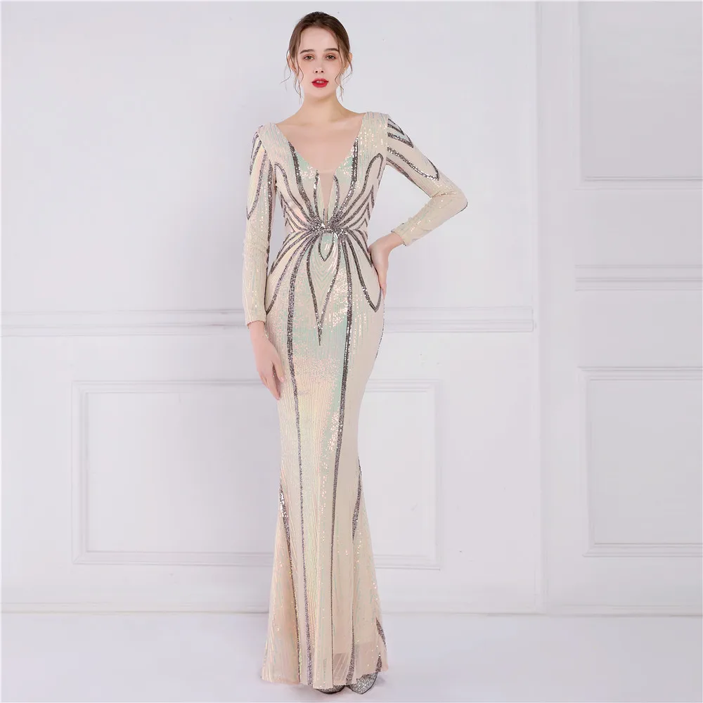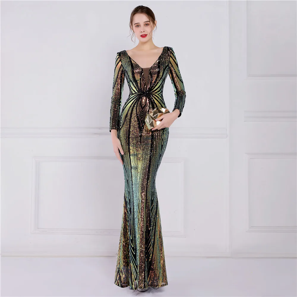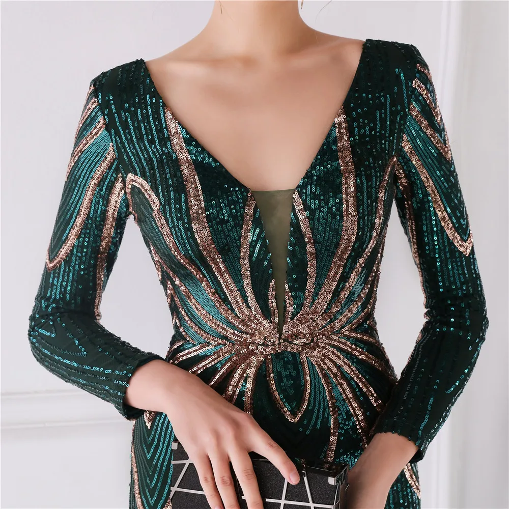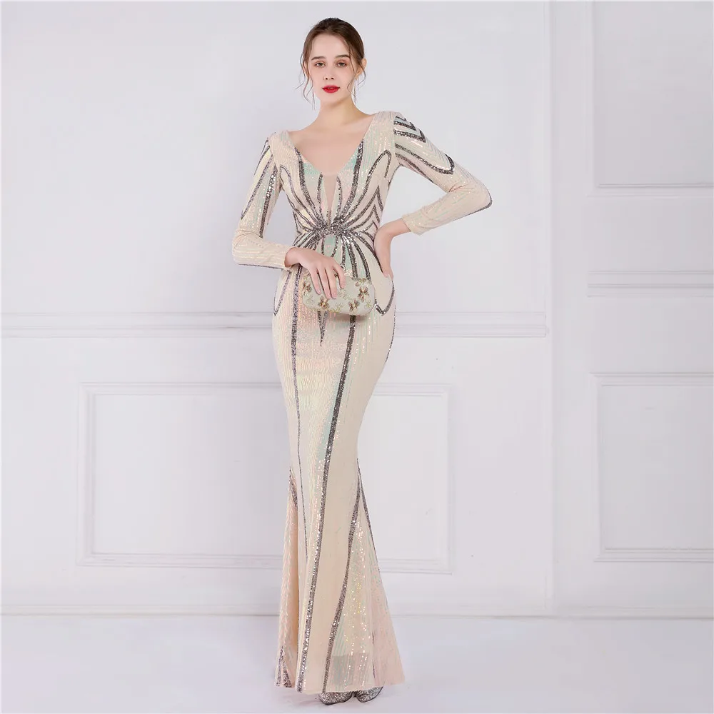 Fleepmart Stretch Gold Sequin Maxi Dress Full Sleeve V Neck Mermaid Evening Night Long Party Dress