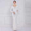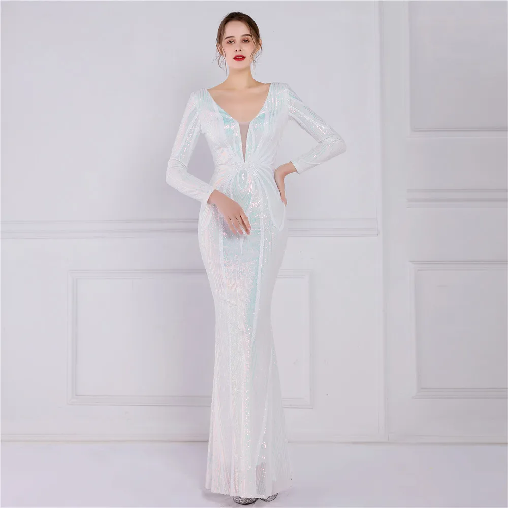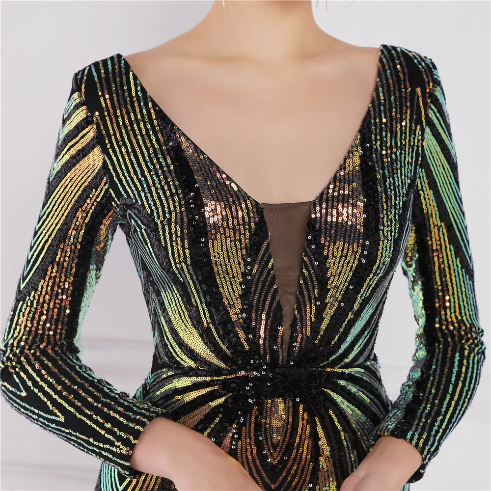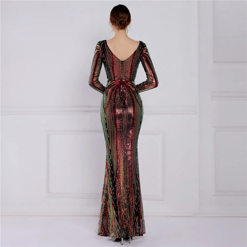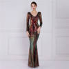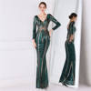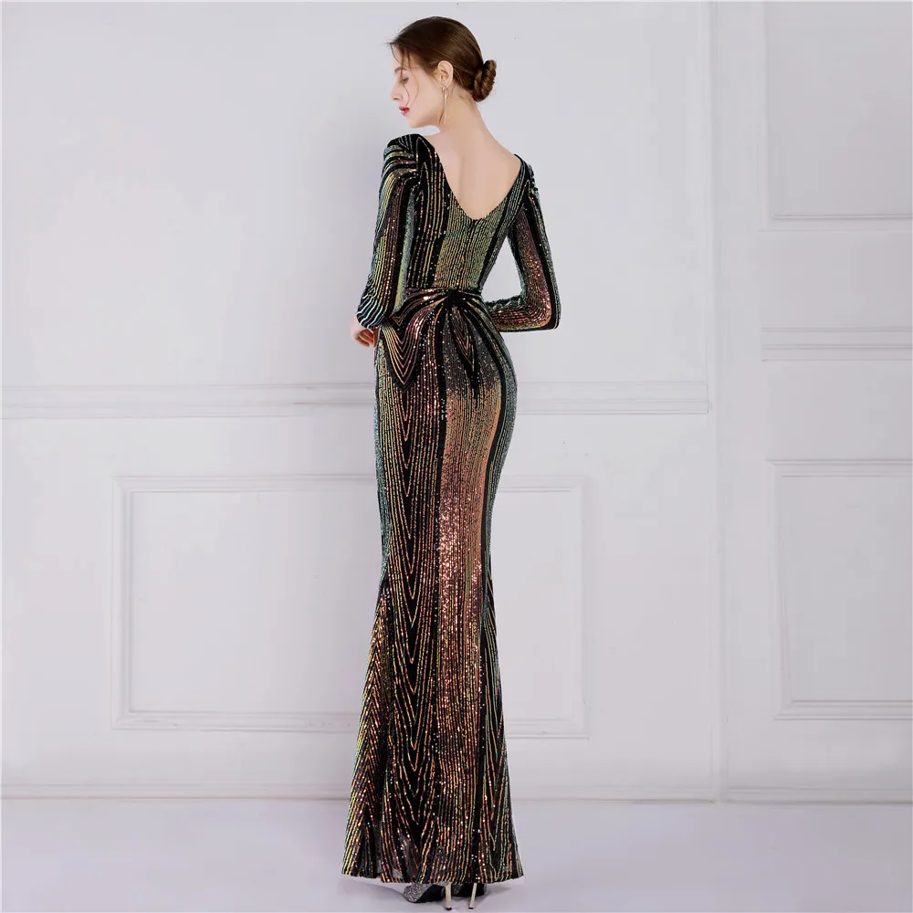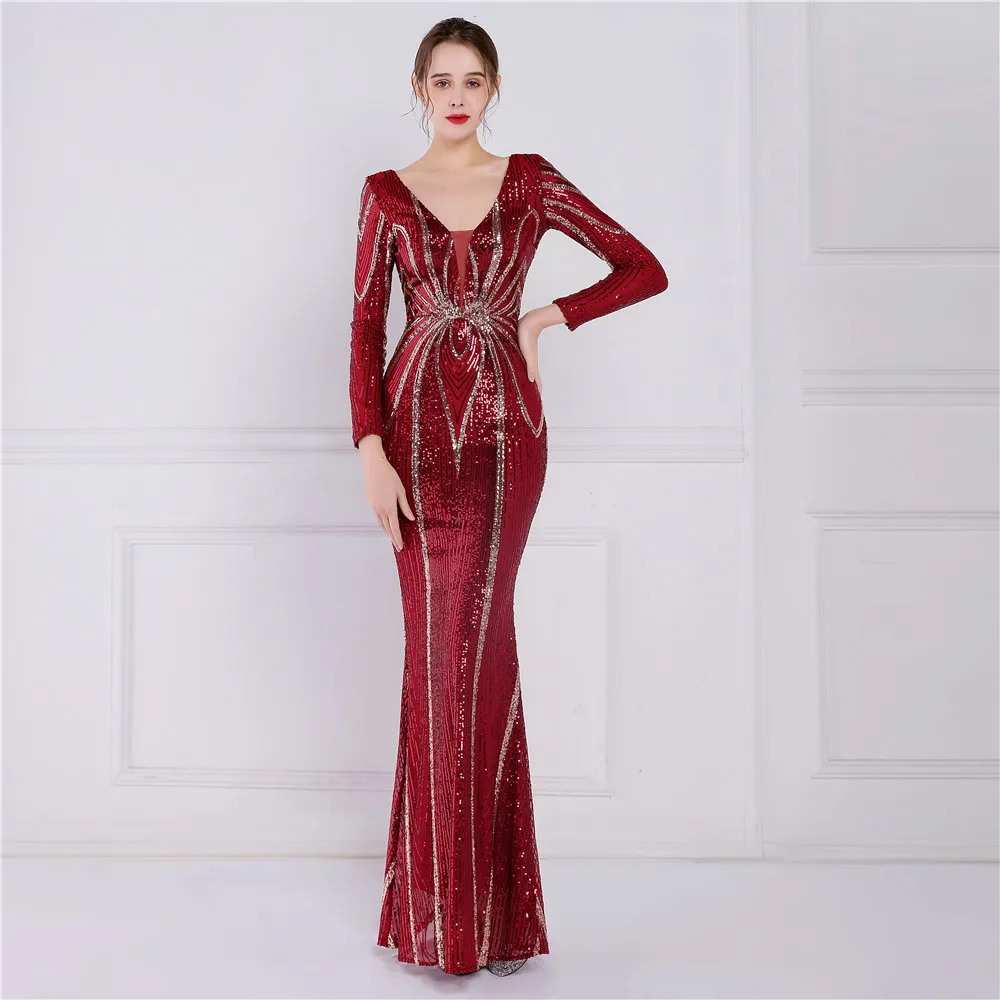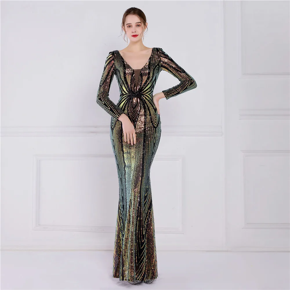 Fleepmart Stretch Gold Sequin Maxi Dress Full Sleeve V Neck Mermaid Evening Night Long Party Dress