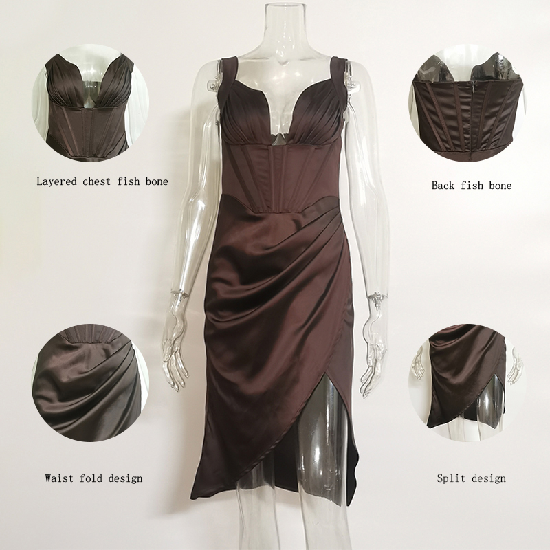 Fleepmart Stretch Satin Elegant Dress Women High Split Deep V Neck Sexy Party Dress 2021 Summer Dresses With Fishbone Vestidos