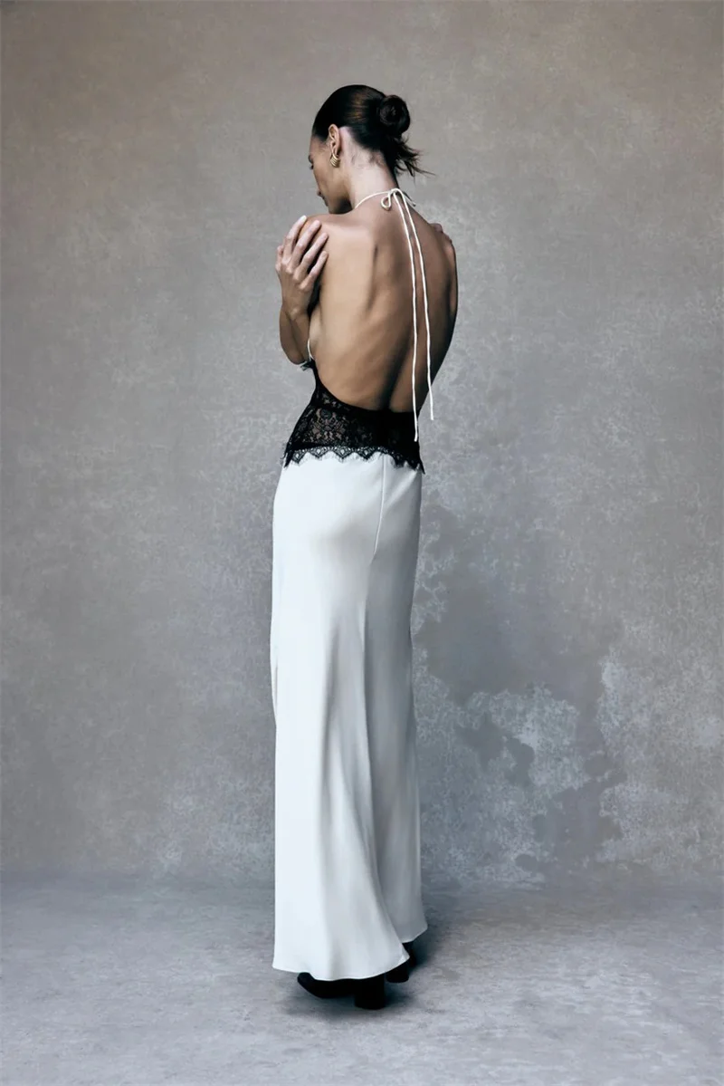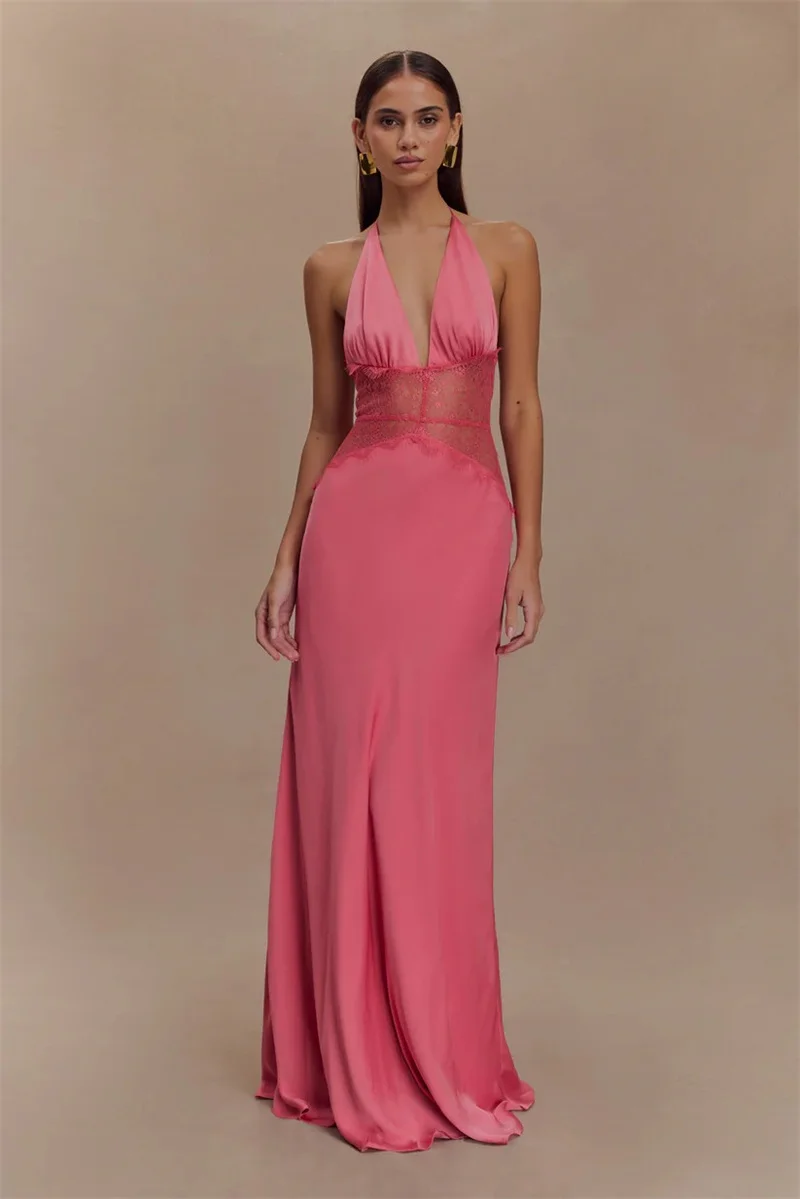 Fleepmart Summer Backless Sexy Maxi Dress Women Gown Patchwork Lace Halter Deep V Neck Sleeveless High Waist Elegant Long Dress