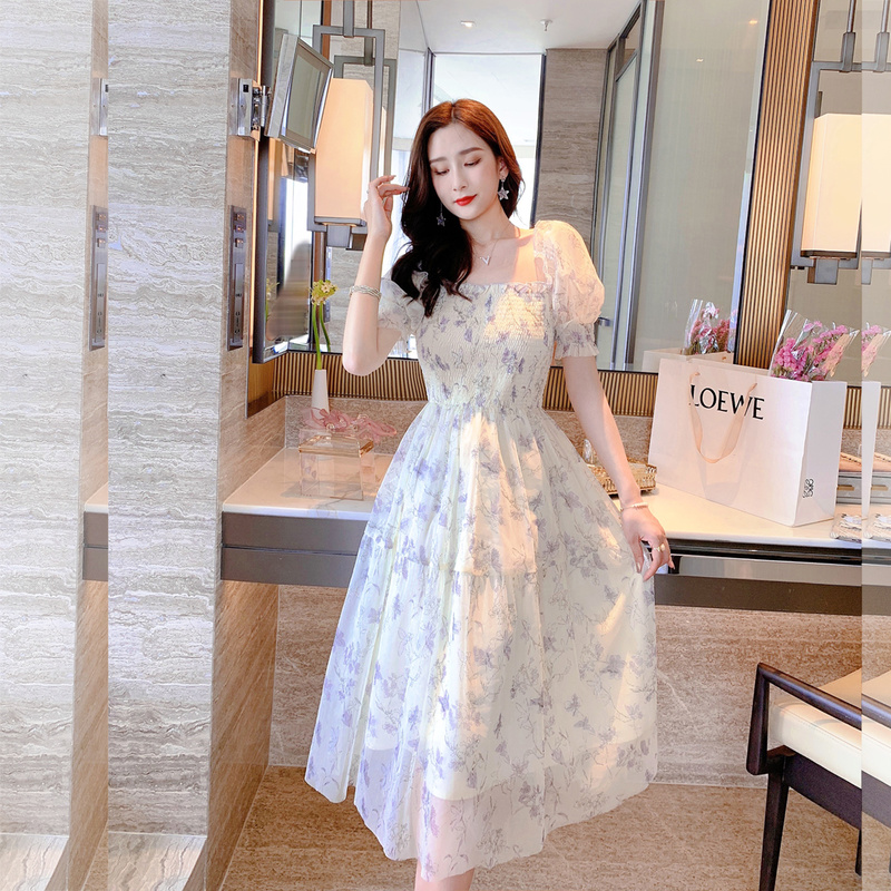 Fleepmart Summer Chiffon Elegant Kawaii Dress Women Floral Print Sweet Princess Casual Midi Dress Female Puff Sleeve Party Holiday Dress