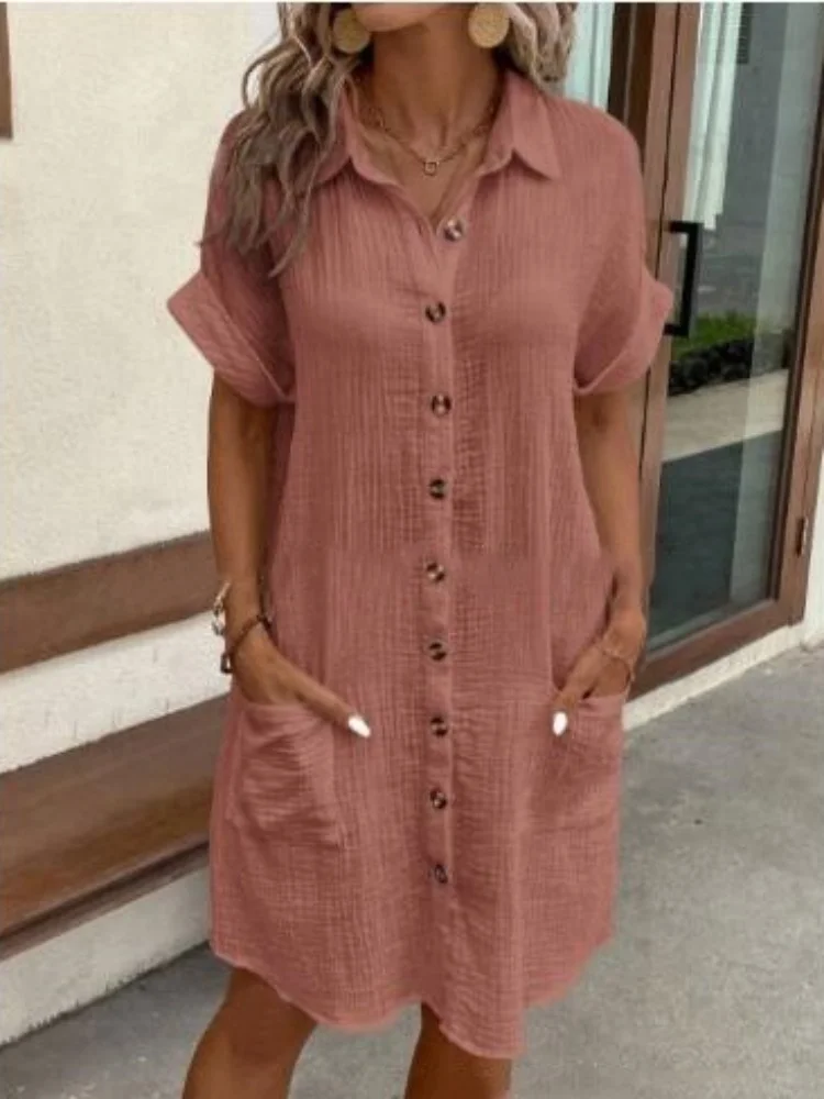 Fleepmart Summer Fashion Turn-down Collar Women Dress Short Sleeve Line Cotton Solid Color Casuall Loose Shirt Dresses