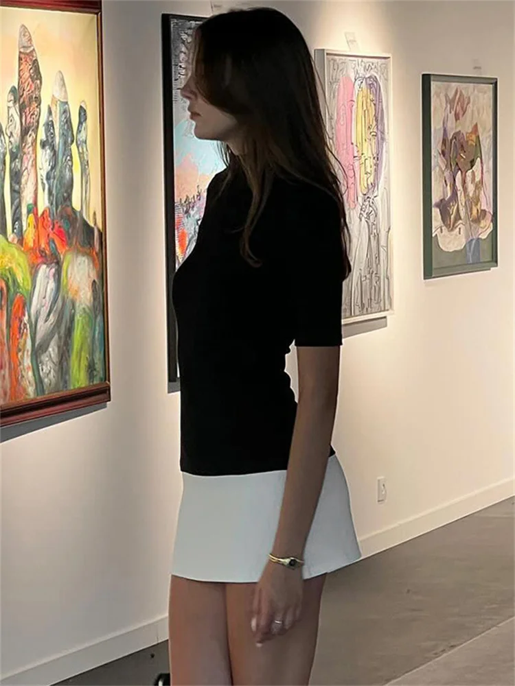 Fleepmart Summer Female Contrast Mini Dress Casual High Waist Short Sleeve Sexy Skinny Patchwork Bodycon Dress Women’s Mini Dress