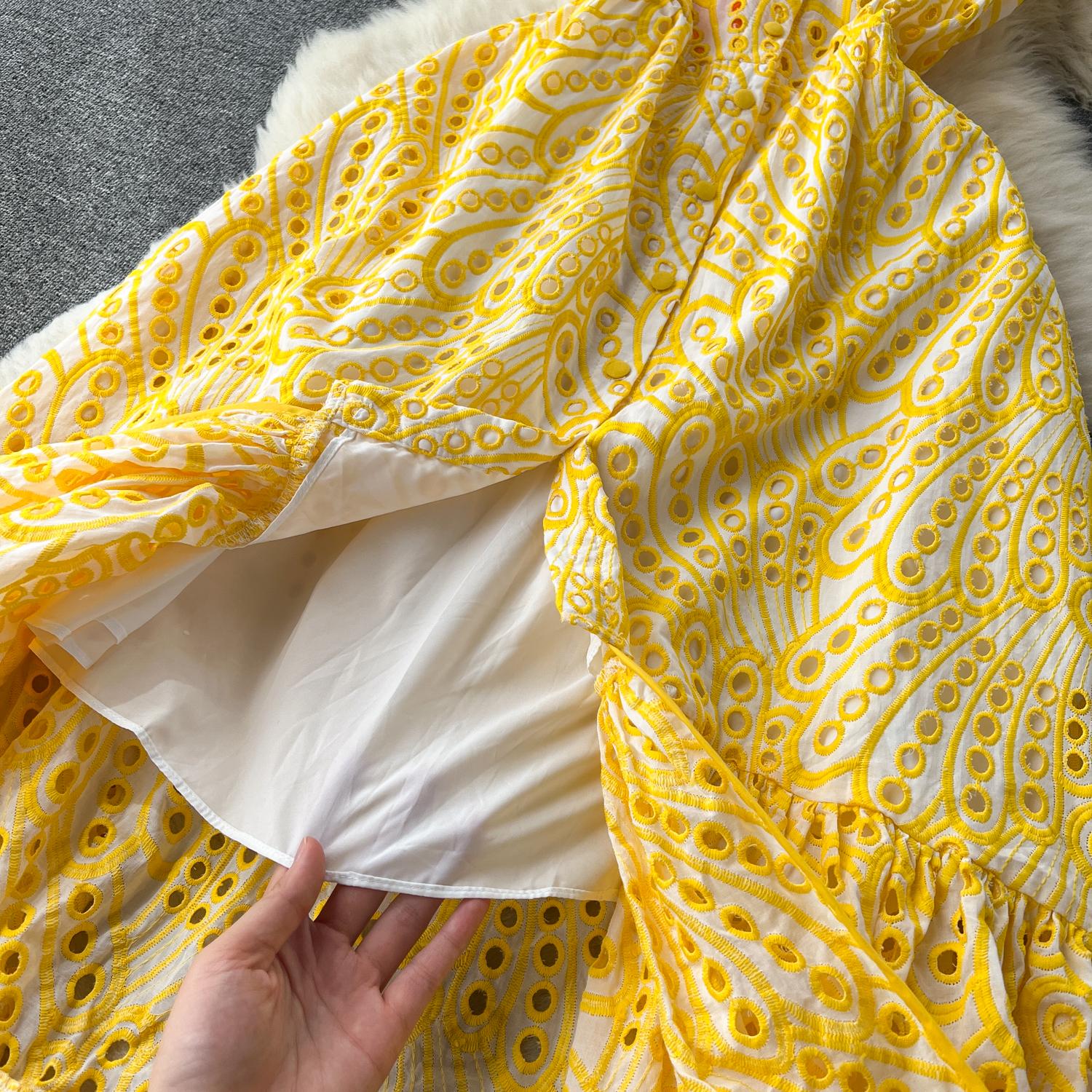 Fleepmart Summer Holiday Beach Sexy Hollow Out Embroidery Dress Women’s Spaghetti Strap Single Breasted Ruffles Backless Long Vestidos