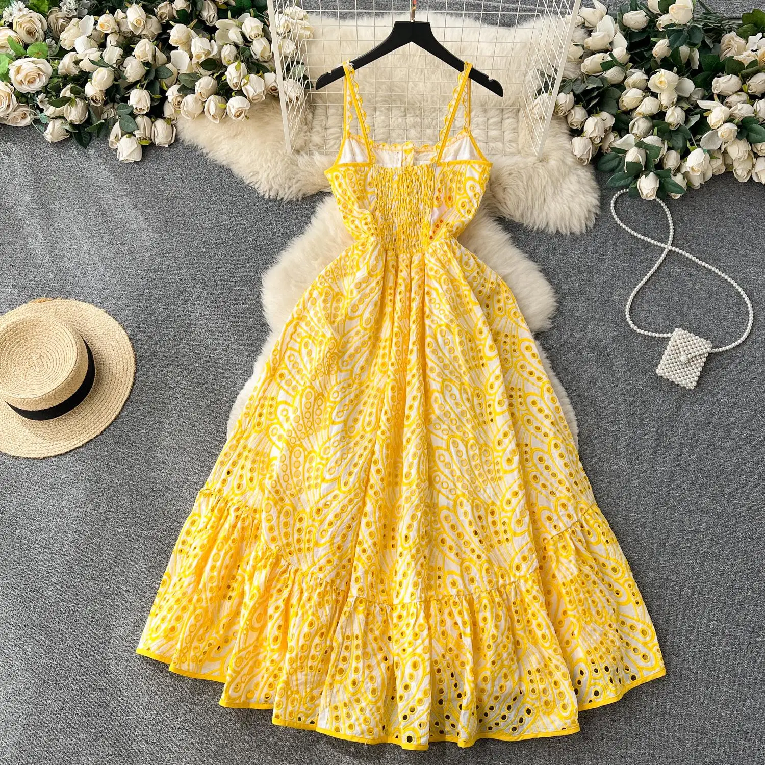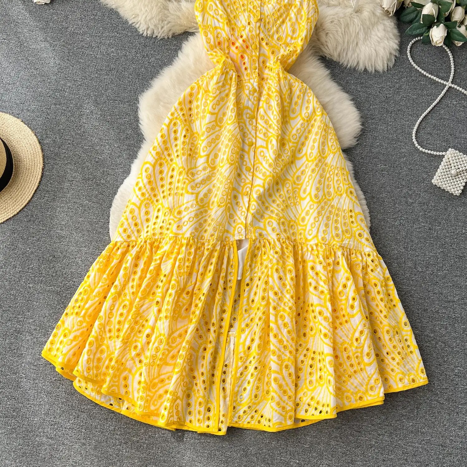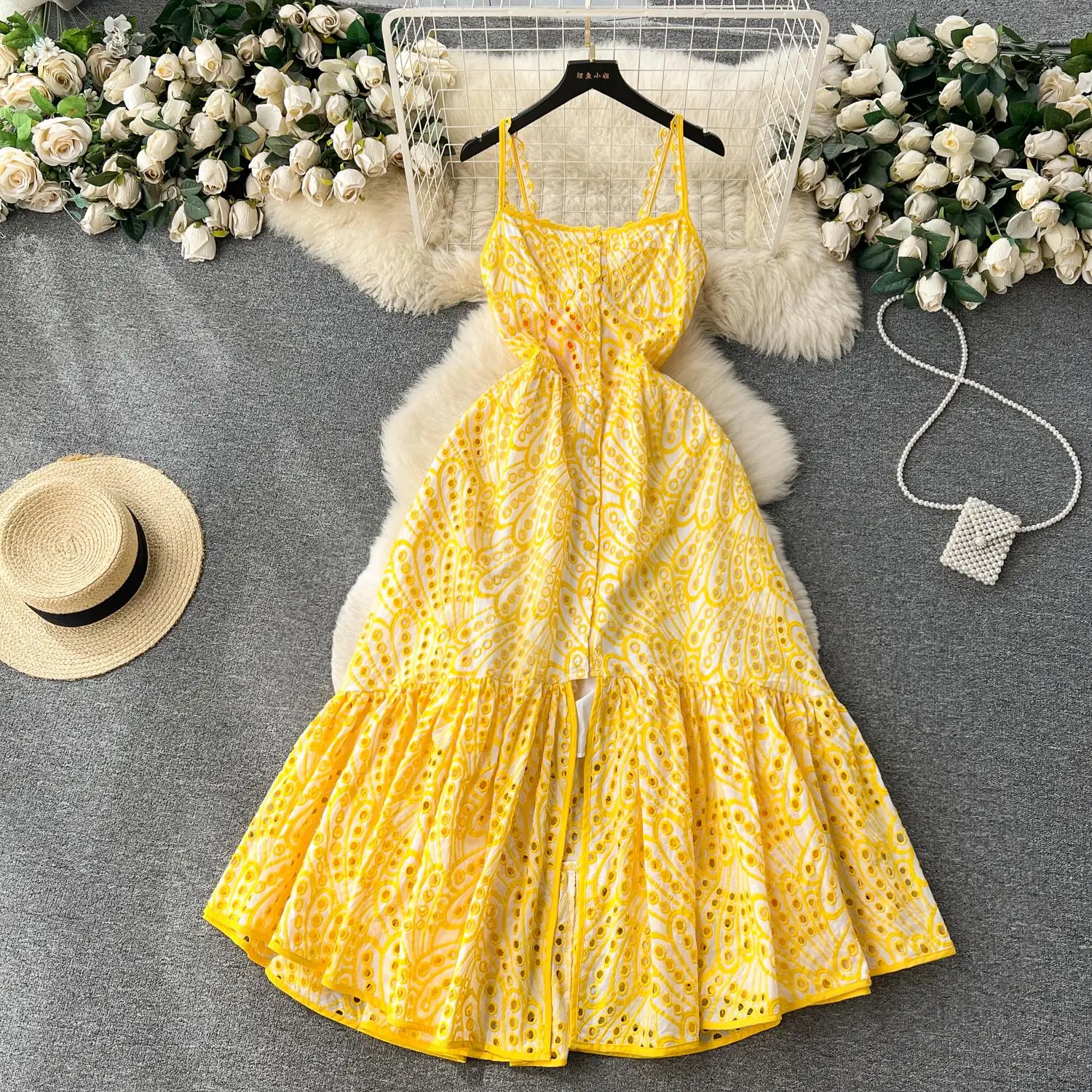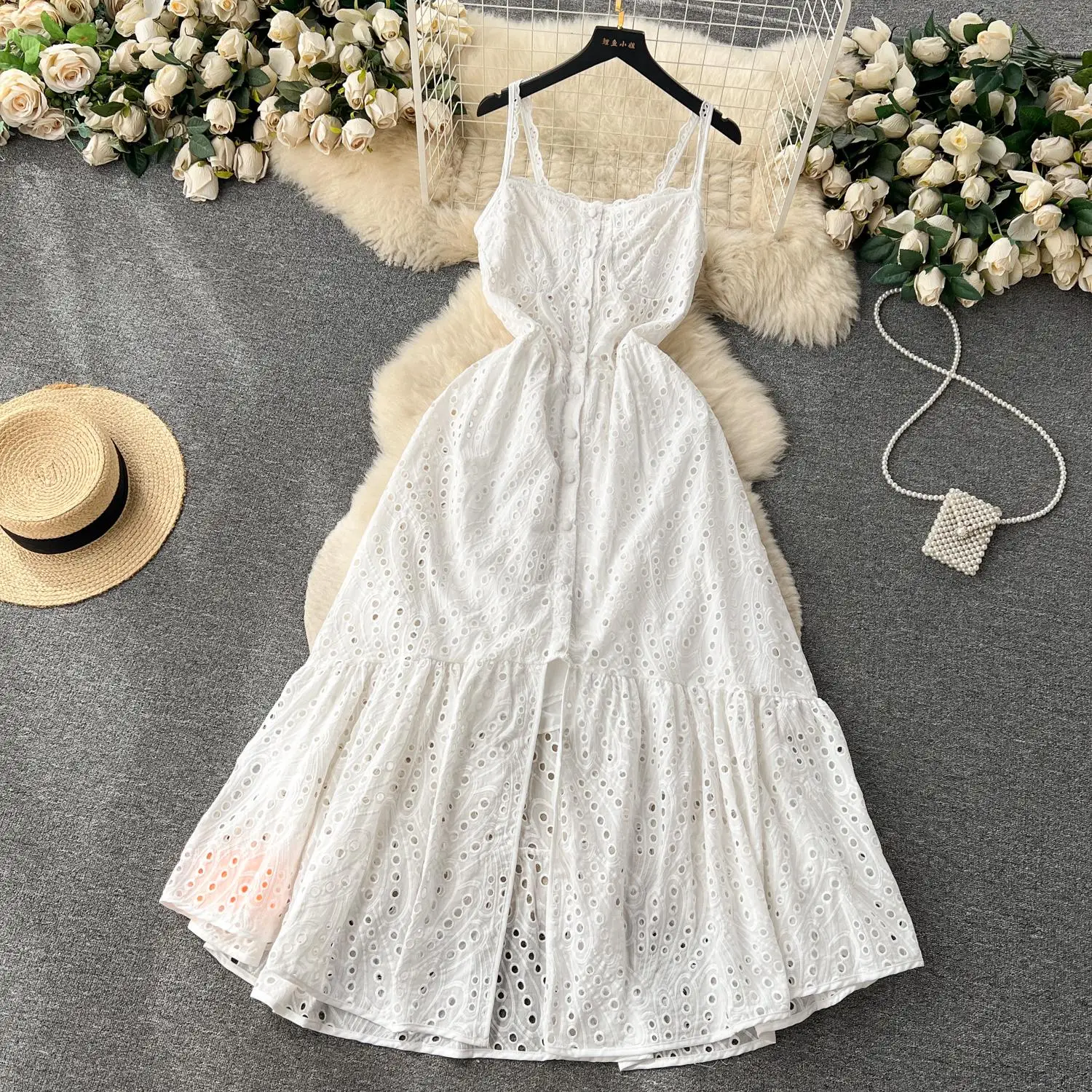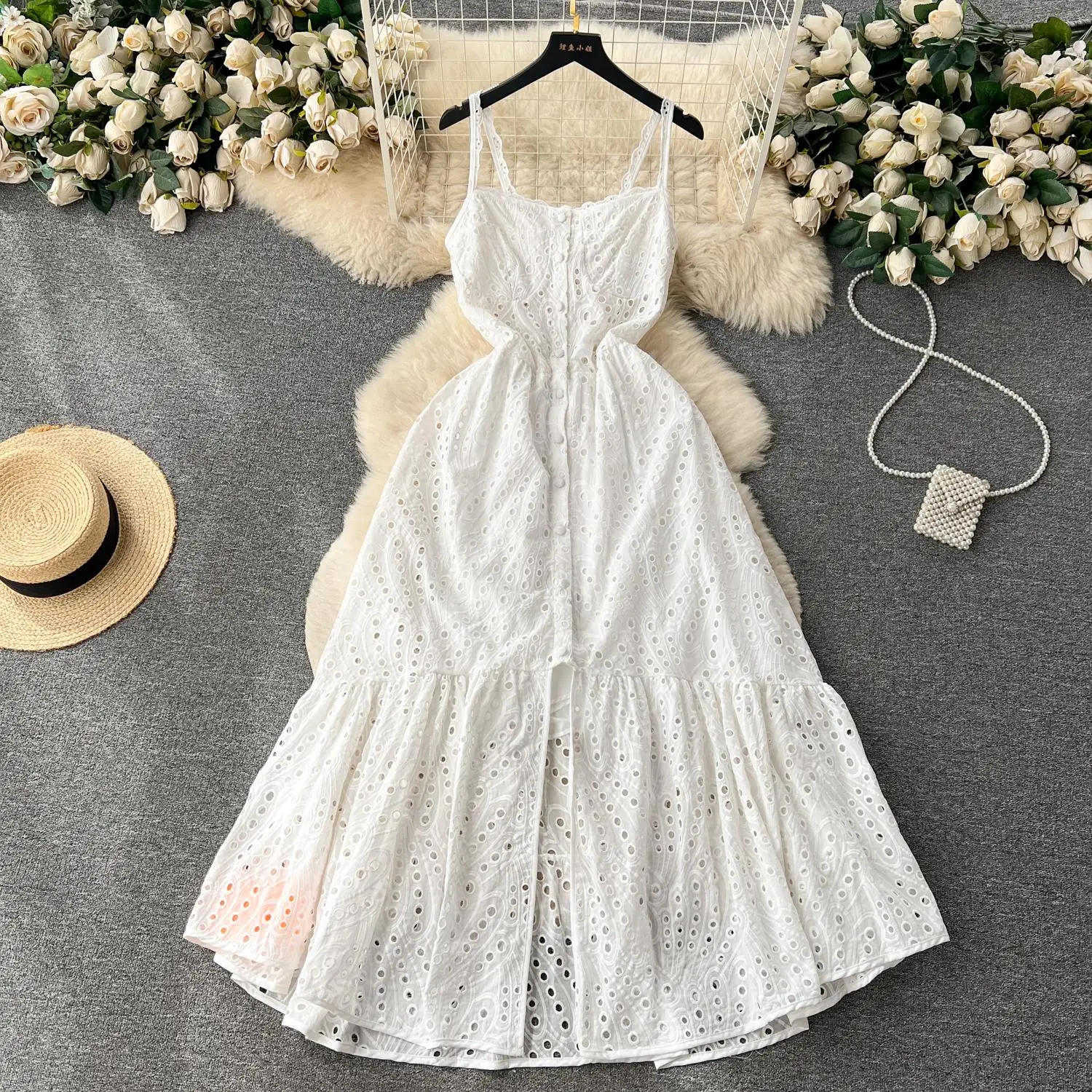 Fleepmart Summer Holiday Beach Sexy Hollow Out Embroidery Dress Women’s Spaghetti Strap Single Breasted Ruffles Backless Long Vestidos
