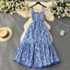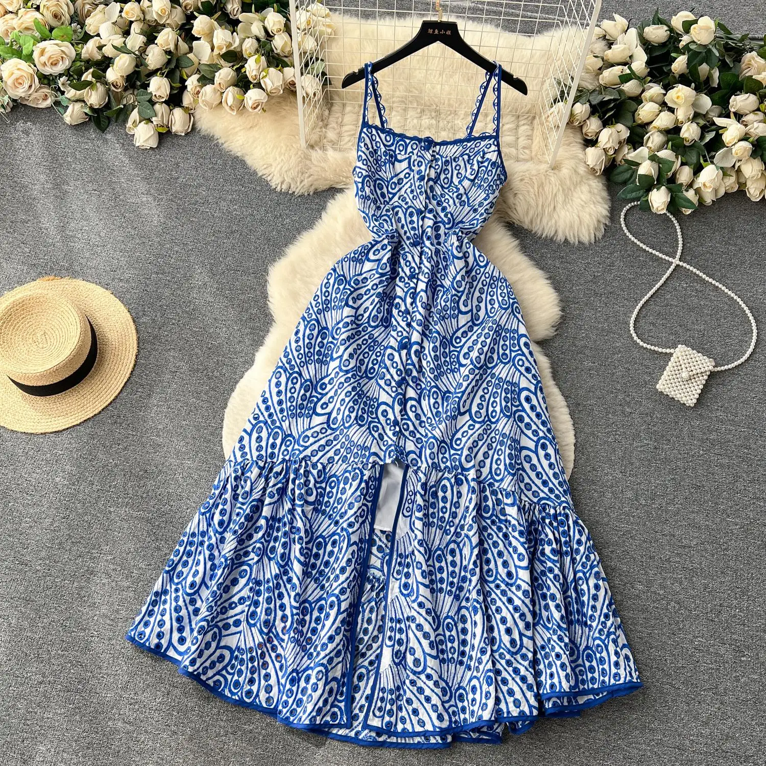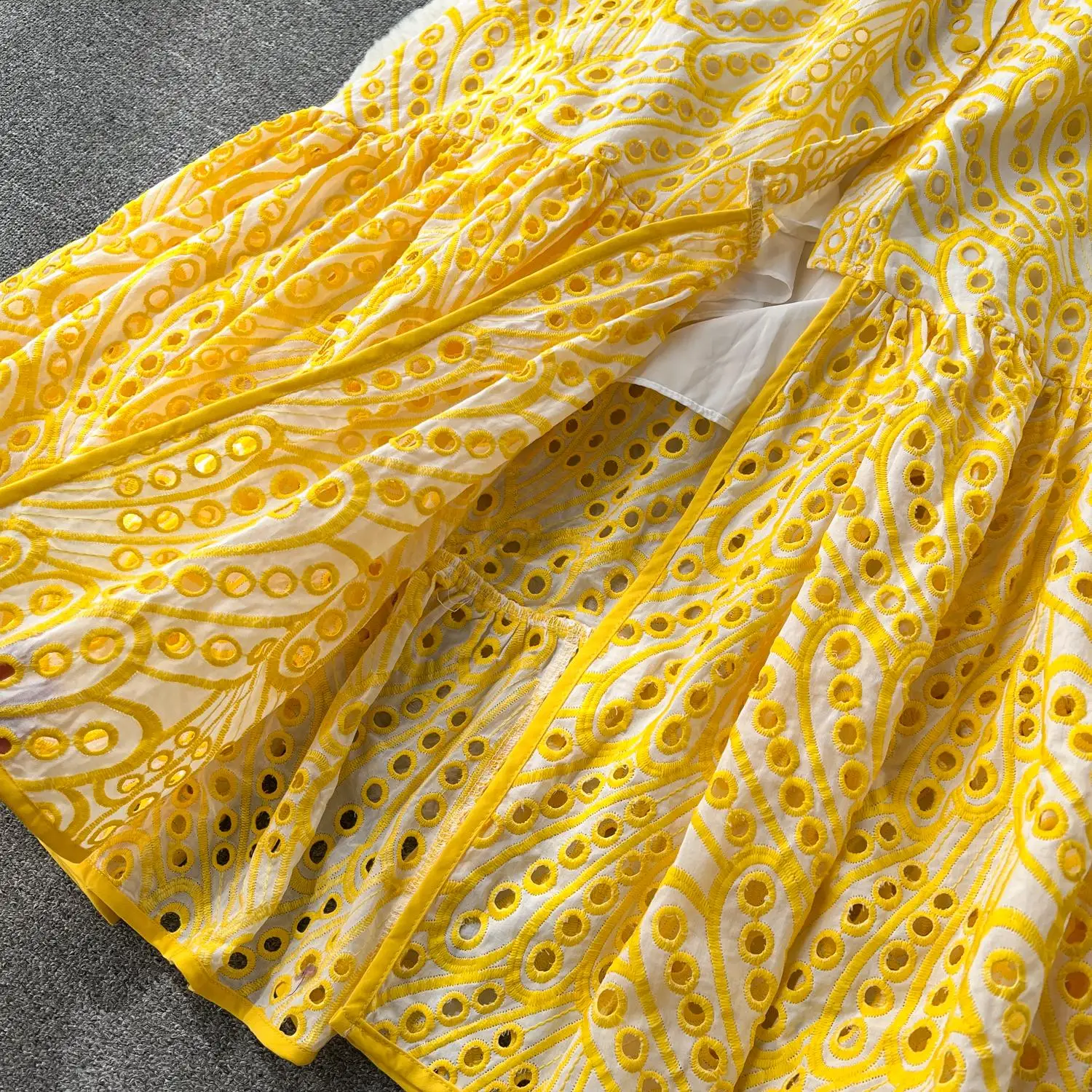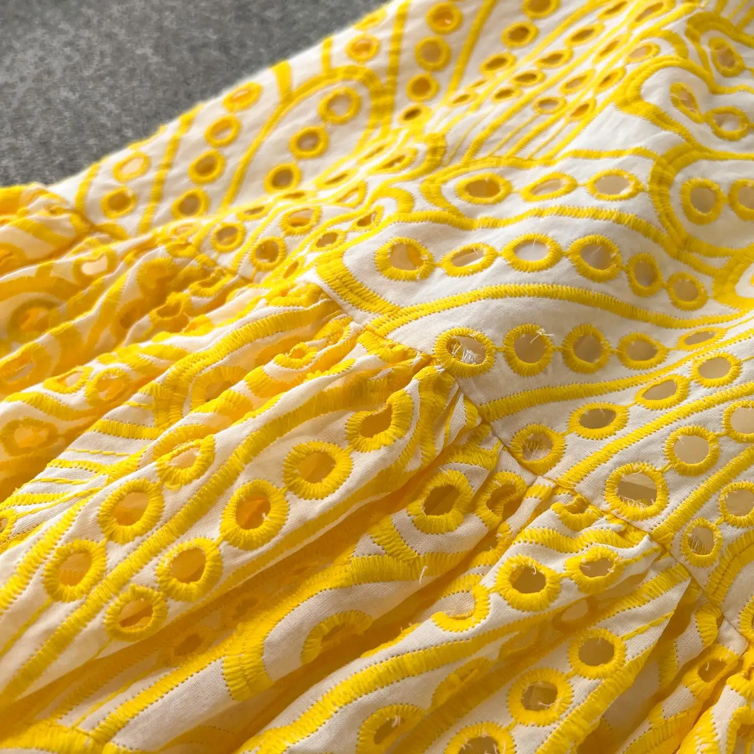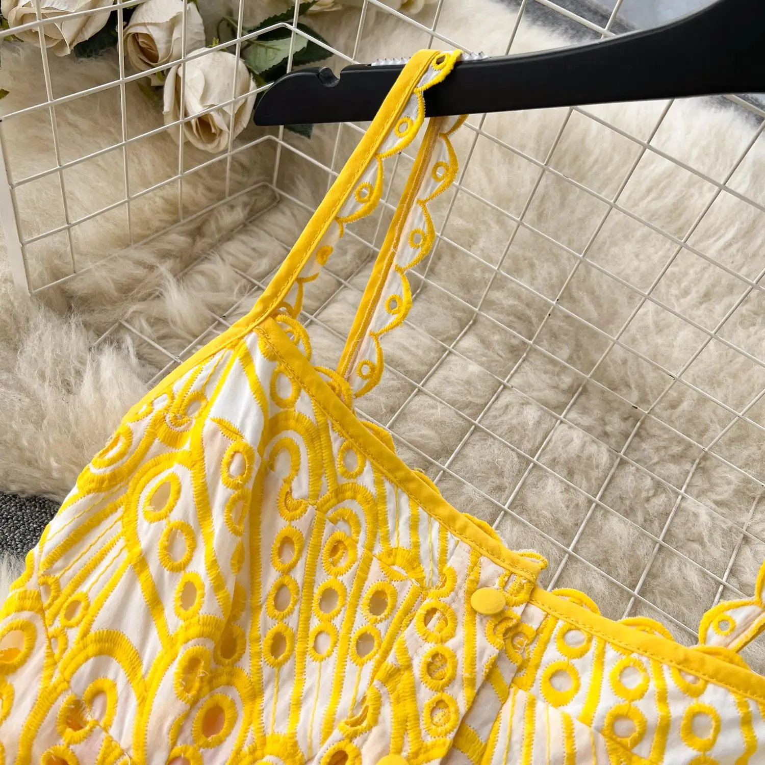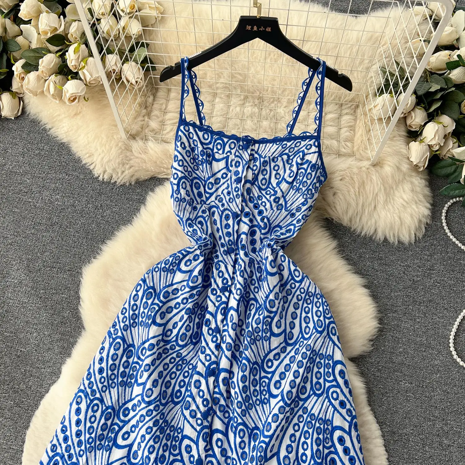 Fleepmart Summer Holiday Beach Sexy Hollow Out Embroidery Dress Women’s Spaghetti Strap Single Breasted Ruffles Backless Long Vestidos