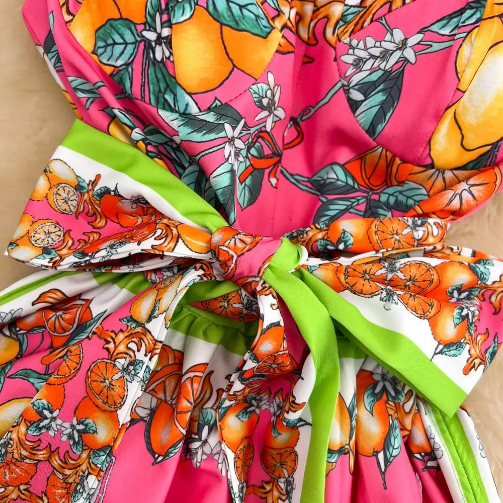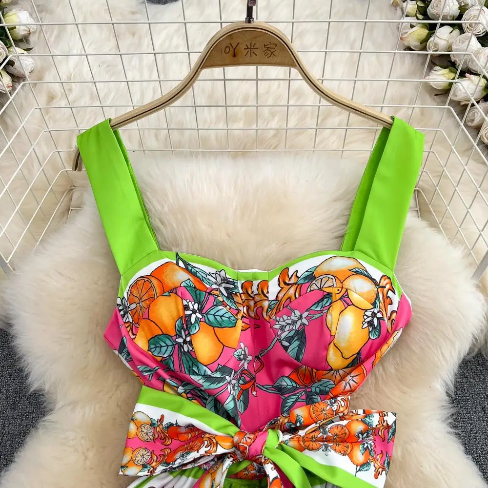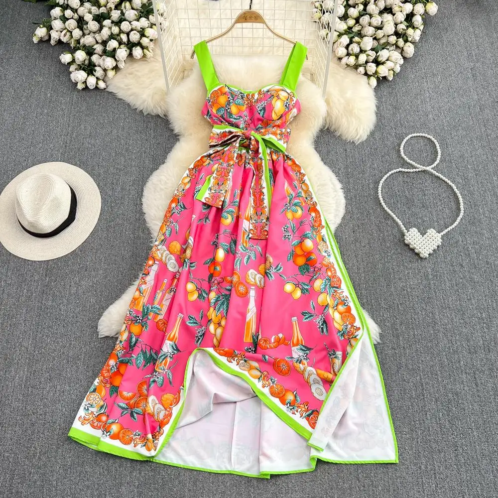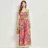 Fleepmart Summer Holiday Print Spaghetti Strap Beach Dress For Women’s Slash Neck Floral Print Belt Long Bohemain Vestido Robes