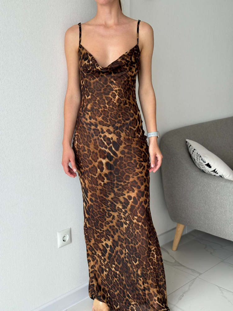 Fleepmart Summer Leopard Sexy See Through Maxi Backless Sheer Beach Lace Up Elegant Floor Length Holiday Dress