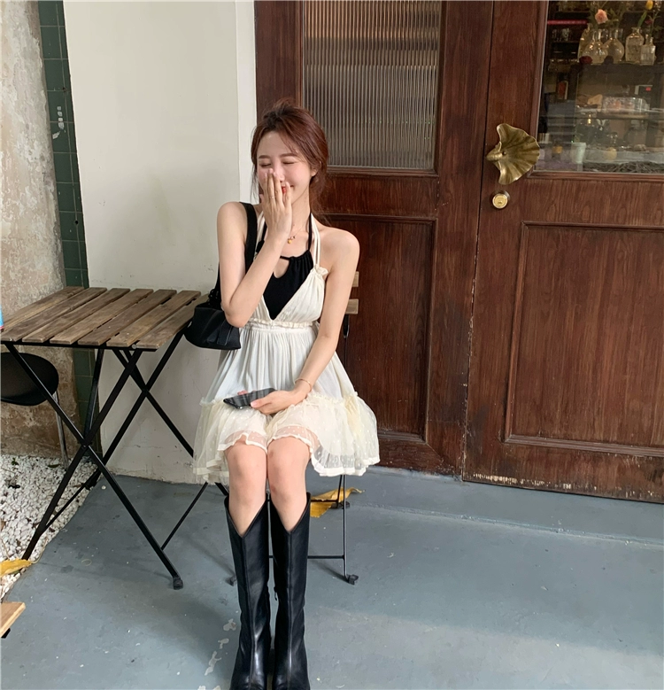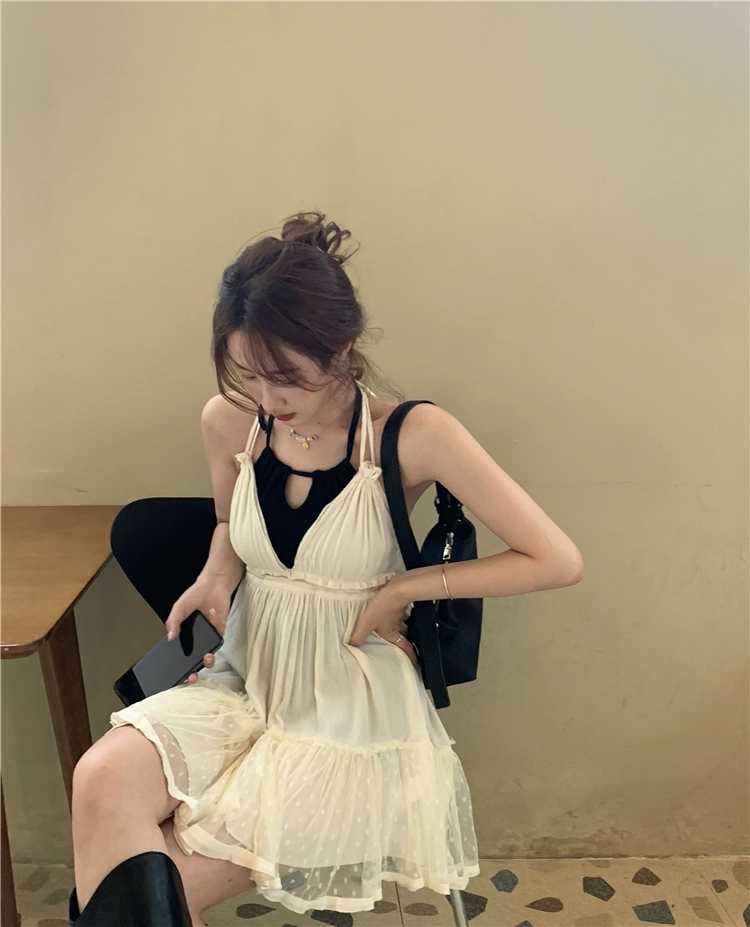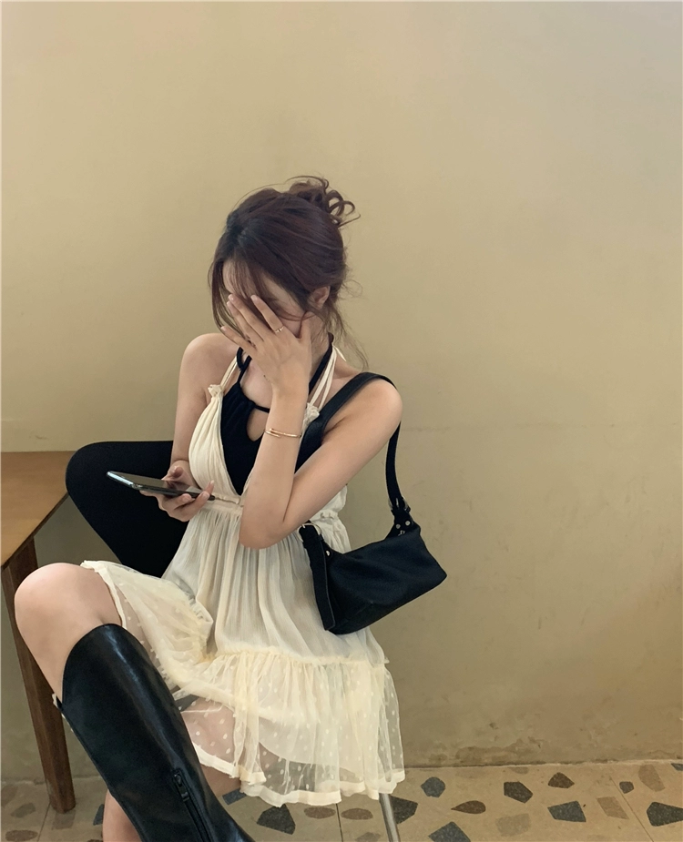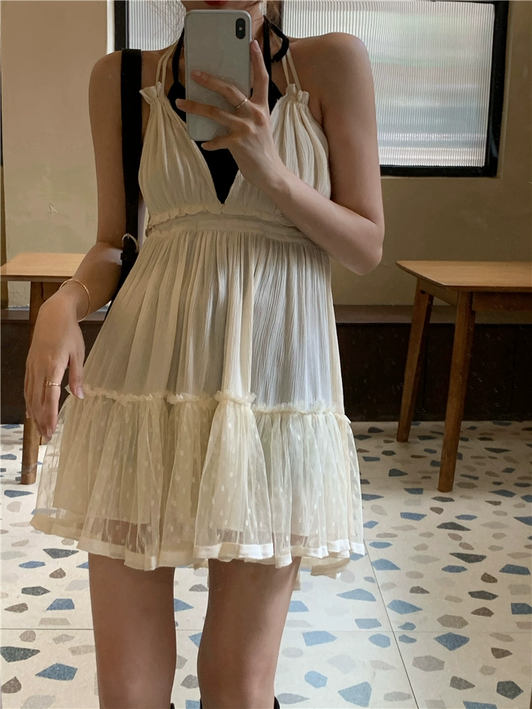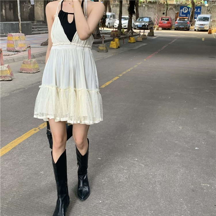 Fleepmart summer mini dress for Womens 2021 holiday style girls sweet loose lace up spaghetti strap dress womens