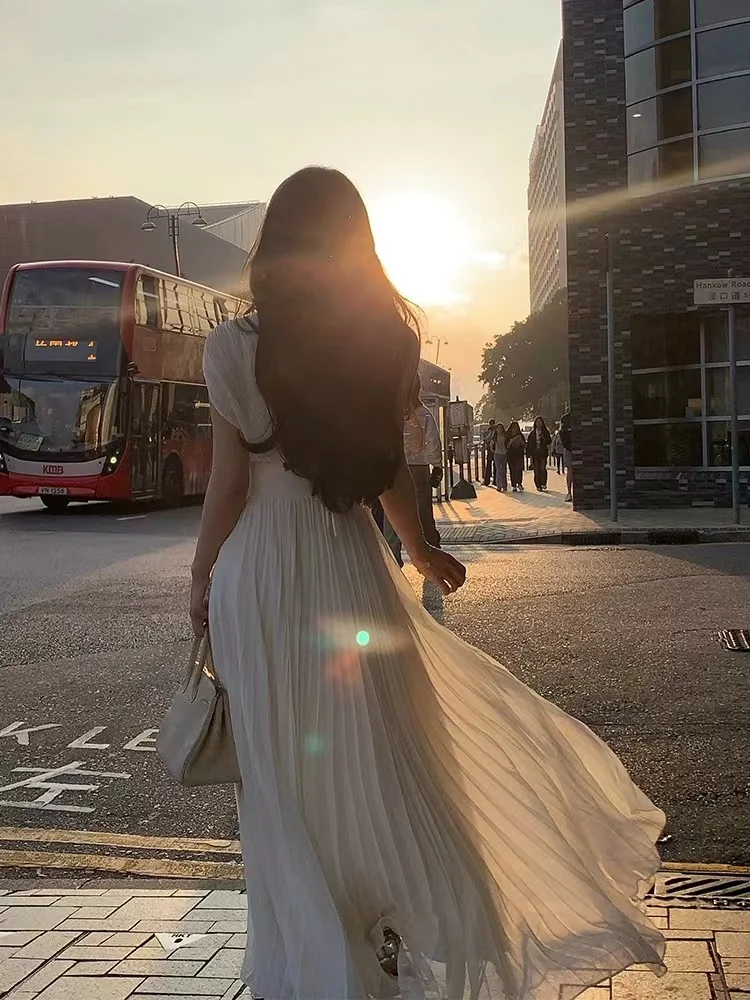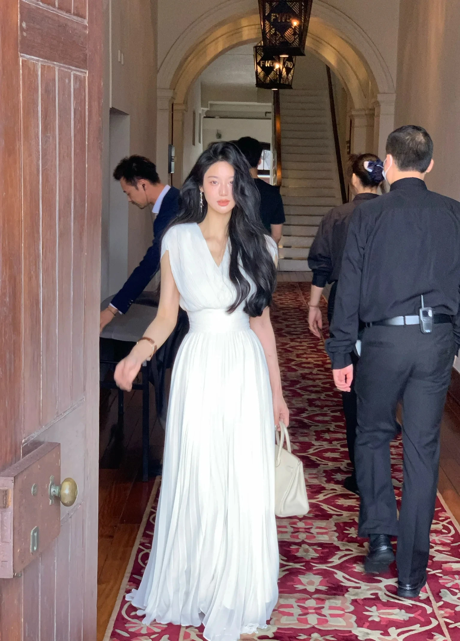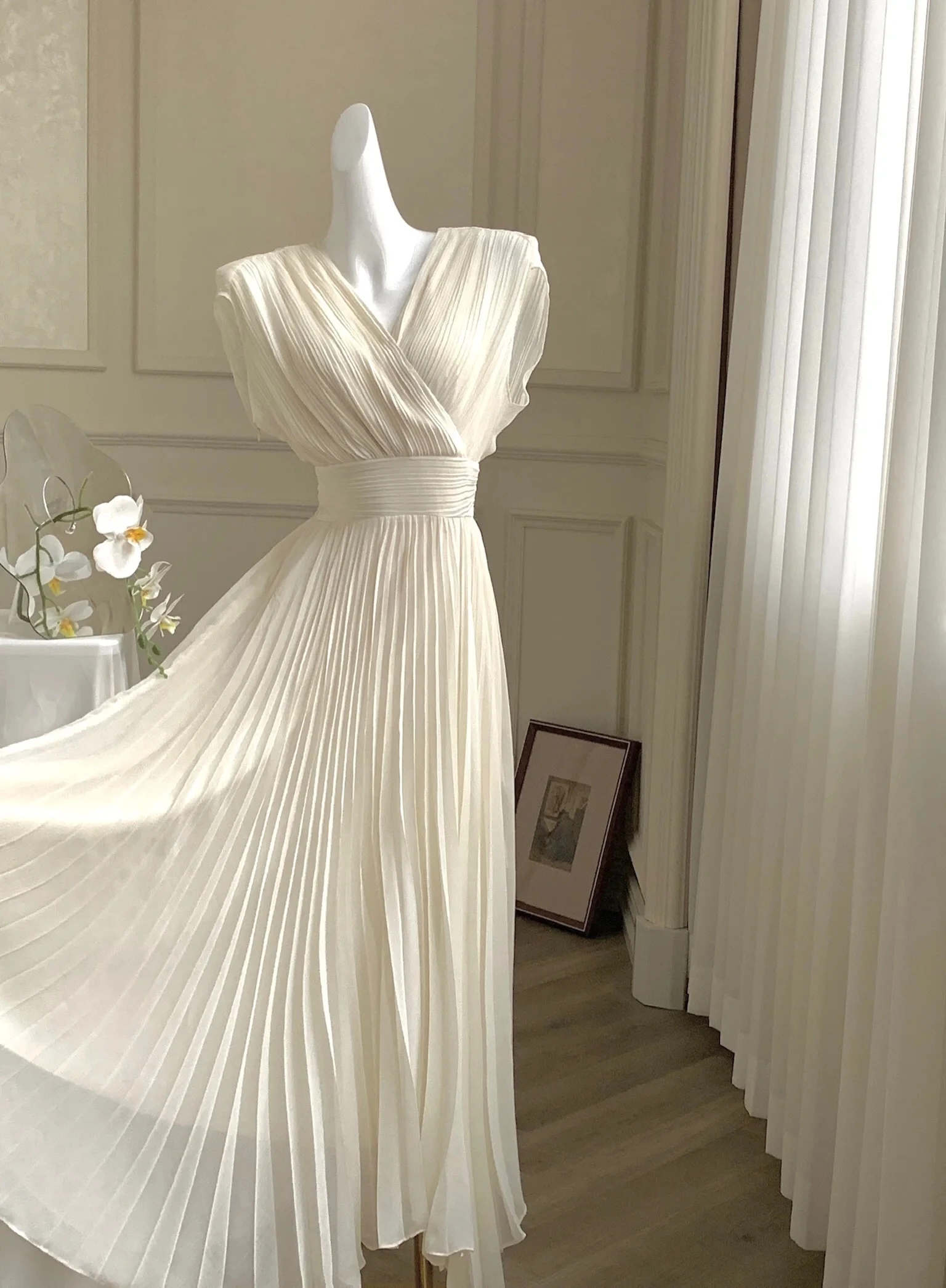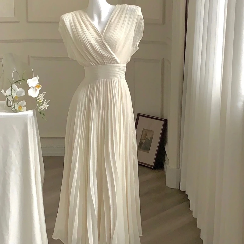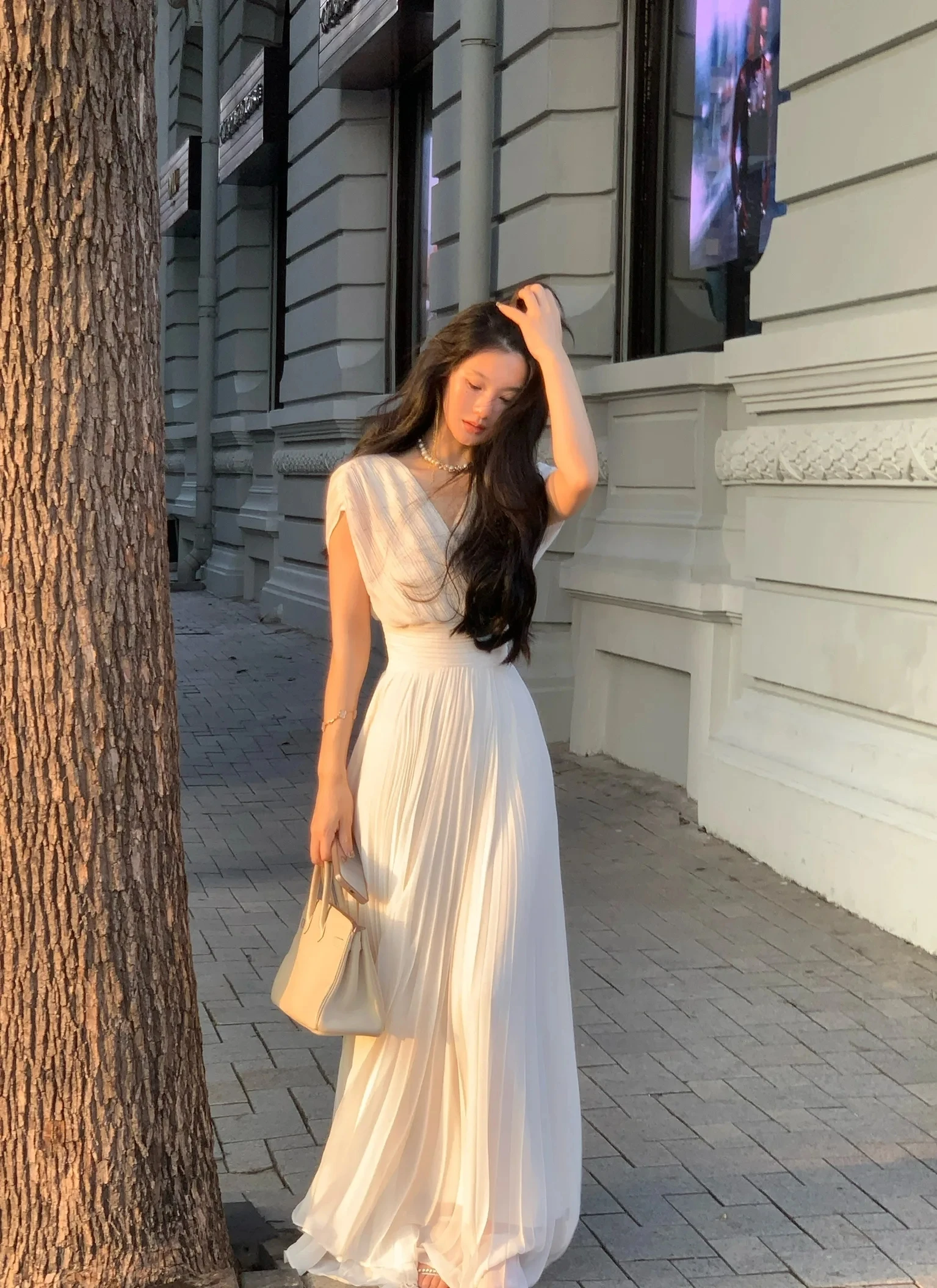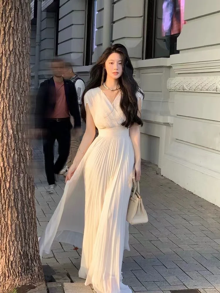 Fleepmart Summer New Elegant Party Pleats Long Dresses for Women V-neck High Waist Holiday Casual Sleeveless Female Clothing Robe