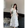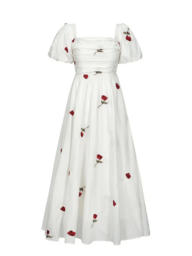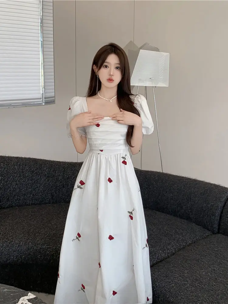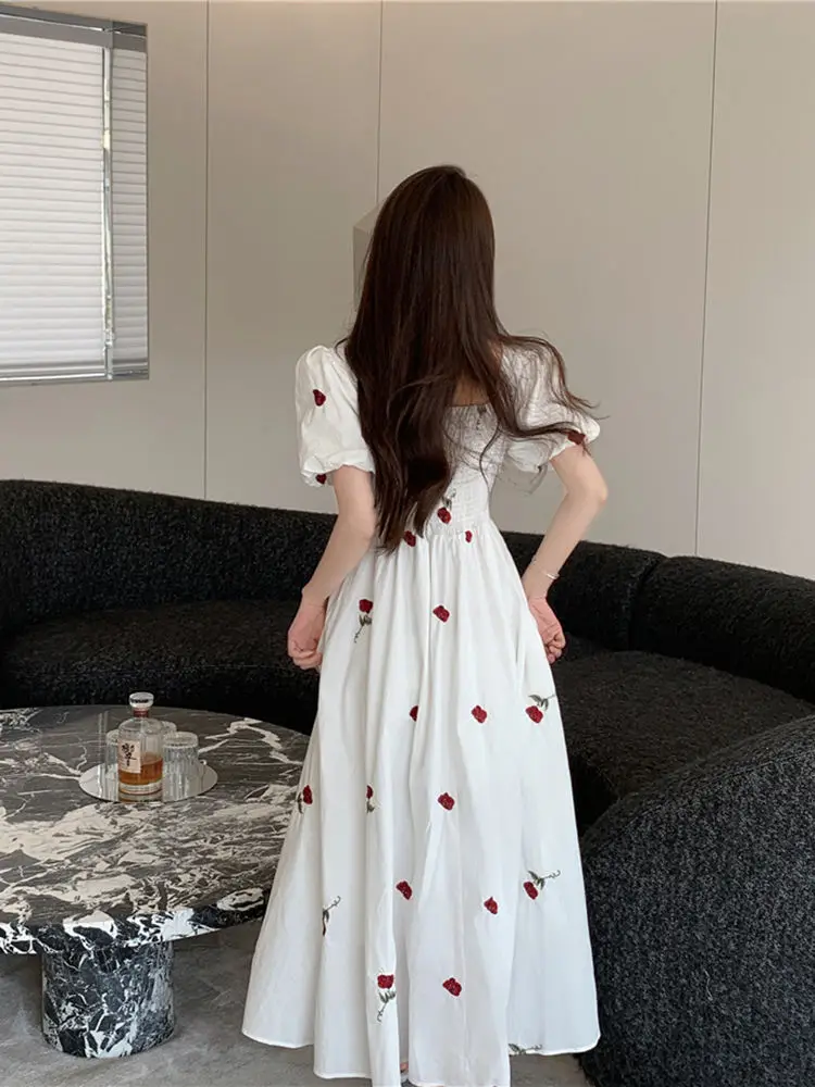 Fleepmart French Style White Dress Sweet Rose Printed Bubble Sleeve Midi Dresses Women Gentle Summer Square Neck Slim Vestidos