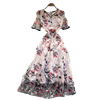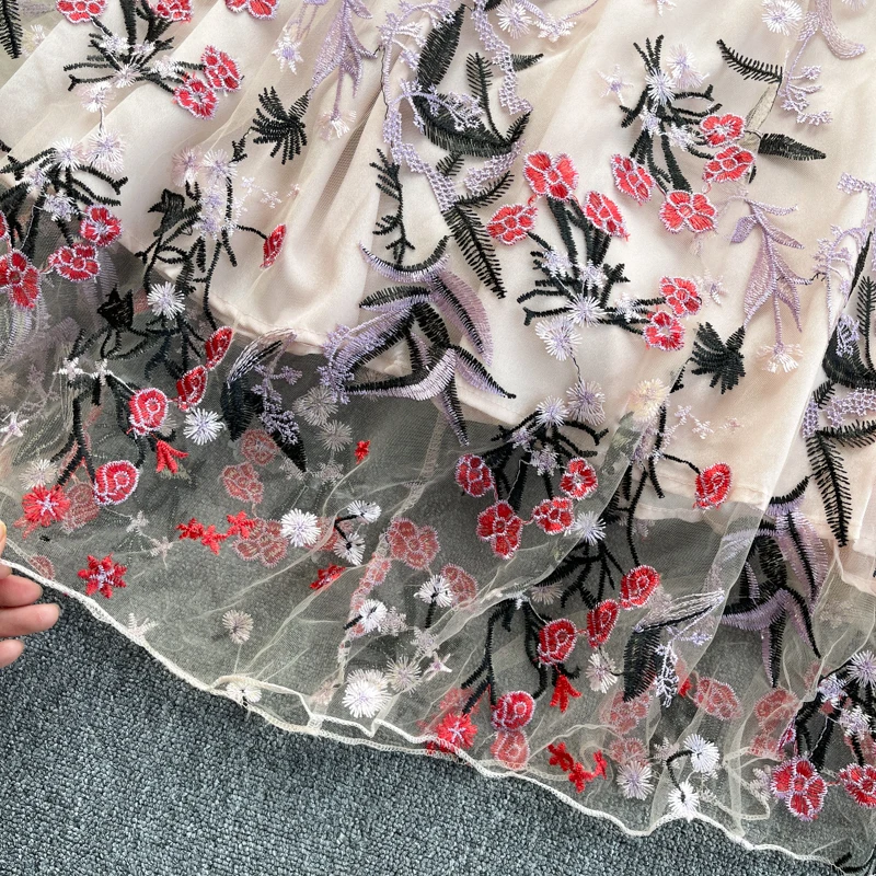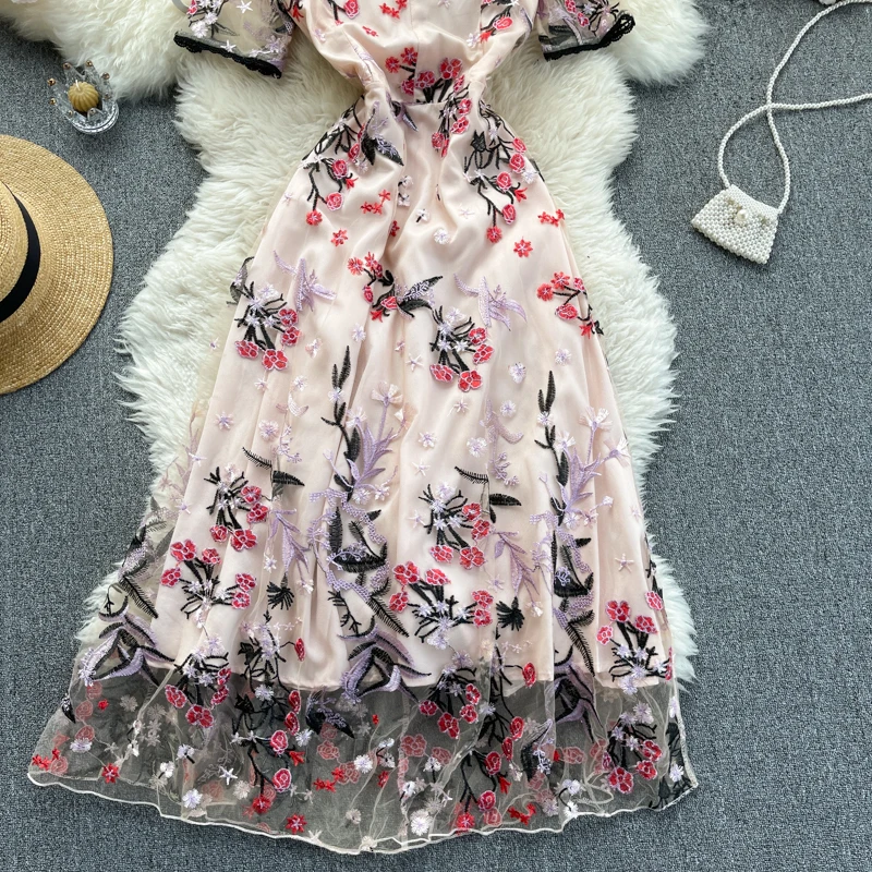 Fleepmart Summer Retro Fashion Embroidered Flowers Vestidos Women's Lace Lace V-neck Hollow Short-sleeved Waist Slimming Midi Dress