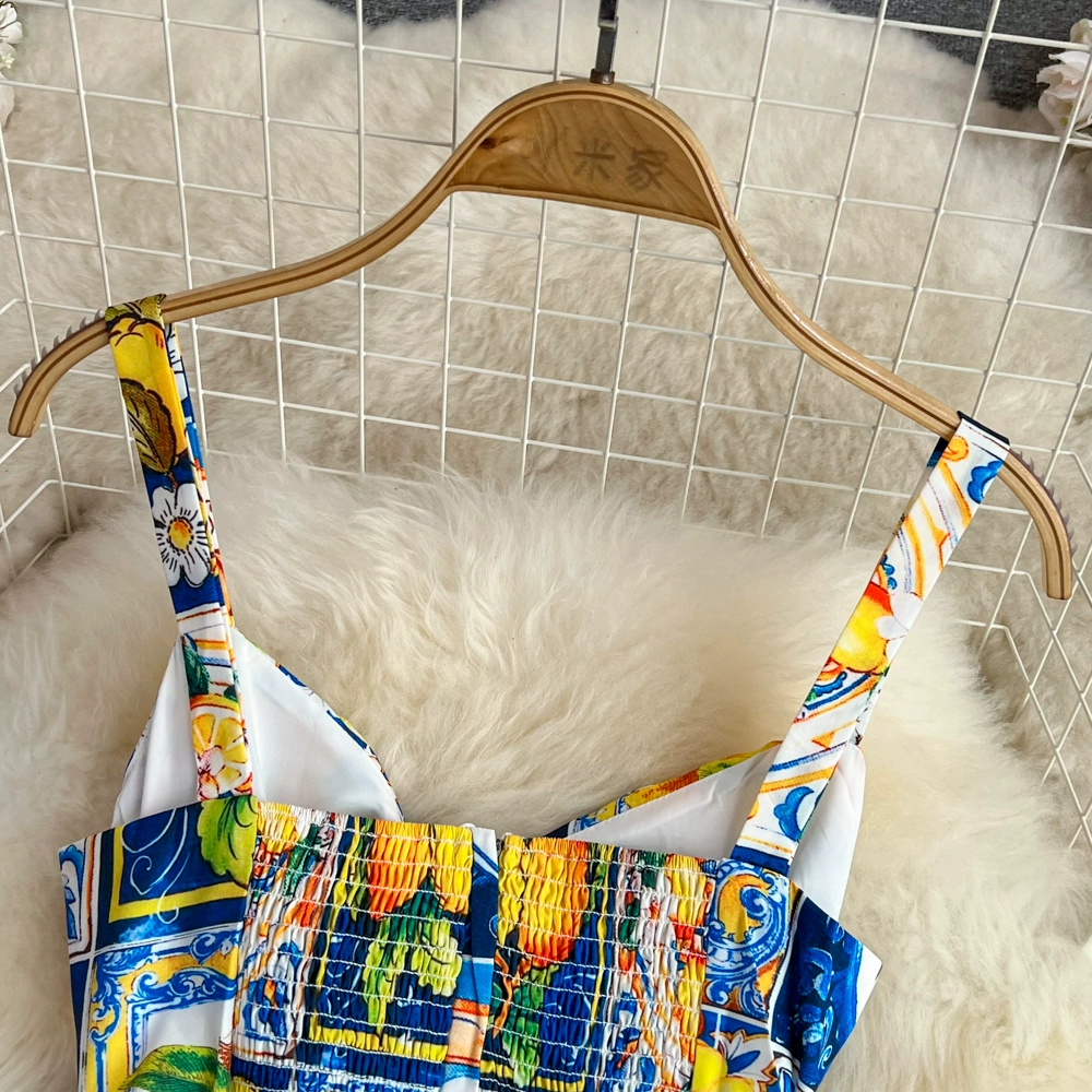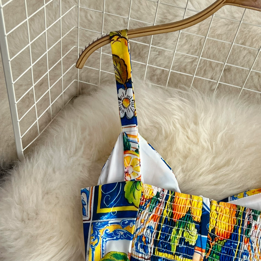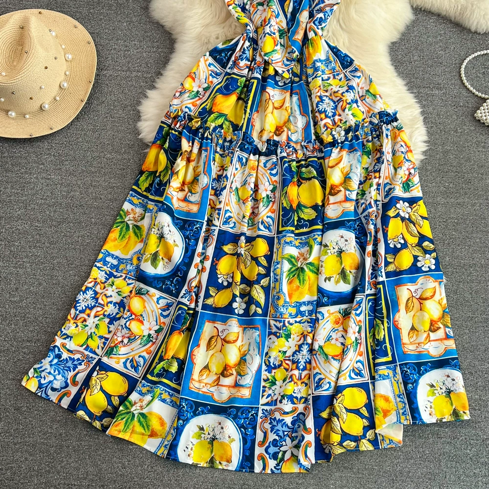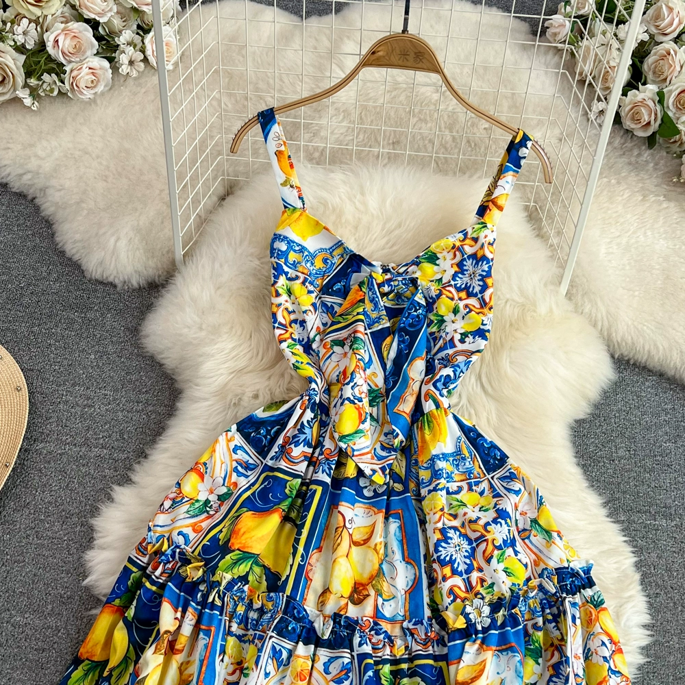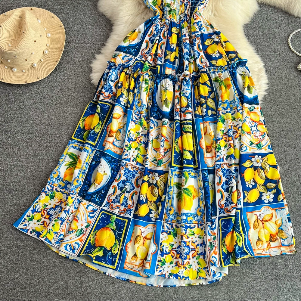 Fleepmart Summer Sexy Bow Spaghetti Strap Floral Lemon Print Dress Women Beach Backless Strapless High Elastic Waist Long Party Vestidos