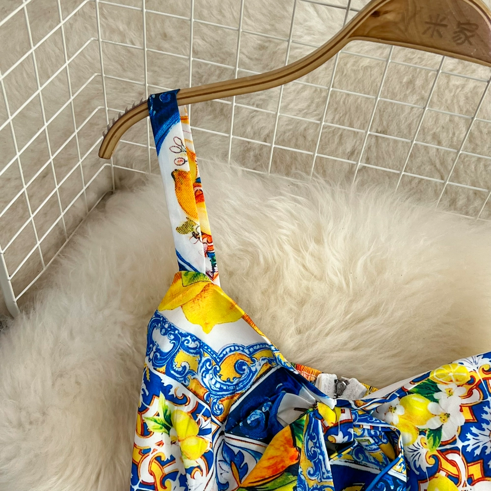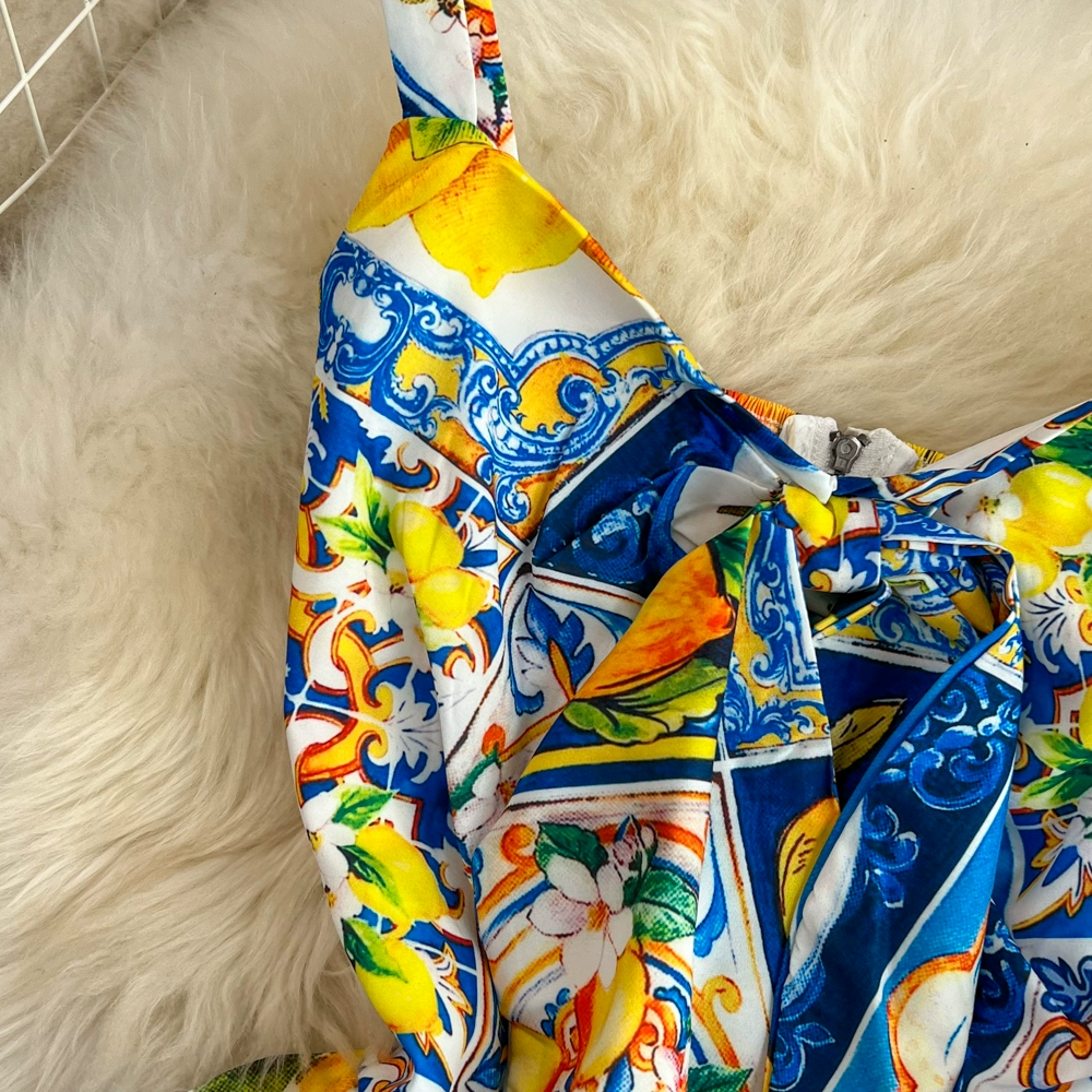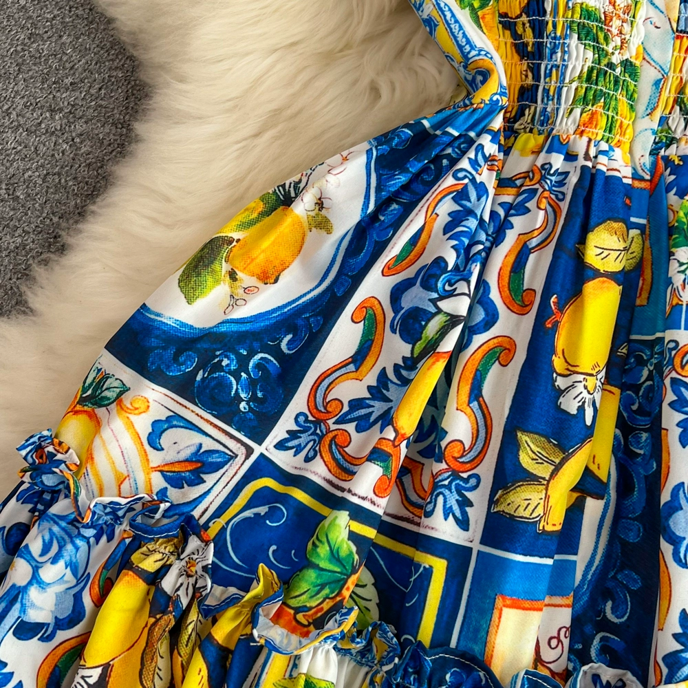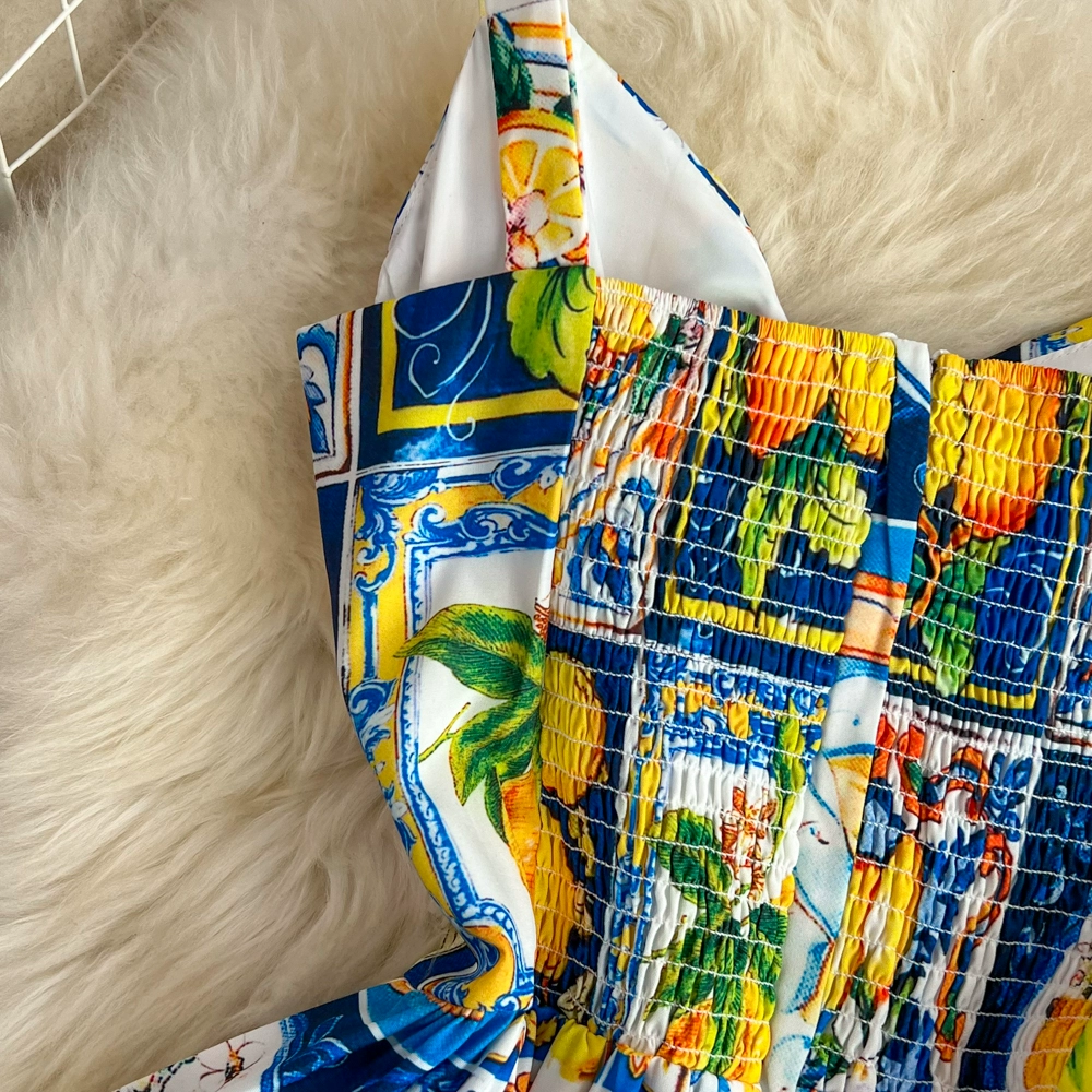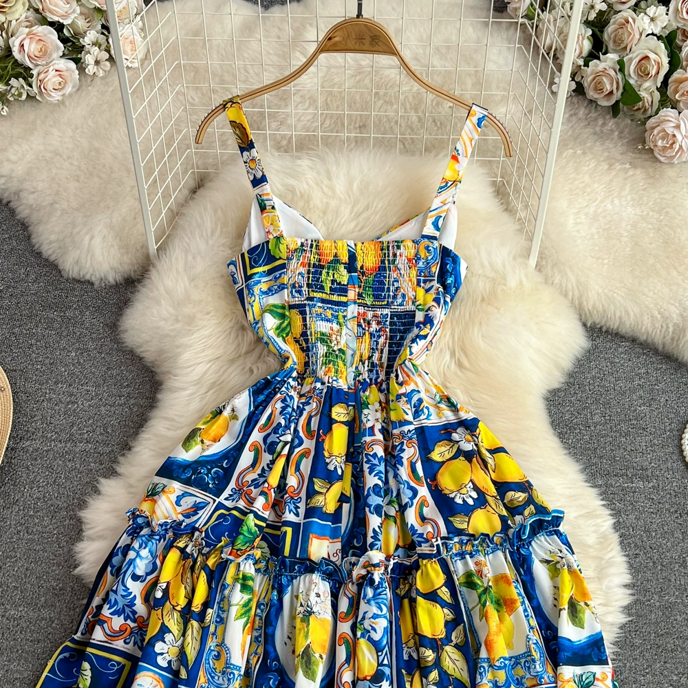 Fleepmart Summer Sexy Bow Spaghetti Strap Floral Lemon Print Dress Women Beach Backless Strapless High Elastic Waist Long Party Vestidos