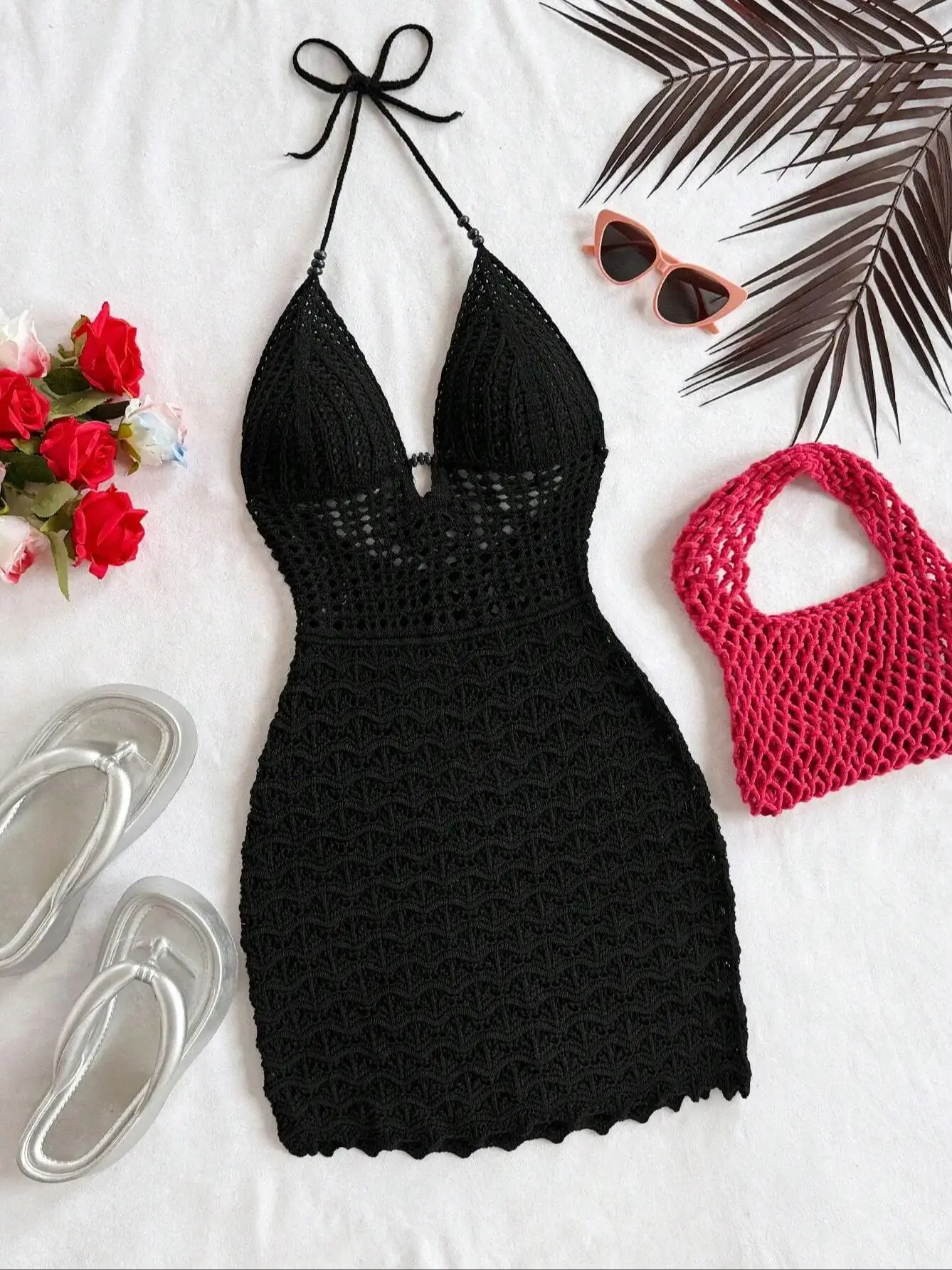 Fleepmart Summer Sexy V-Neck Hollow-Out Wooden Beads Fitted Dress, Vacation Spaghetti Strap Backless Ombre Knitted Dress, Suitable