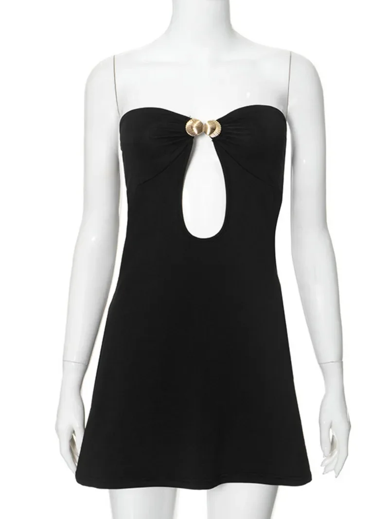 Fleepmart Summer Strapless Metal Decoration Beach Women’s Sleeveless Hollow Out Slim Backless Mini Wrap Dress