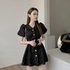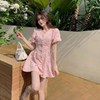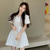 Fleepmart Summer V-neck Waist-fitted Mini Puff Sleeve 3D Embossed French Style Open-back Women