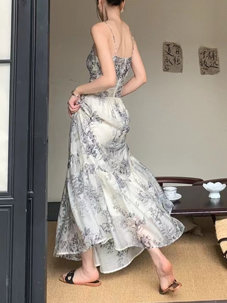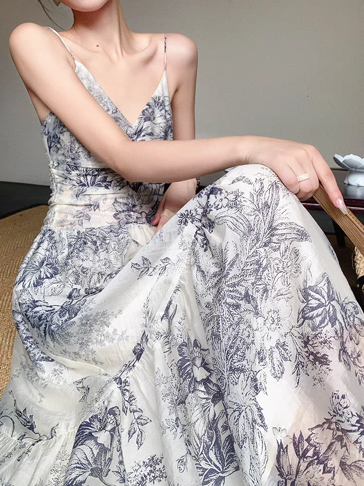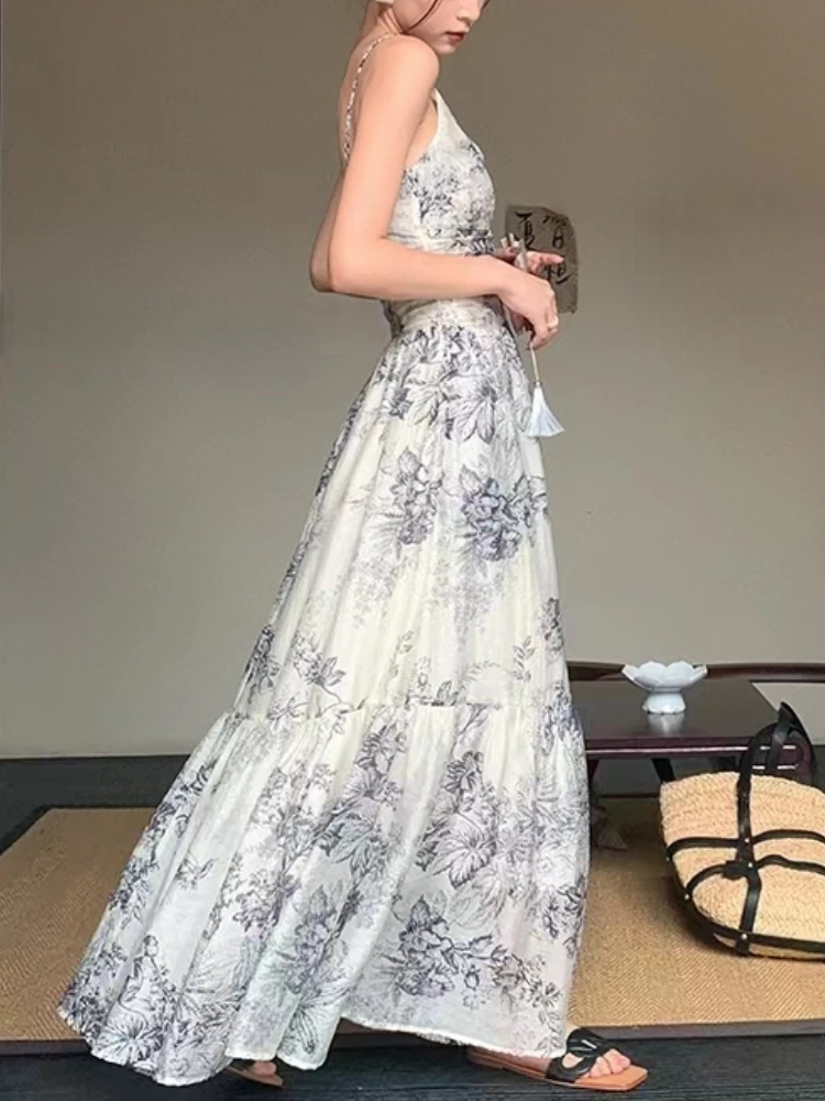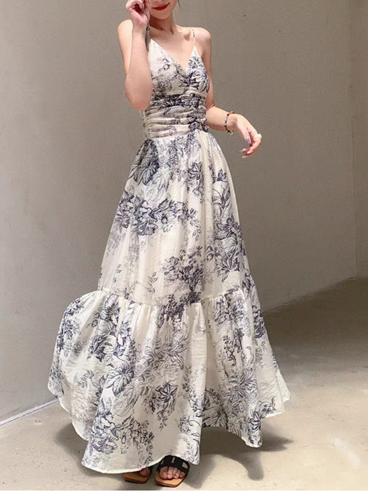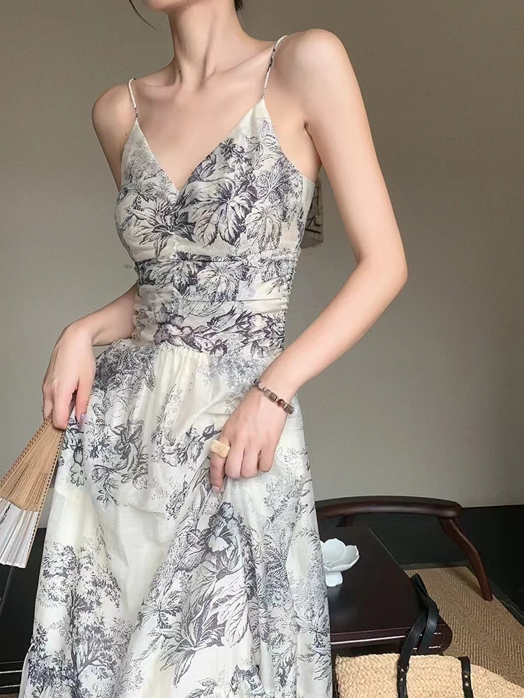 Fleepmart Summer Vintage Floral Beach Long Dresses Women Elegant Spaghetti Strap Party Prom Robe Female A-line Chiffon V-neck Clothes chic
