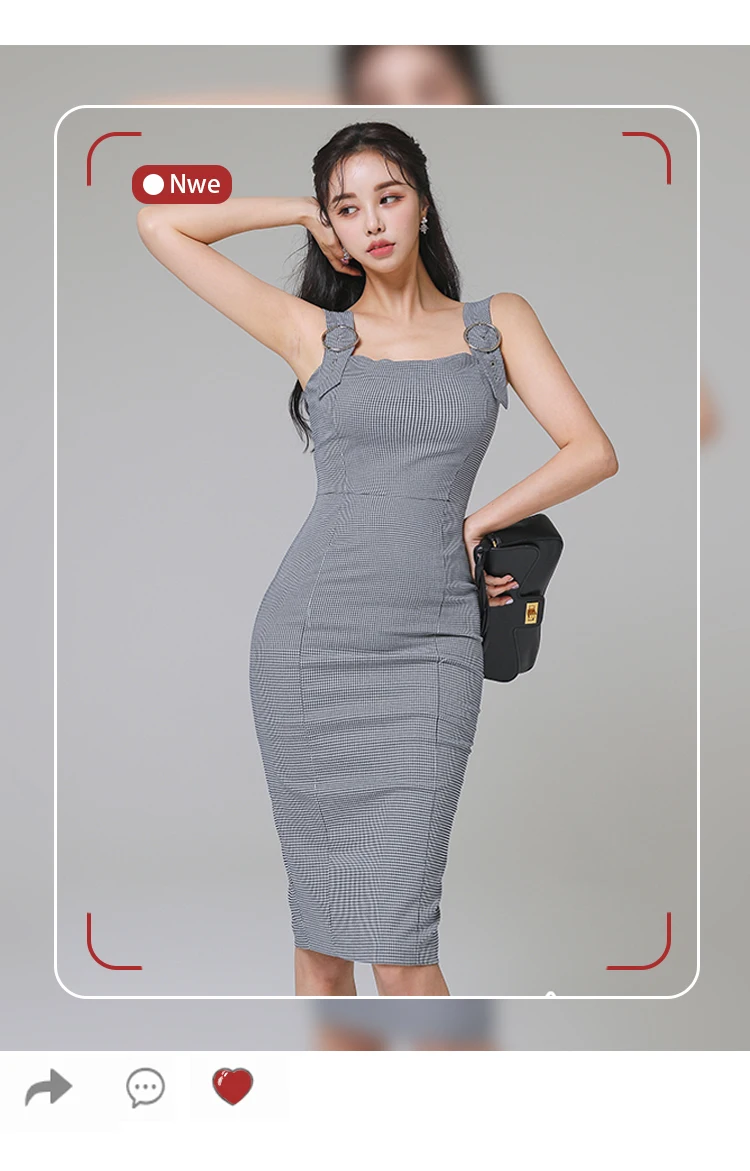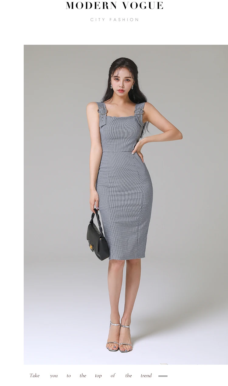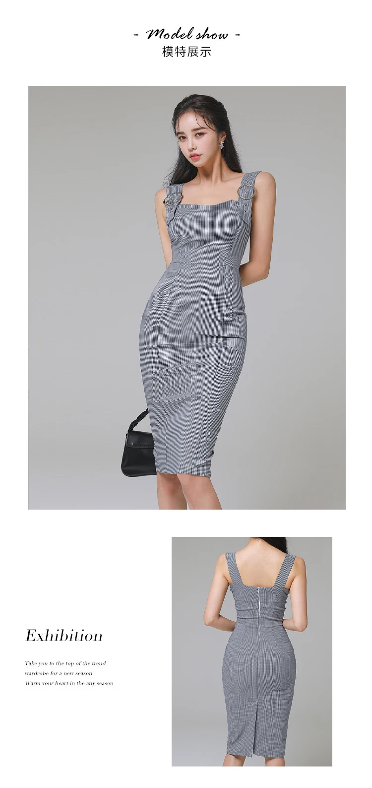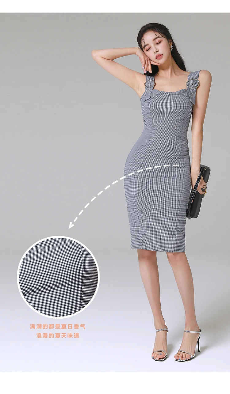Fleepmart Summer Vintage Plaid Sleeveless Back Slit Straps Bodycon Dress Formal Party Work