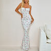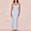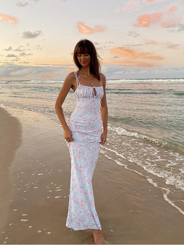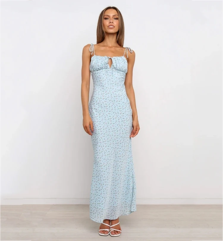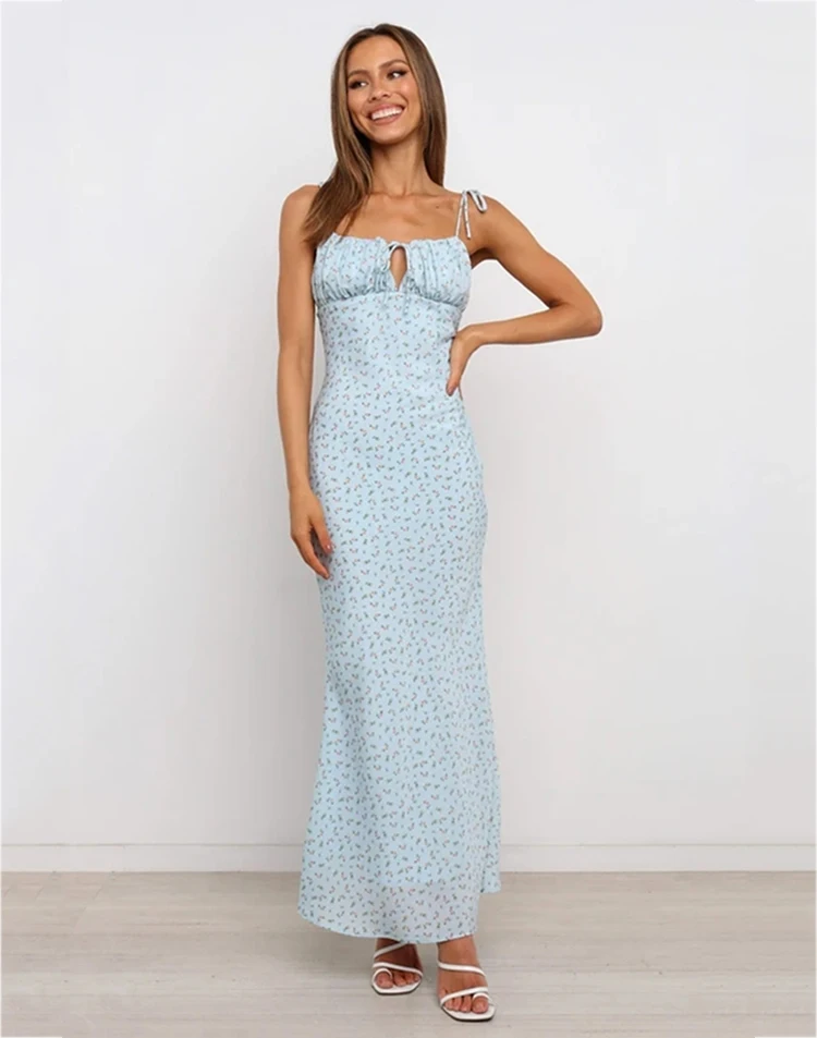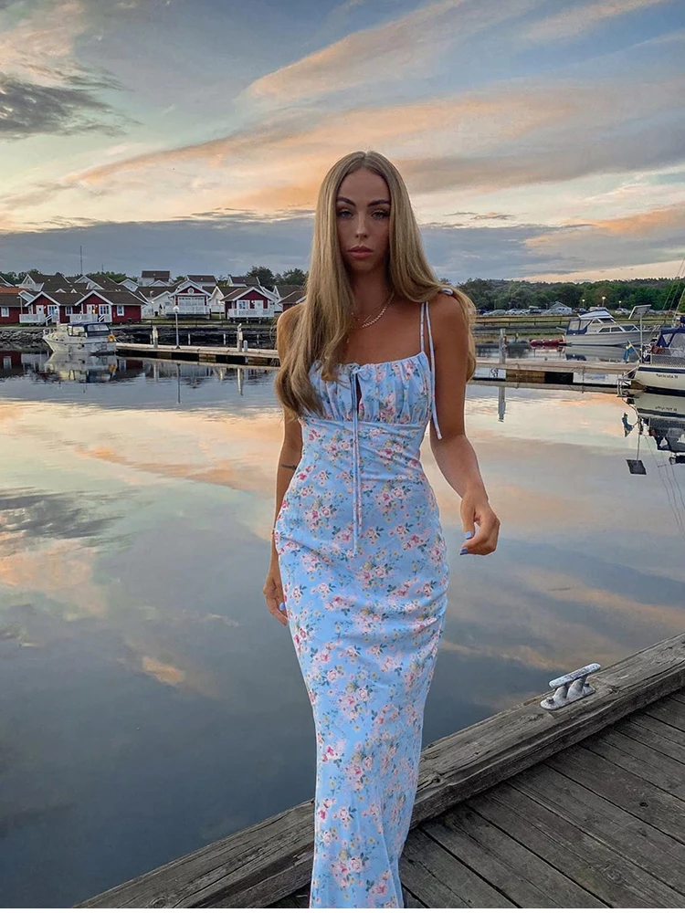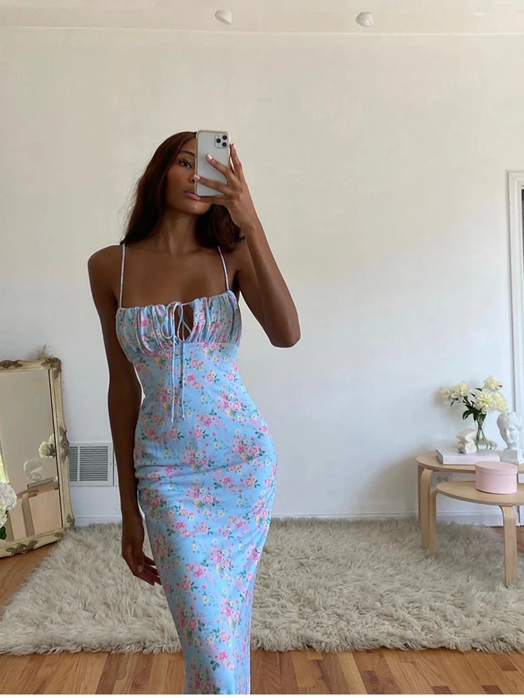 Fleepmart Summer Woman Blue Floral Dress Sexy Backless Sleeveless Bandage Ruched Maxi Dresses for Women Party Chic Lady Clothes