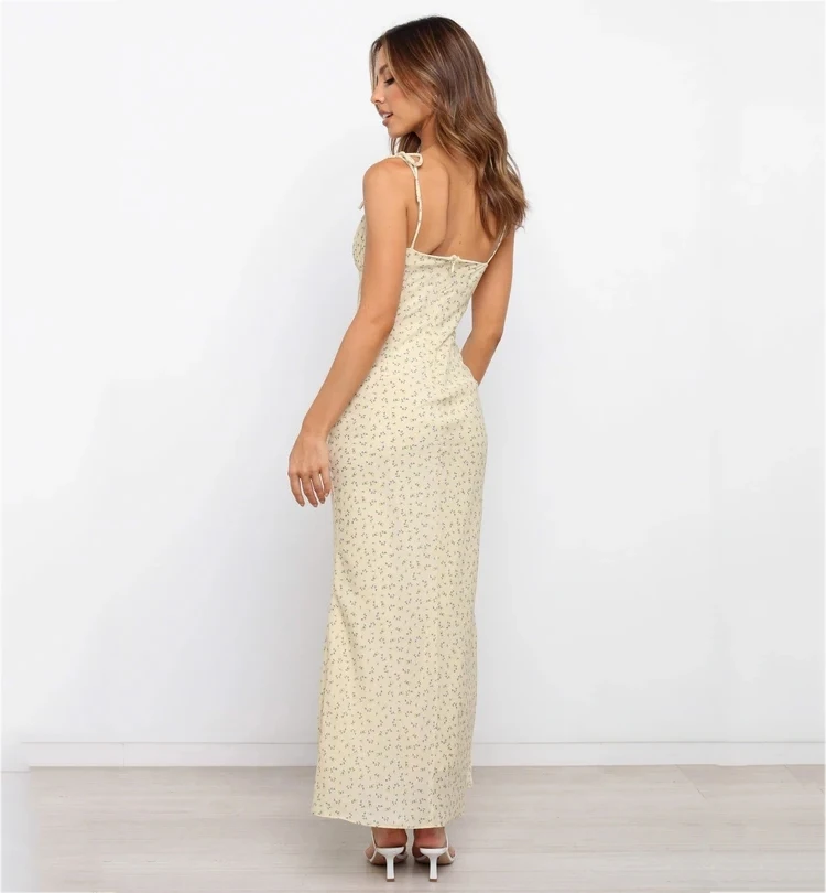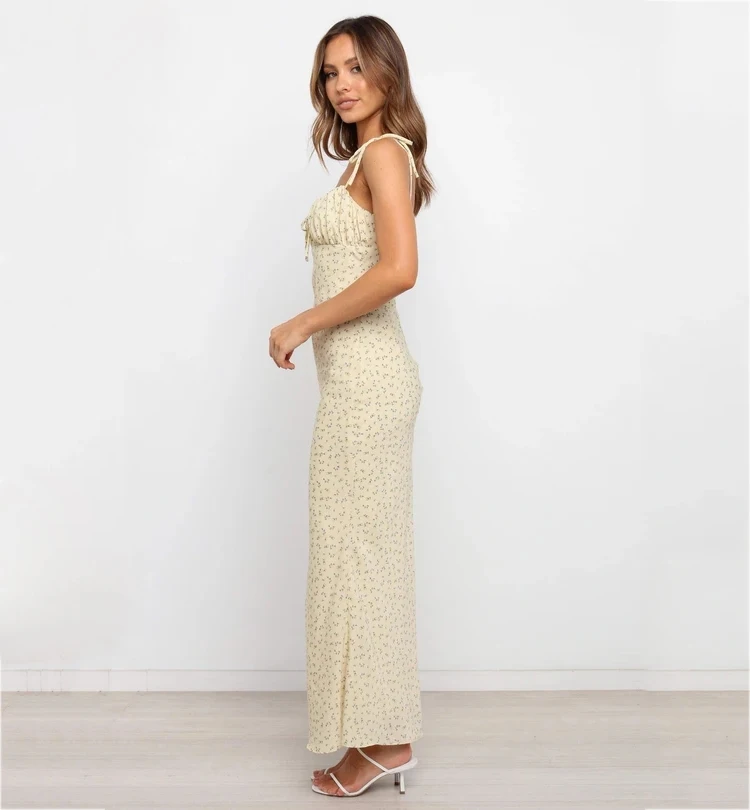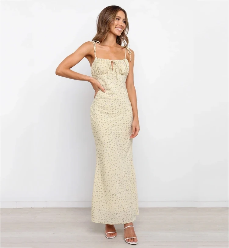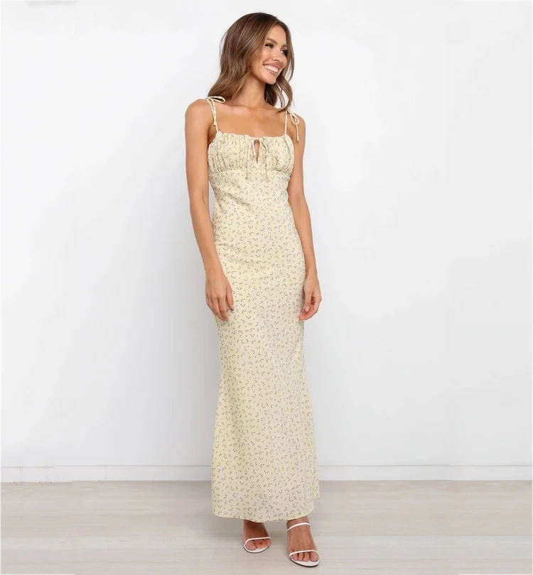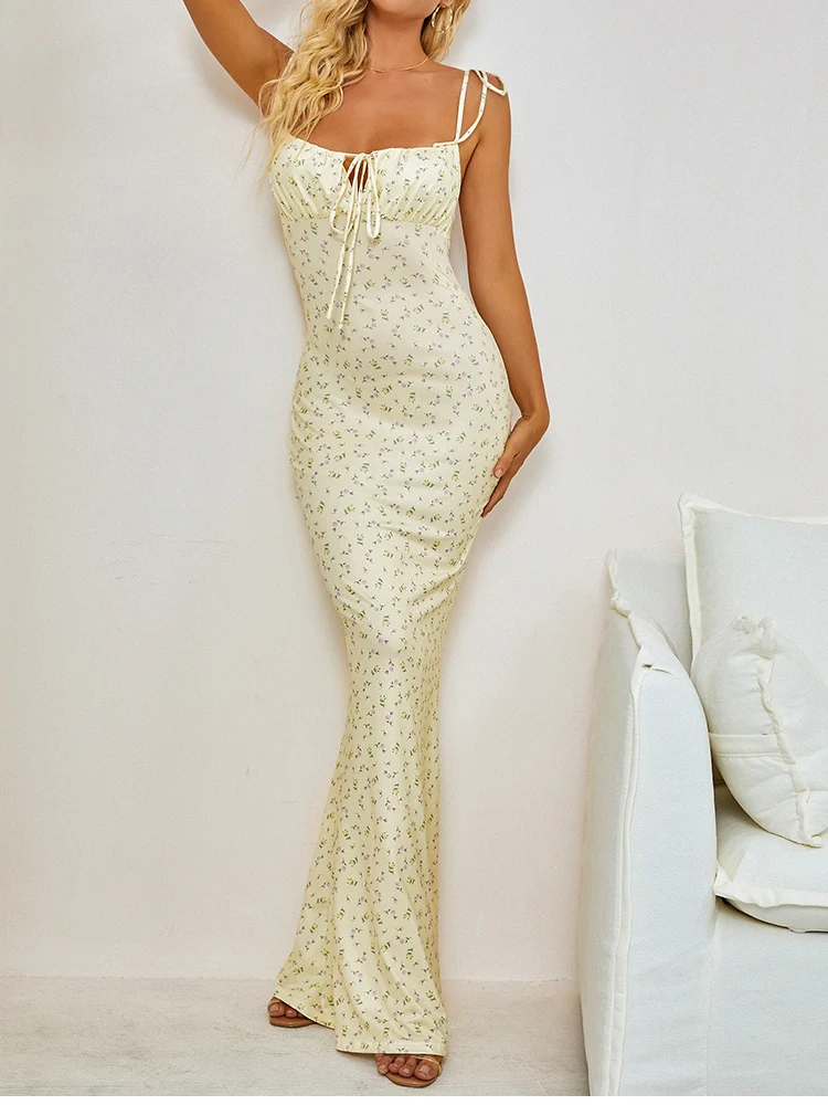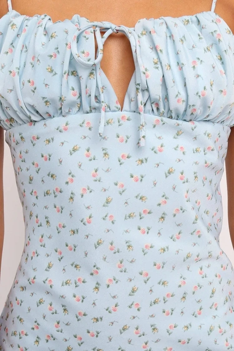 Fleepmart Summer Woman Blue Floral Dress Sexy Backless Sleeveless Bandage Ruched Maxi Dresses for Women Party Chic Lady Clothes
