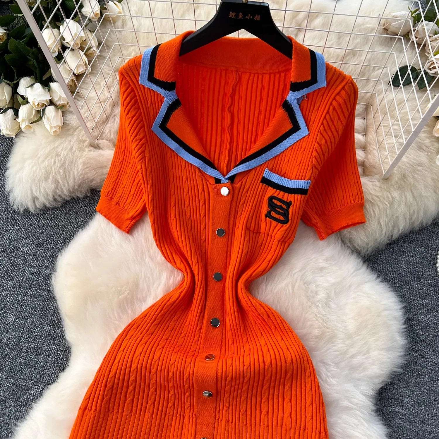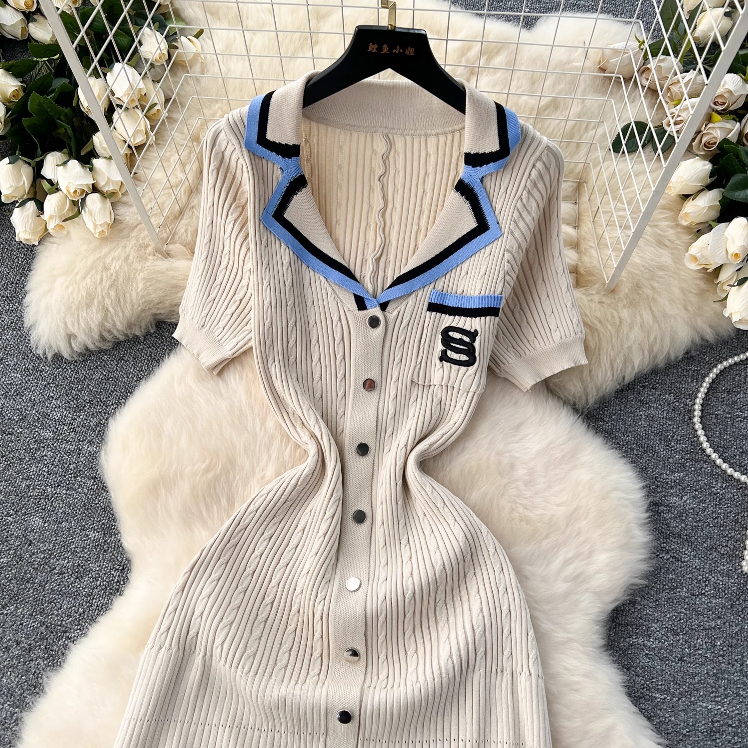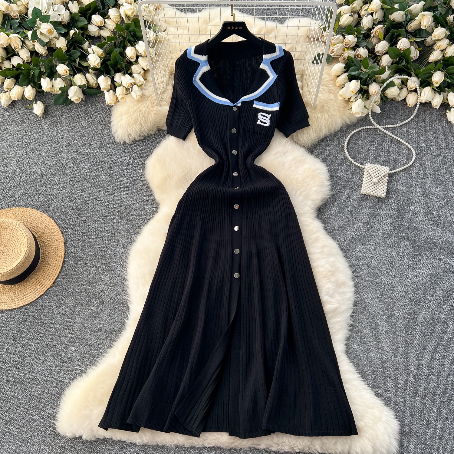 Fleepmart Summer Women Knitted Long Dress Brand Fashion Turn-down Collar A-line Sweater Dress Elegant Lady Office Dress Robe