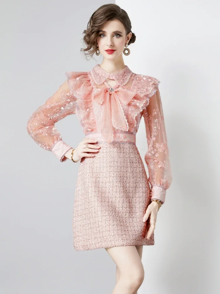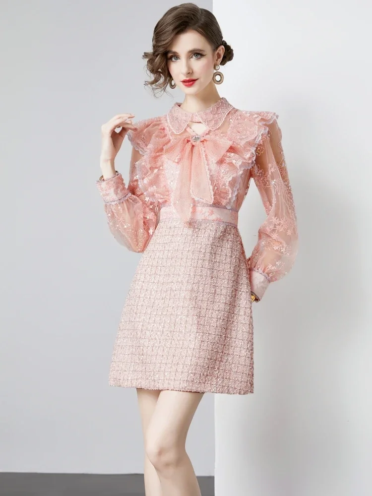 Fleepmart Sweet Girls Mesh Lace Luxury Flower Embroidery Dress For Women’s Bow Collar Ruffles Patchwork Tweed Party Mini Vestidos