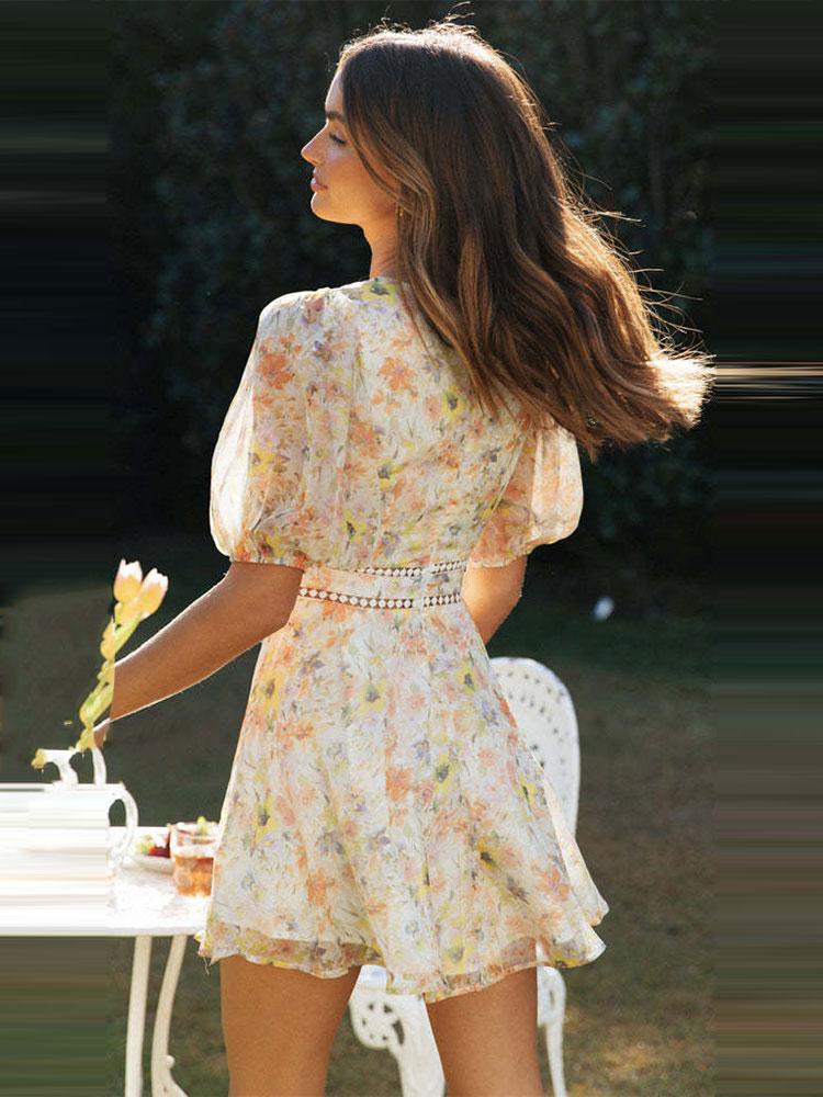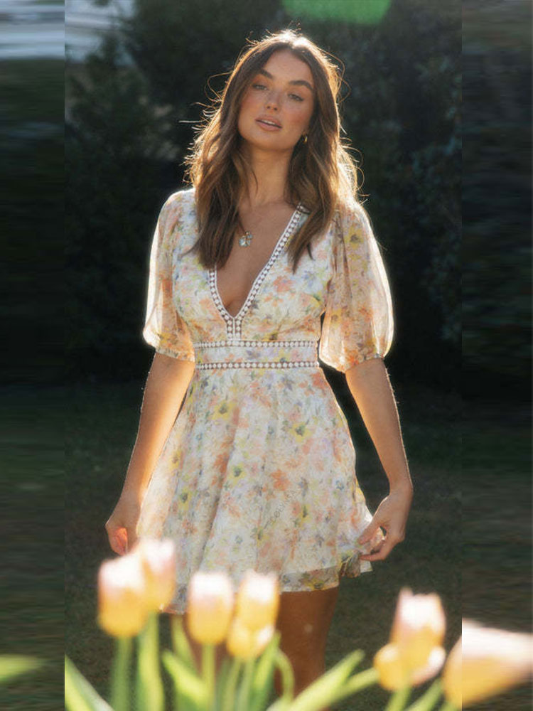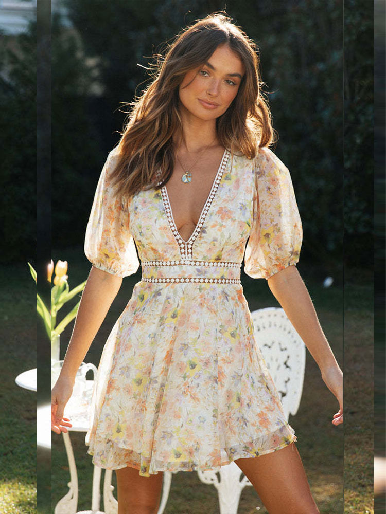 Fleepmart Sweet Yellow Sexy Deep V Neck Cut Out A-Line Dress Slim Tunic Women 2023 Summer Bohemian Printed Puff Sleeve Mini Dresses