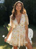 Fleepmart Sweet Yellow Sexy Deep V Neck Cut Out A-Line Dress Slim Tunic Women 2023 Summer Bohemian Printed Puff Sleeve Mini Dresses