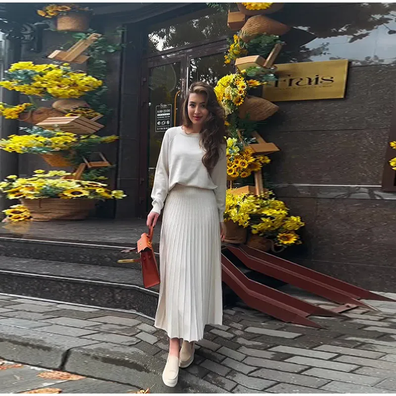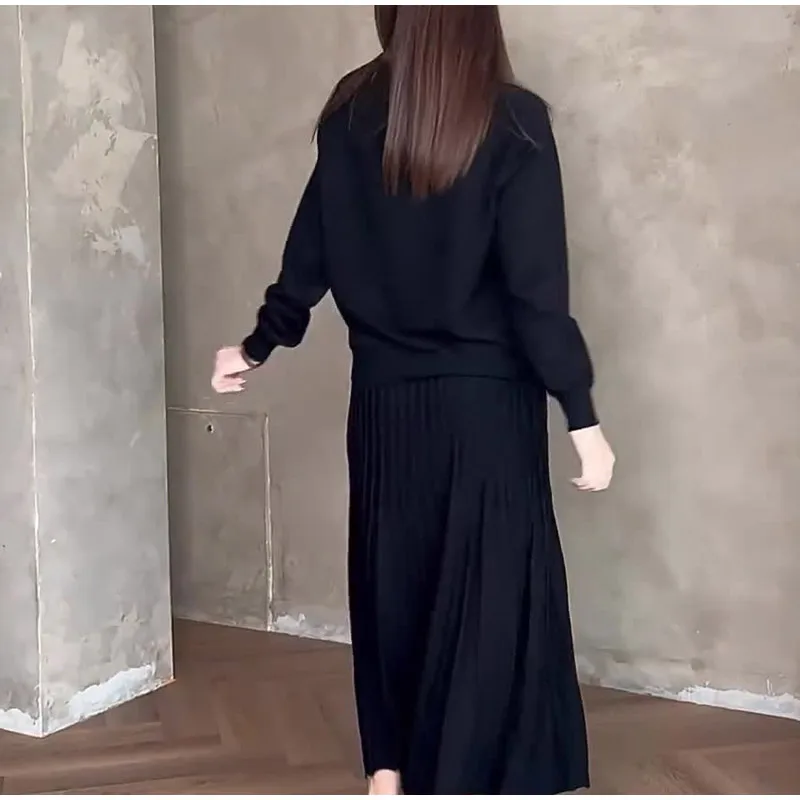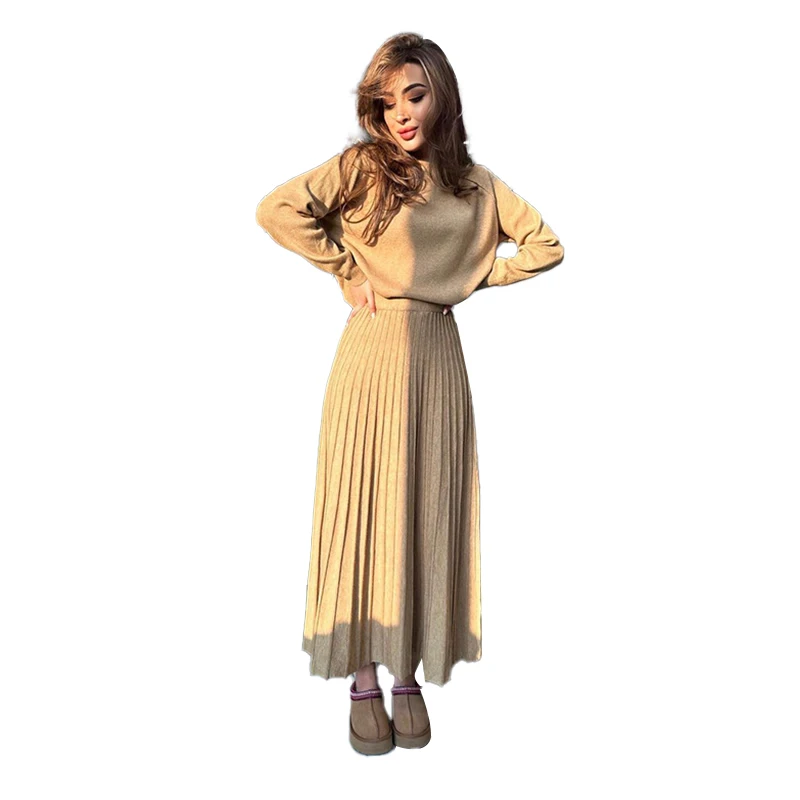 Fleepmart T-shirt Pleated Skirts Set Women Casual O-neck Long Sleeve Top A-line Long Skirt 2 Piece Set Female 2024 Spring New Outfits