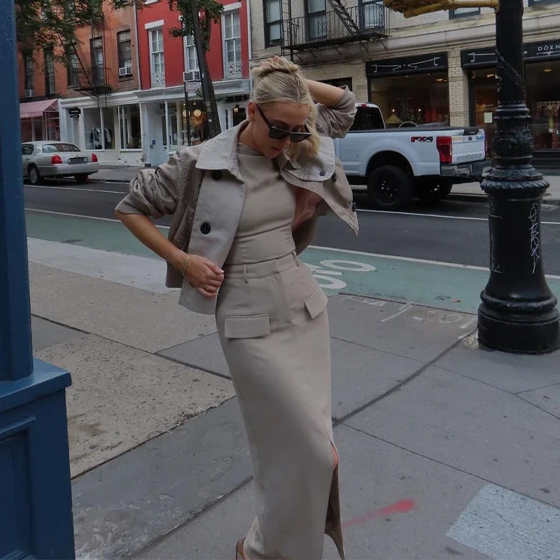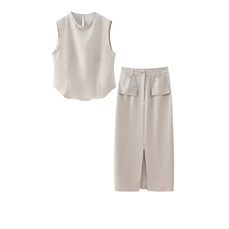 Fleepmart Tank Top Skirt Suits Women Sleeveless O-neck Slim Vest Split Zipper Midi Skirts 2024 Spring Summer Female Elegant 2 Pieces Set