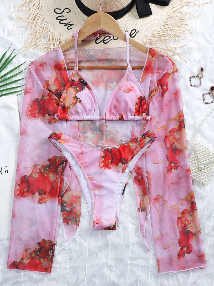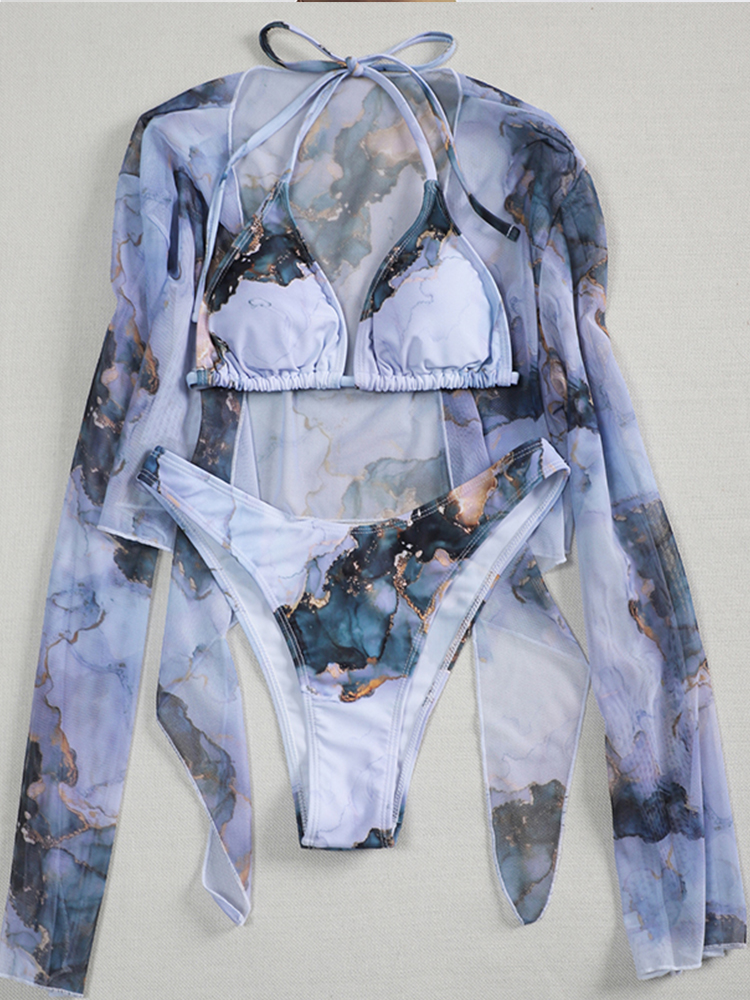 Fleepmart Tie-dye print 3 piece swimsuit female Sexy mesh bikini 2023 Long sleeve swimwear women Knot biquini Beach wear bathing suit