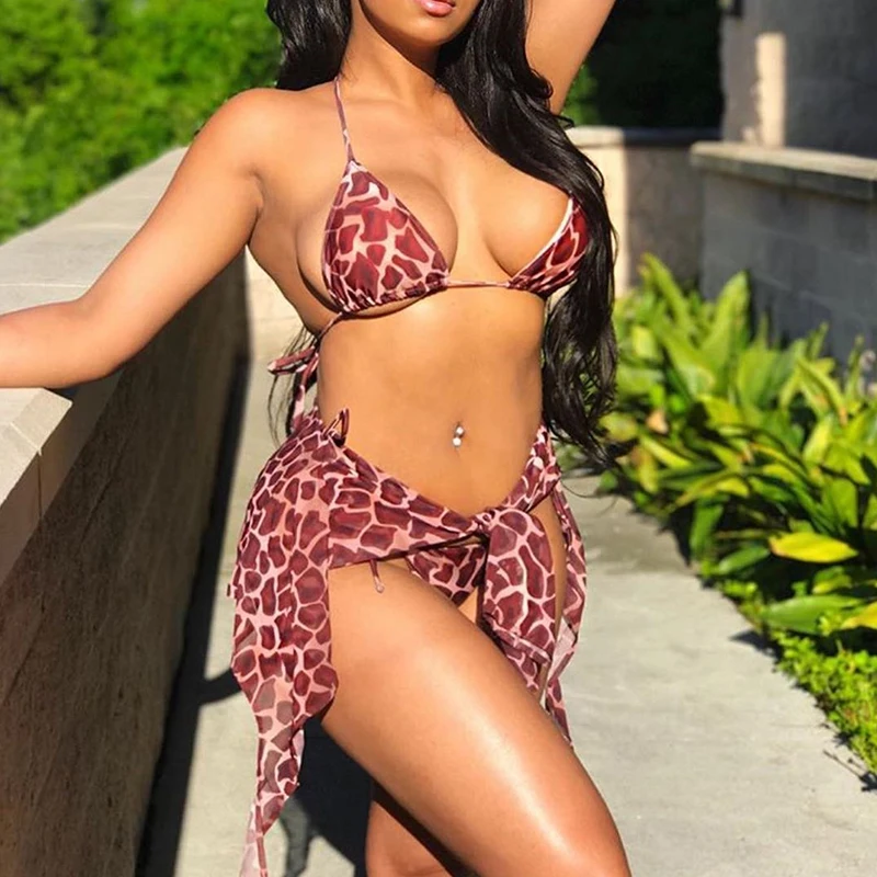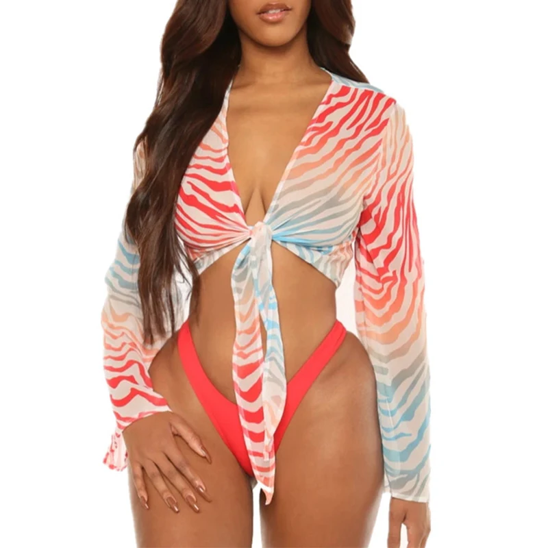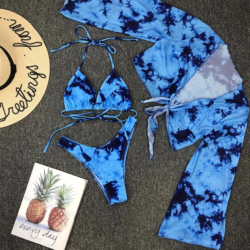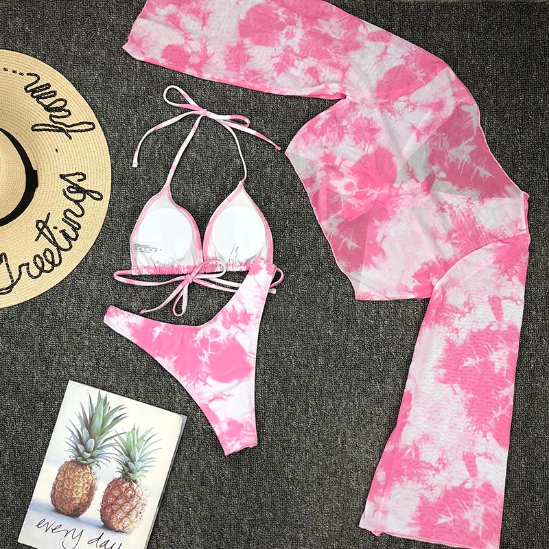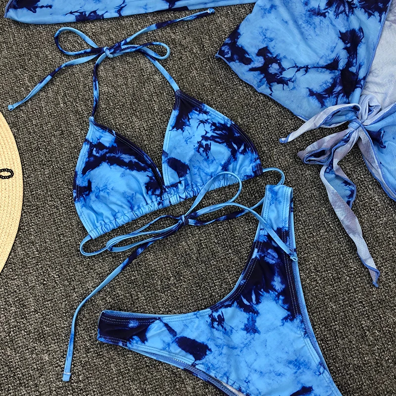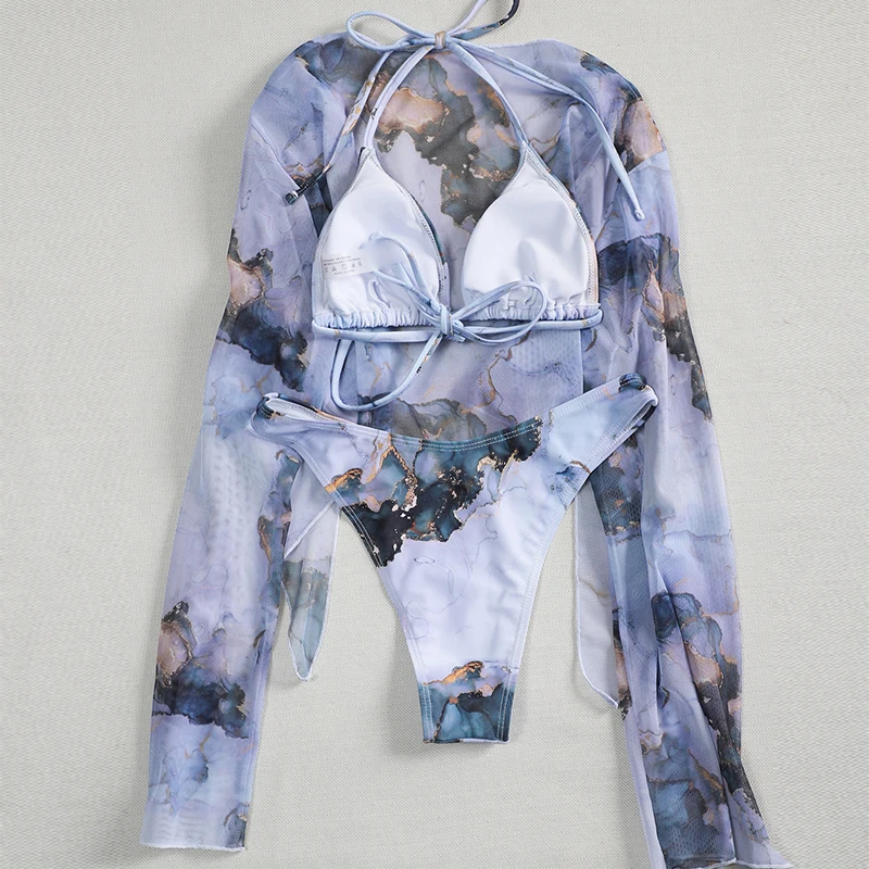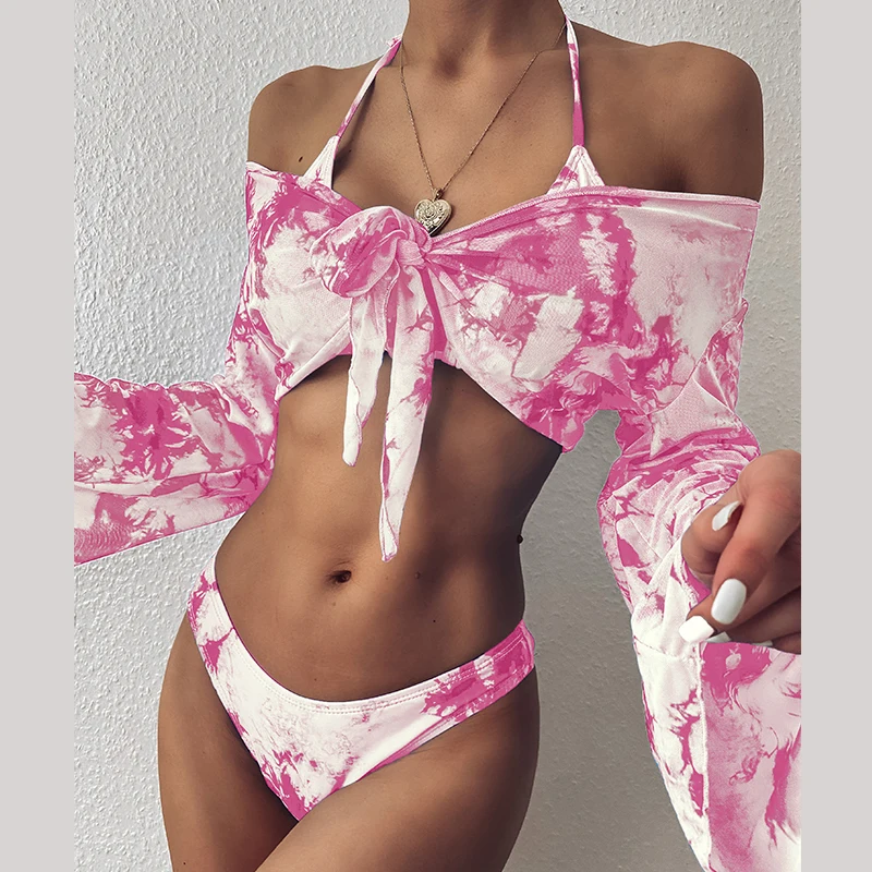 Fleepmart Tie-dye print 3 piece swimsuit female Sexy mesh bikini 2023 Long sleeve swimwear women Knot biquini Beach wear bathing suit