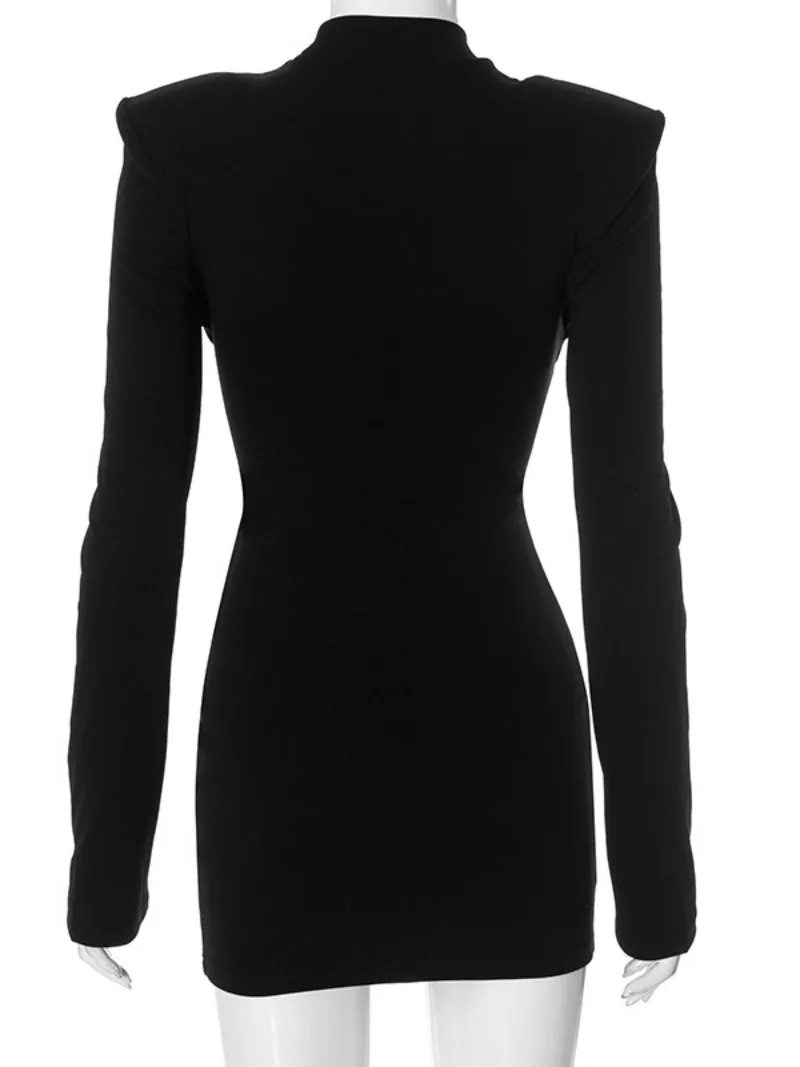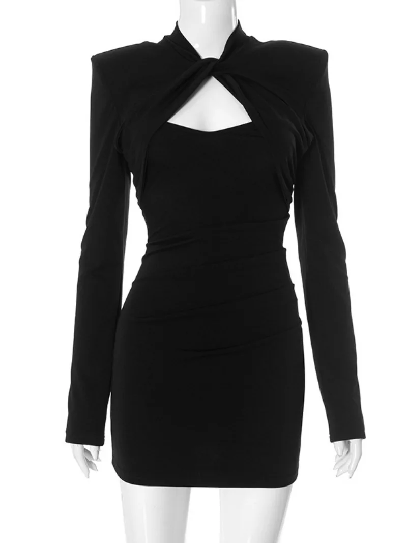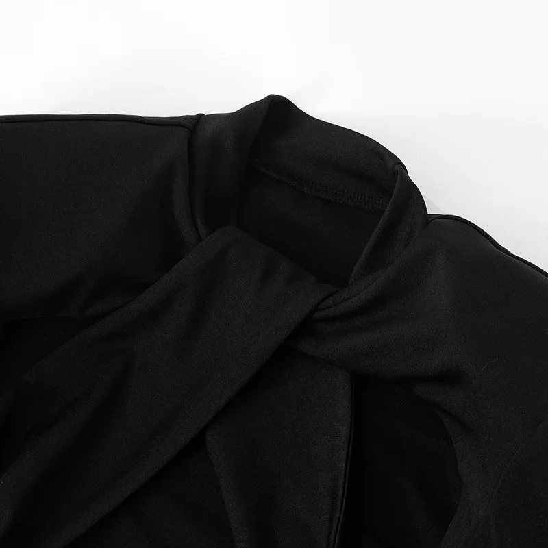 Fleepmart Tie Knot Shoulder Pads Short Women’s Hollow Out Long Sleeve High Waist Tunics Solid Black Party Dress Streetwear