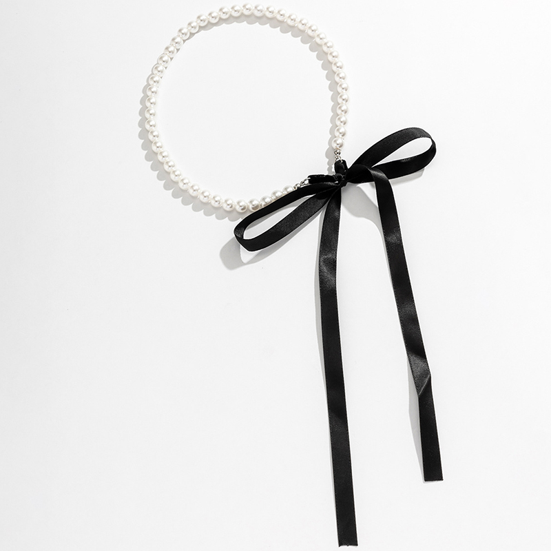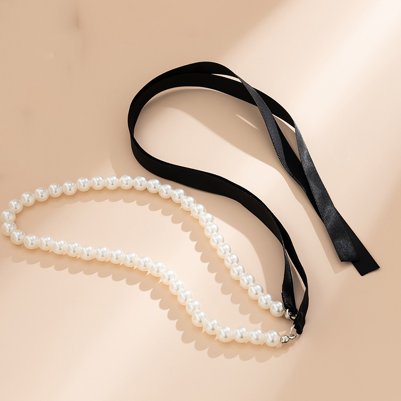 Fleepmart Trend Wedding Party Jewelry Long Black Ribbon Choker Necklace For Women Elegant White Imitation Pearl Beach Vacation Necklaces