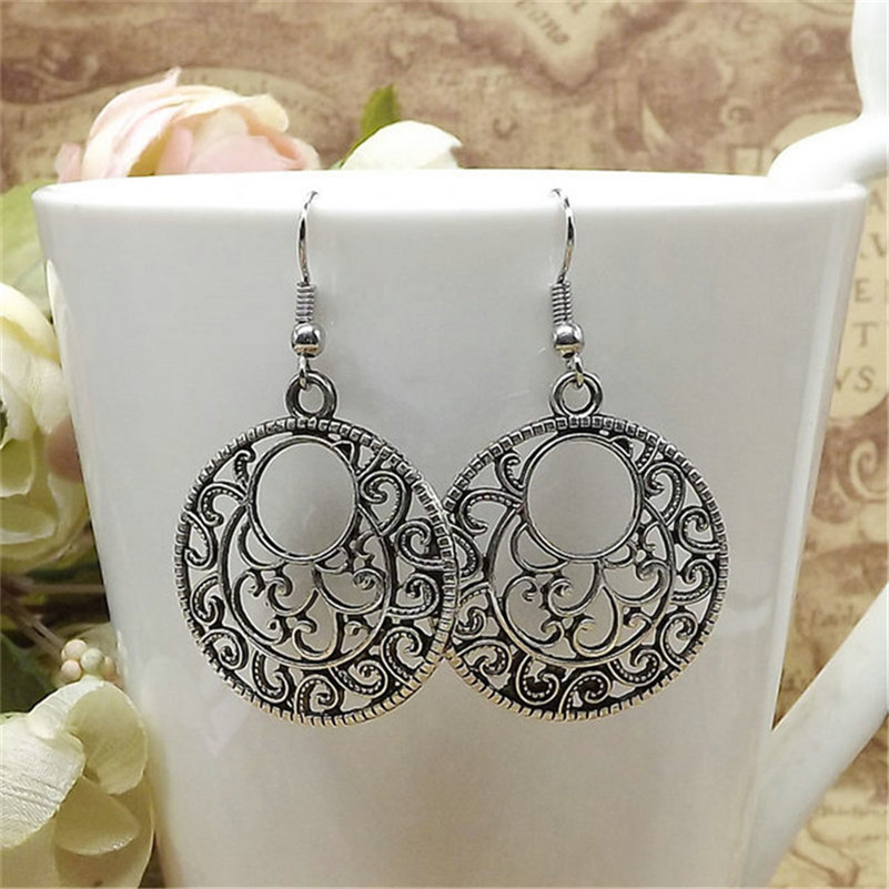 Fleepmart Trendy Jewelry Bohemian Vintage Ethnic Tibetan Silver Long Big Hollow Round Drop Earring Carved Flowers dangle Earrings Women
