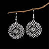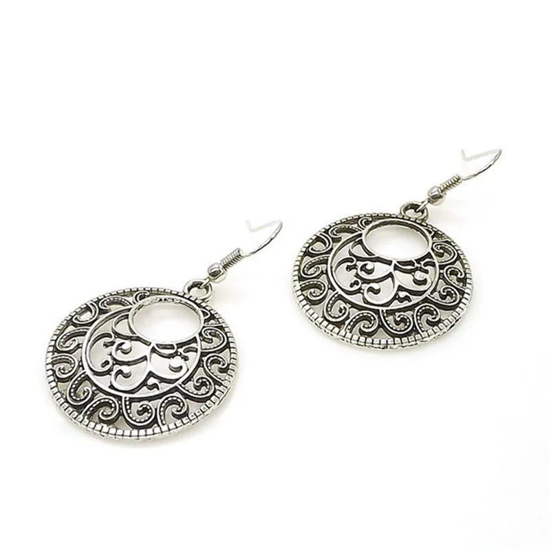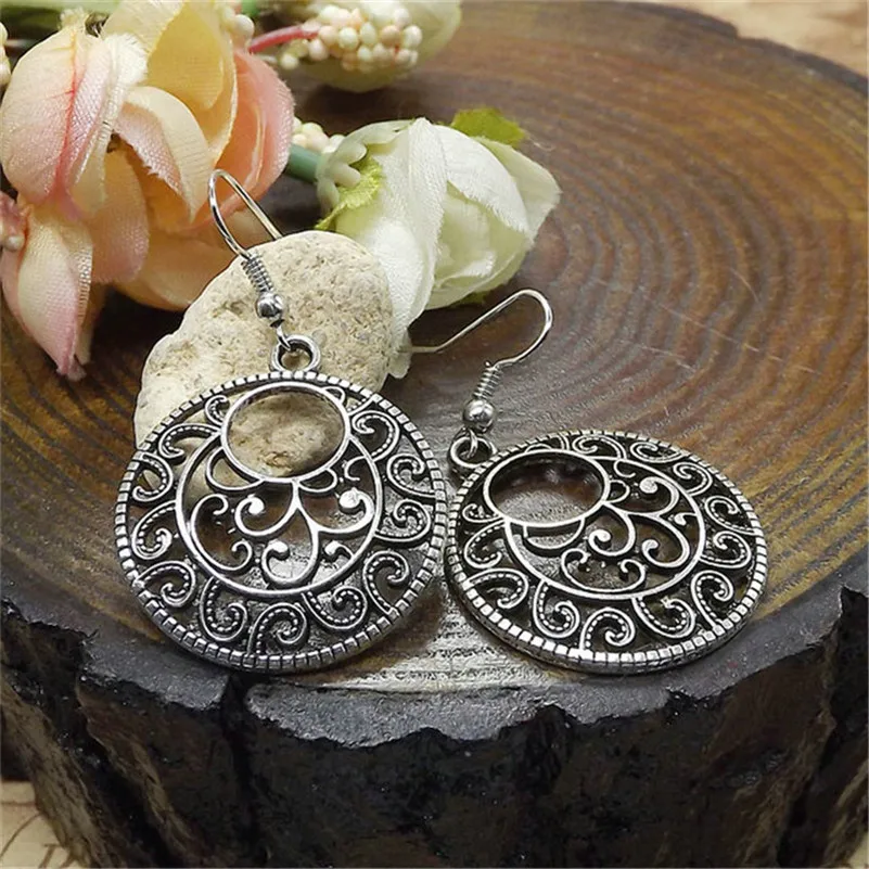 Fleepmart Trendy Jewelry Bohemian Vintage Ethnic Tibetan Silver Long Big Hollow Round Drop Earring Carved Flowers dangle Earrings Women