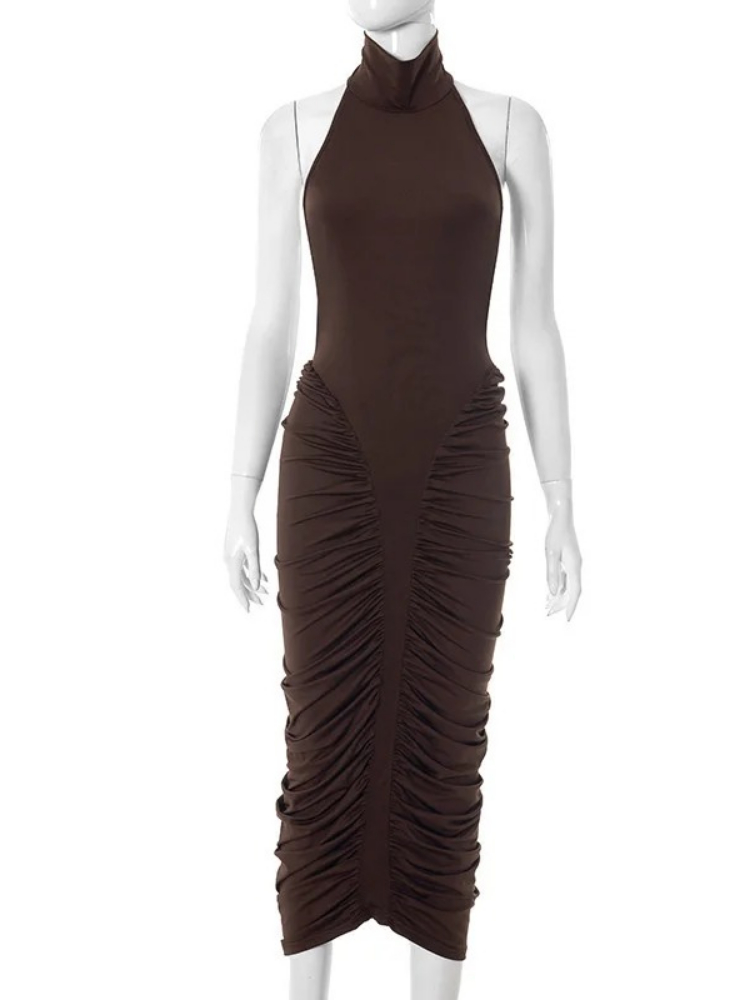 Fleepmart Turtleneck Backless Ruched Sexy Maxi Dress Women Brown Off-shoulder Backless Bodycon Club Party Long Dresses Female