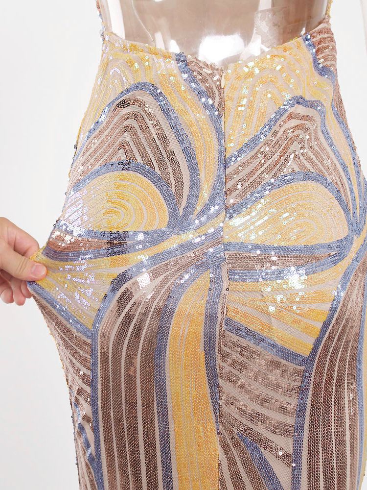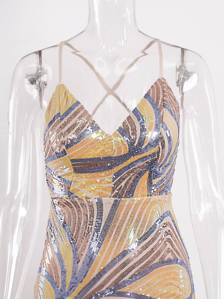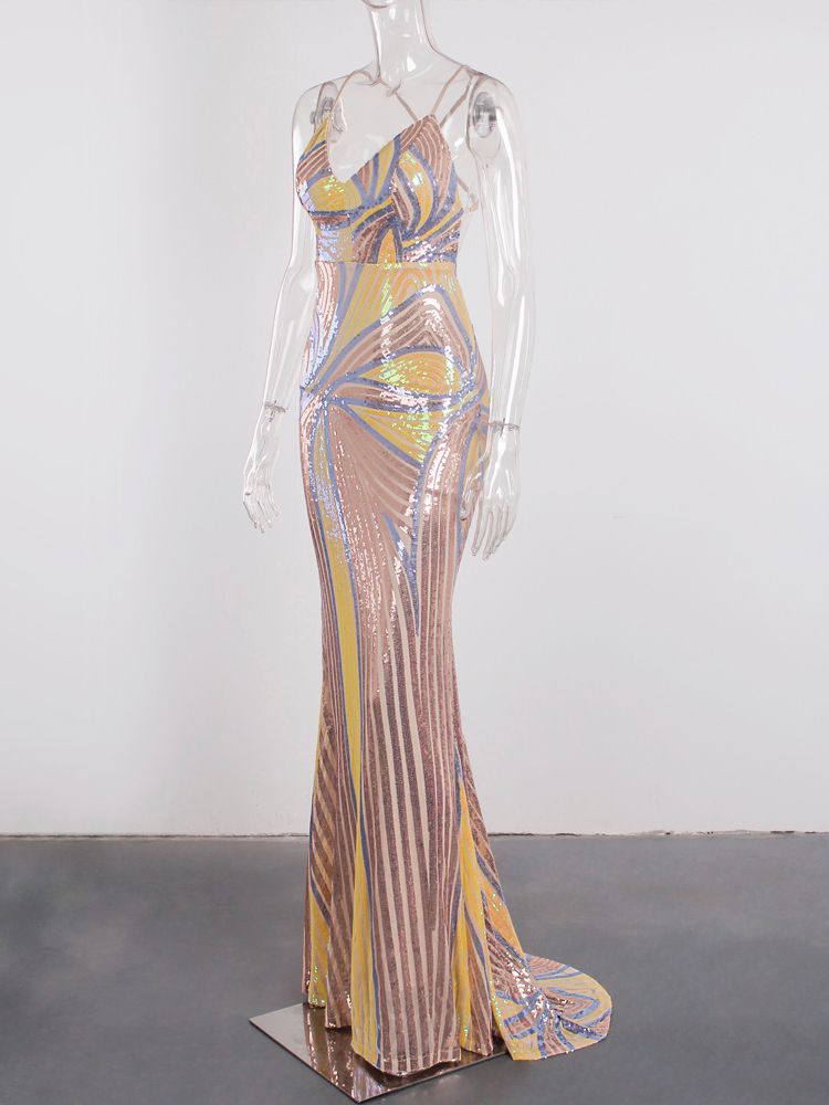 Fleepmart V Neck Backless Sequined Maxi Dress Formal Sexy Long Sleeveless Night Evening Party Gown