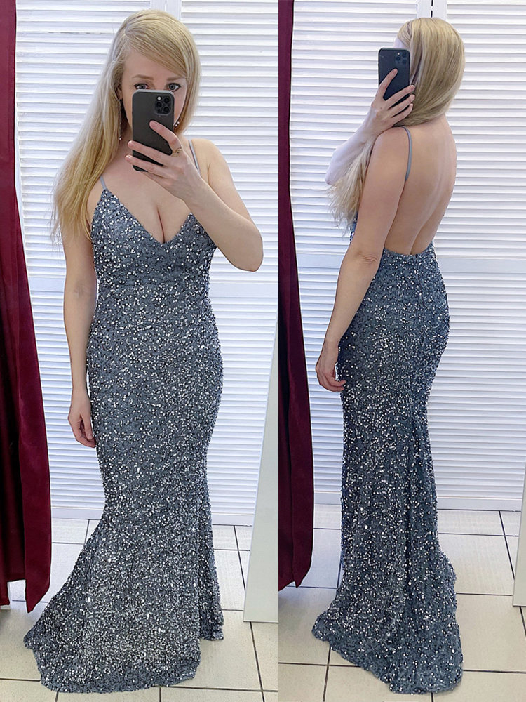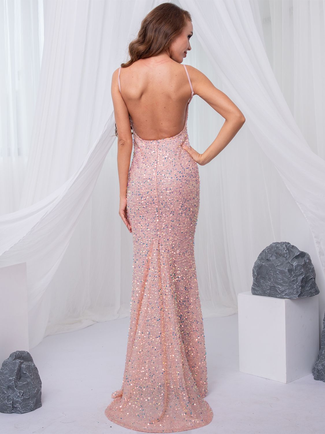 Fleepmart V Neck Backless Sleeveless Mermaid Maxi Dress Sexy Evening Party Long Gown Grey Pink