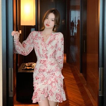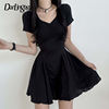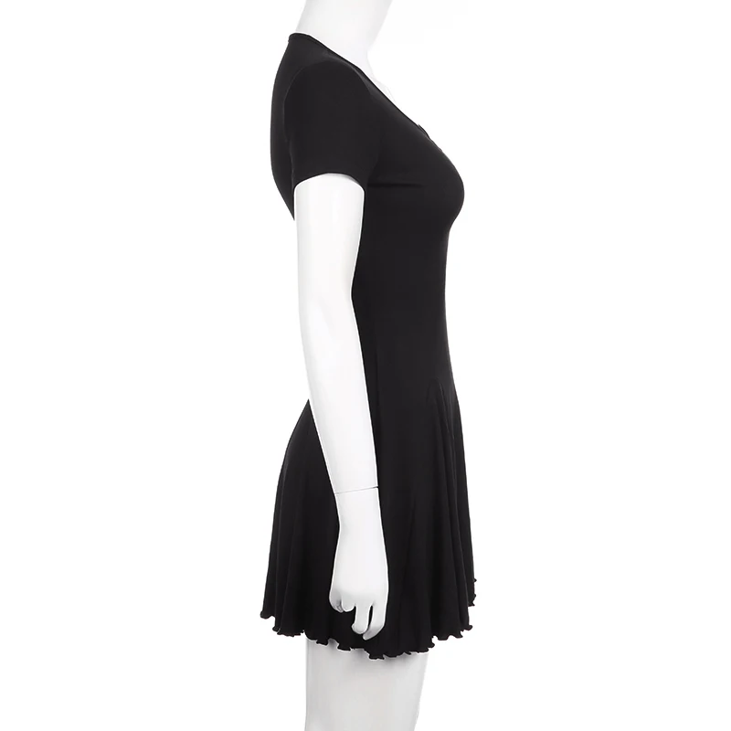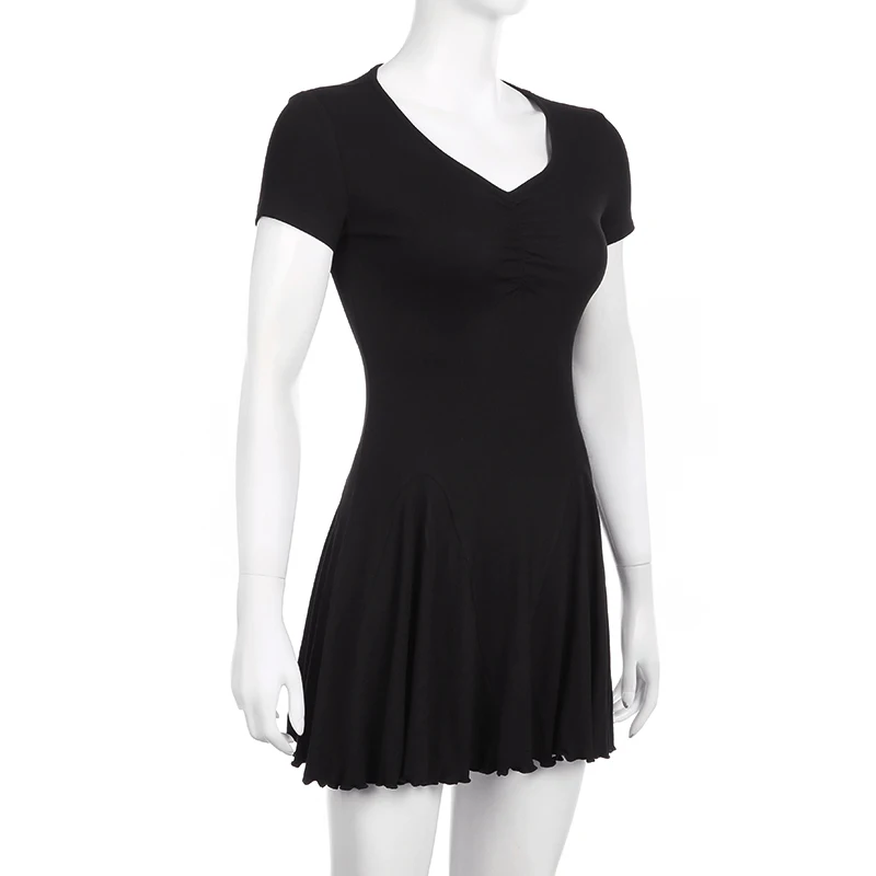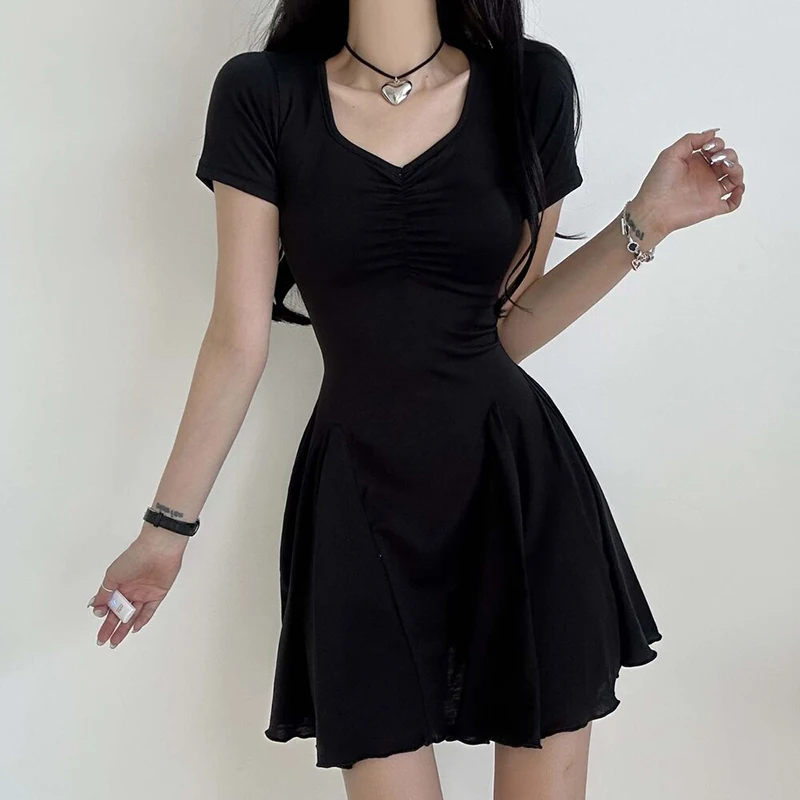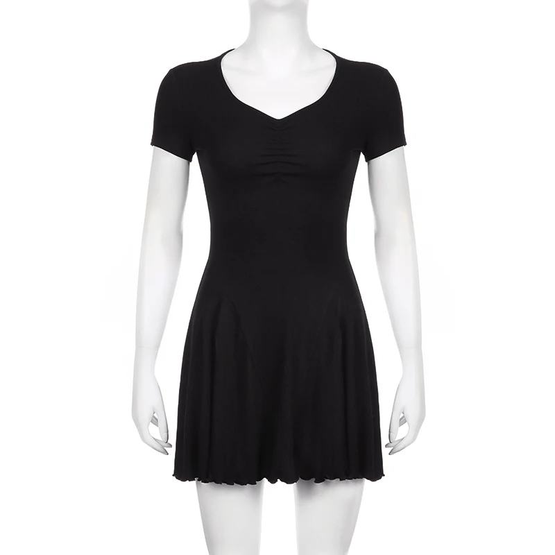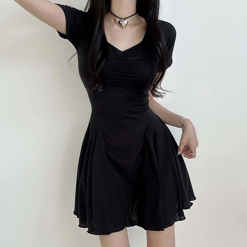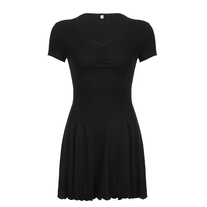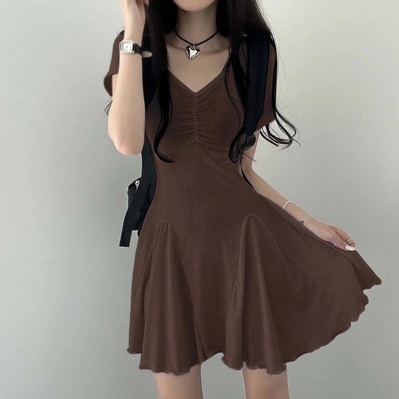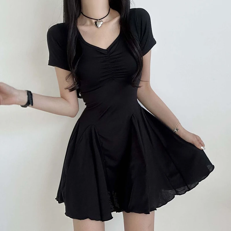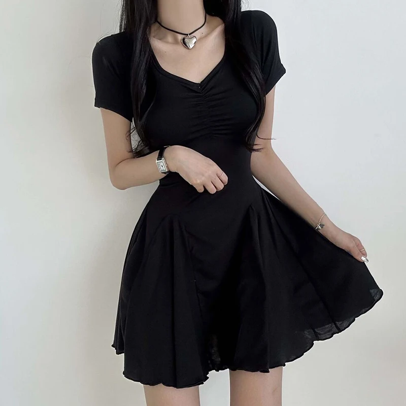 Fleepmart V Neck Folds Folds Basic Short Casual Dress for Women Korean Fashion A-Line Sundress Draped Summer Dresses Clothing