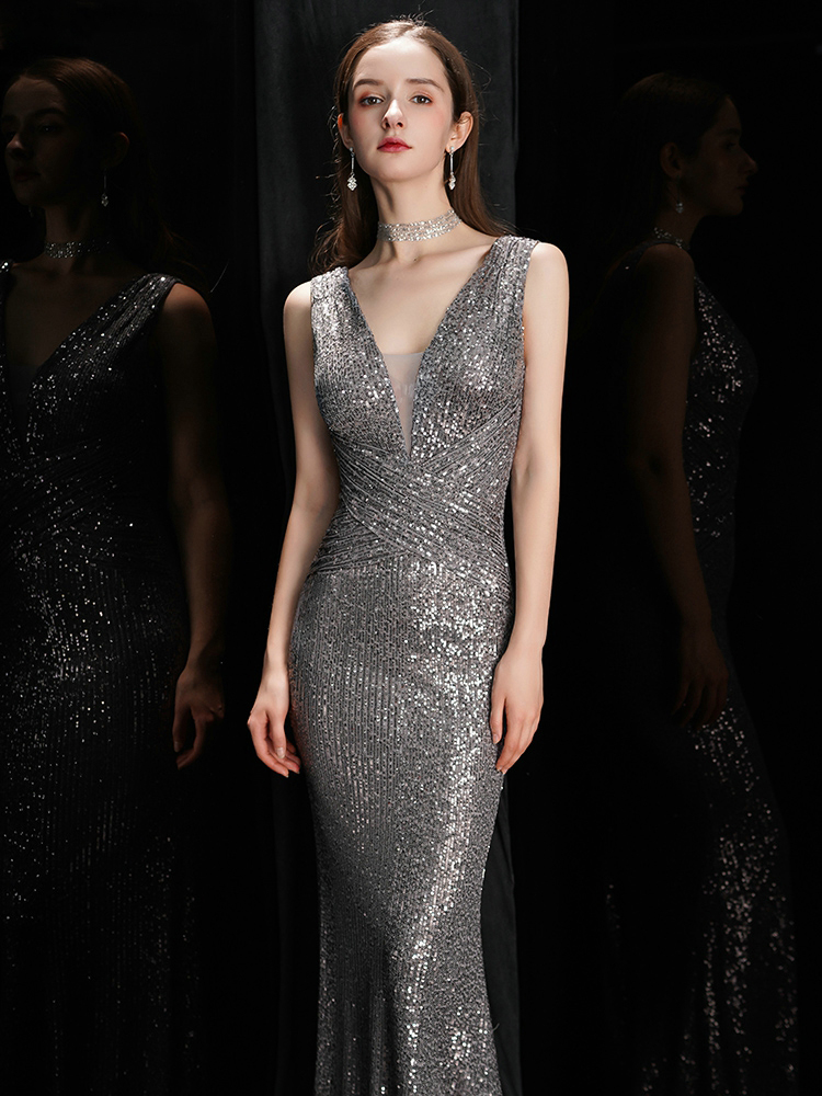 Fleepmart V Neck Gray Sequins Evening Dress Elegant Party Maxi Dress Long Prom Dress