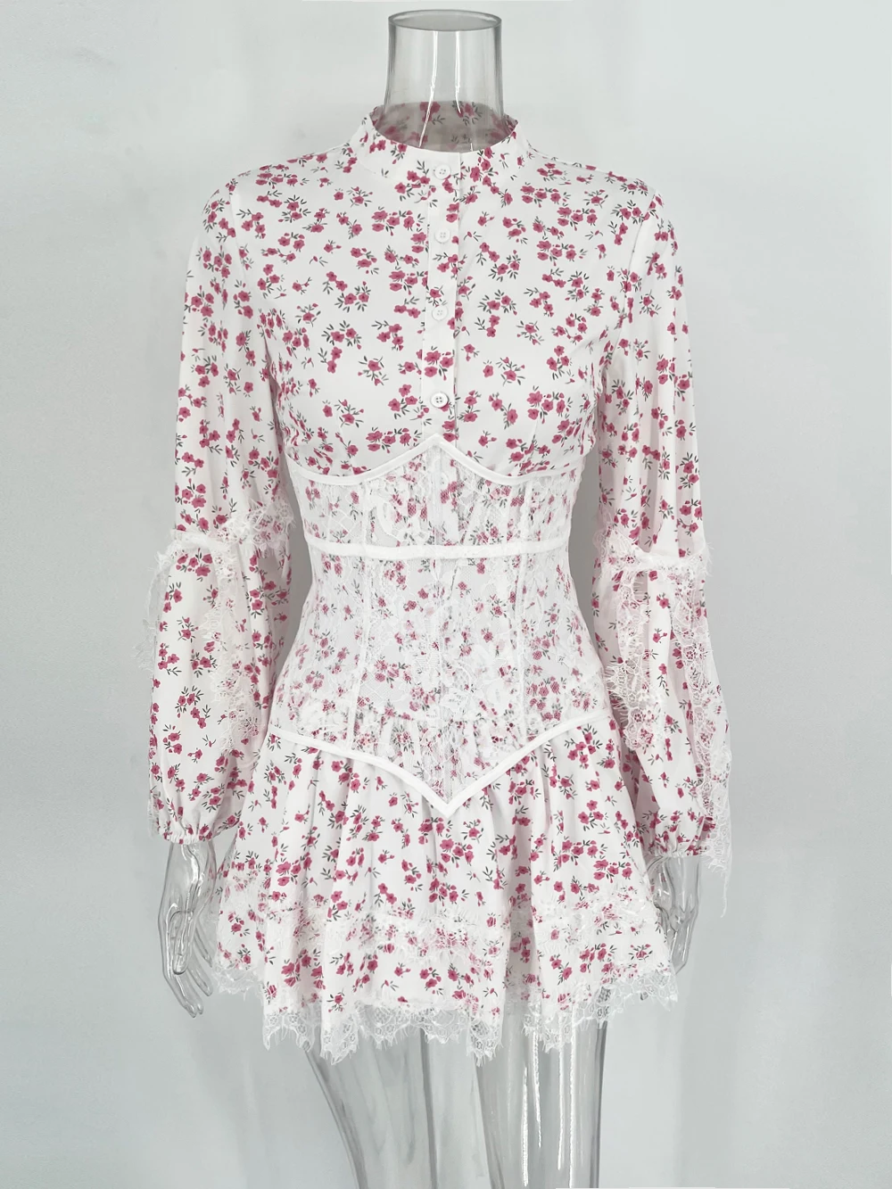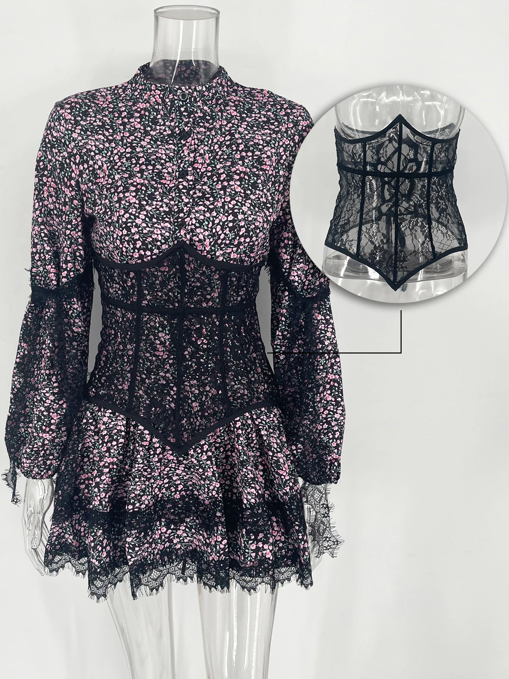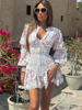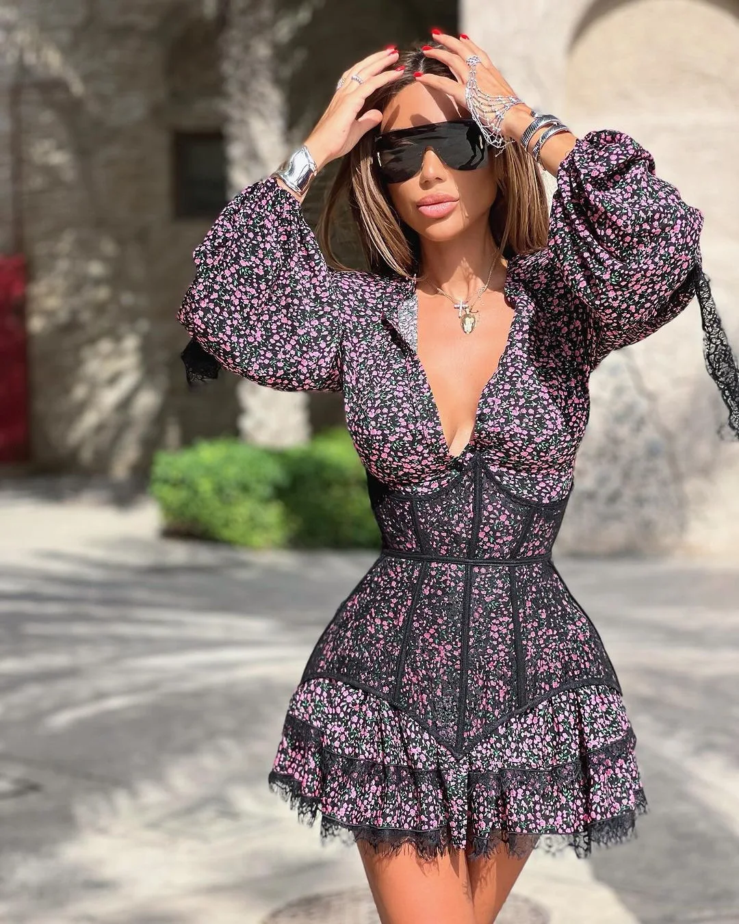 Fleepmart V-Neck Printed Lace Ruffled High Waist Slim Bandage Summer Short Luxury Party Women’s Mini Dress