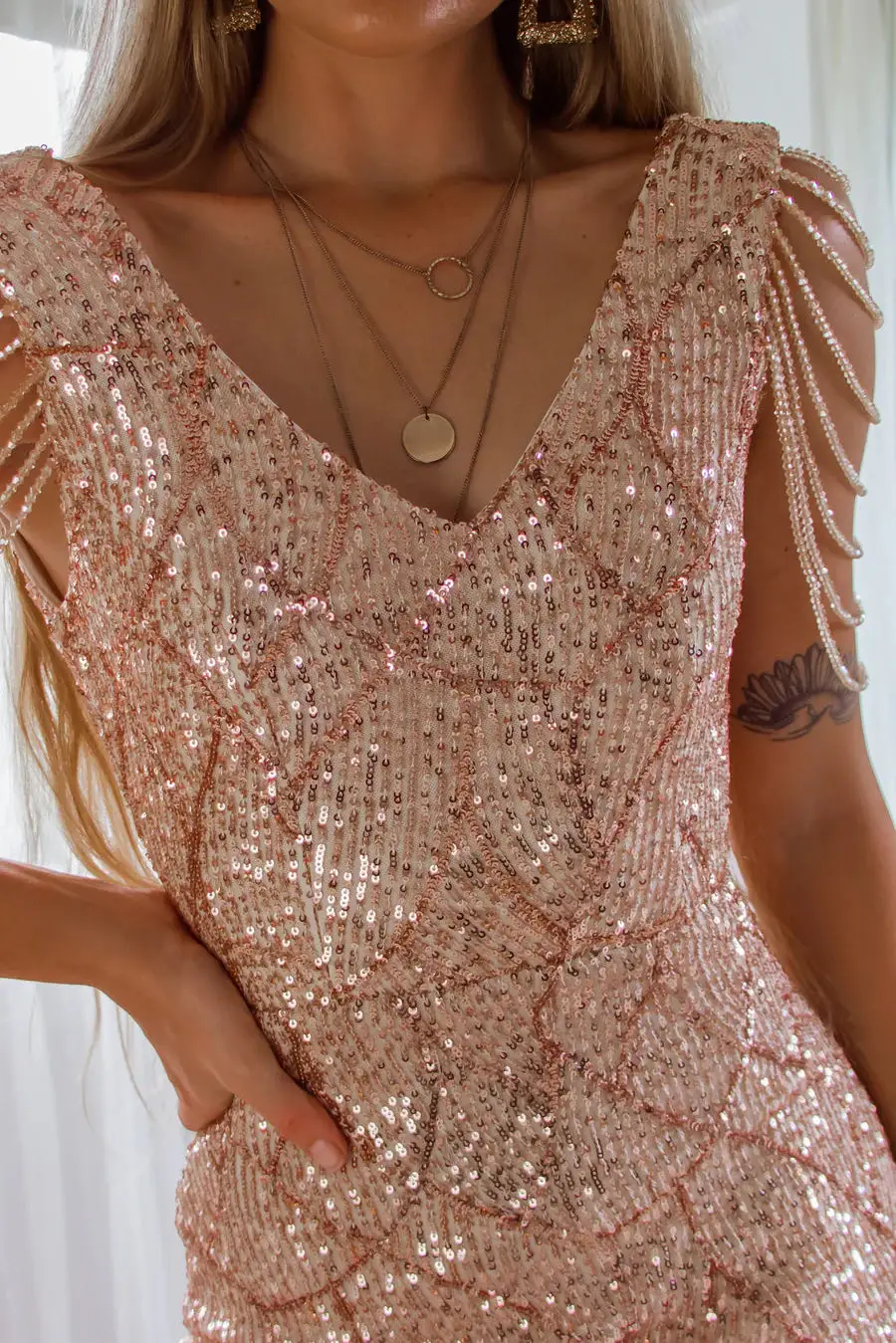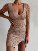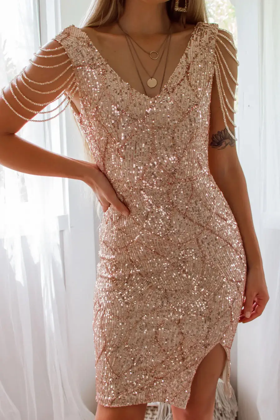 Fleepmart V Neck Short Gold Sequin Party Bodycon Dress Women Sexy Beading Evening Prom Dress 2023 New